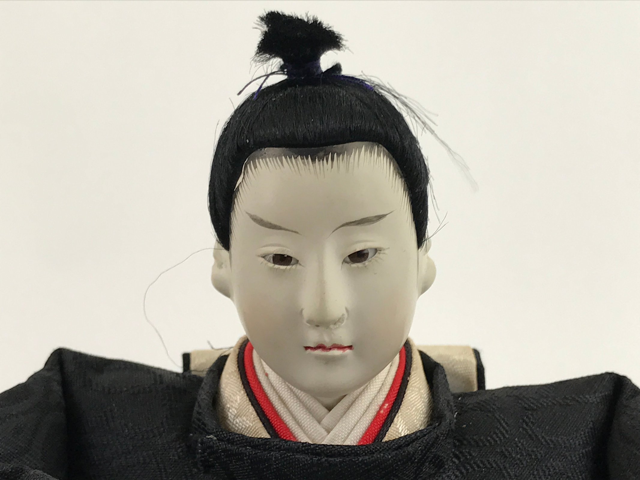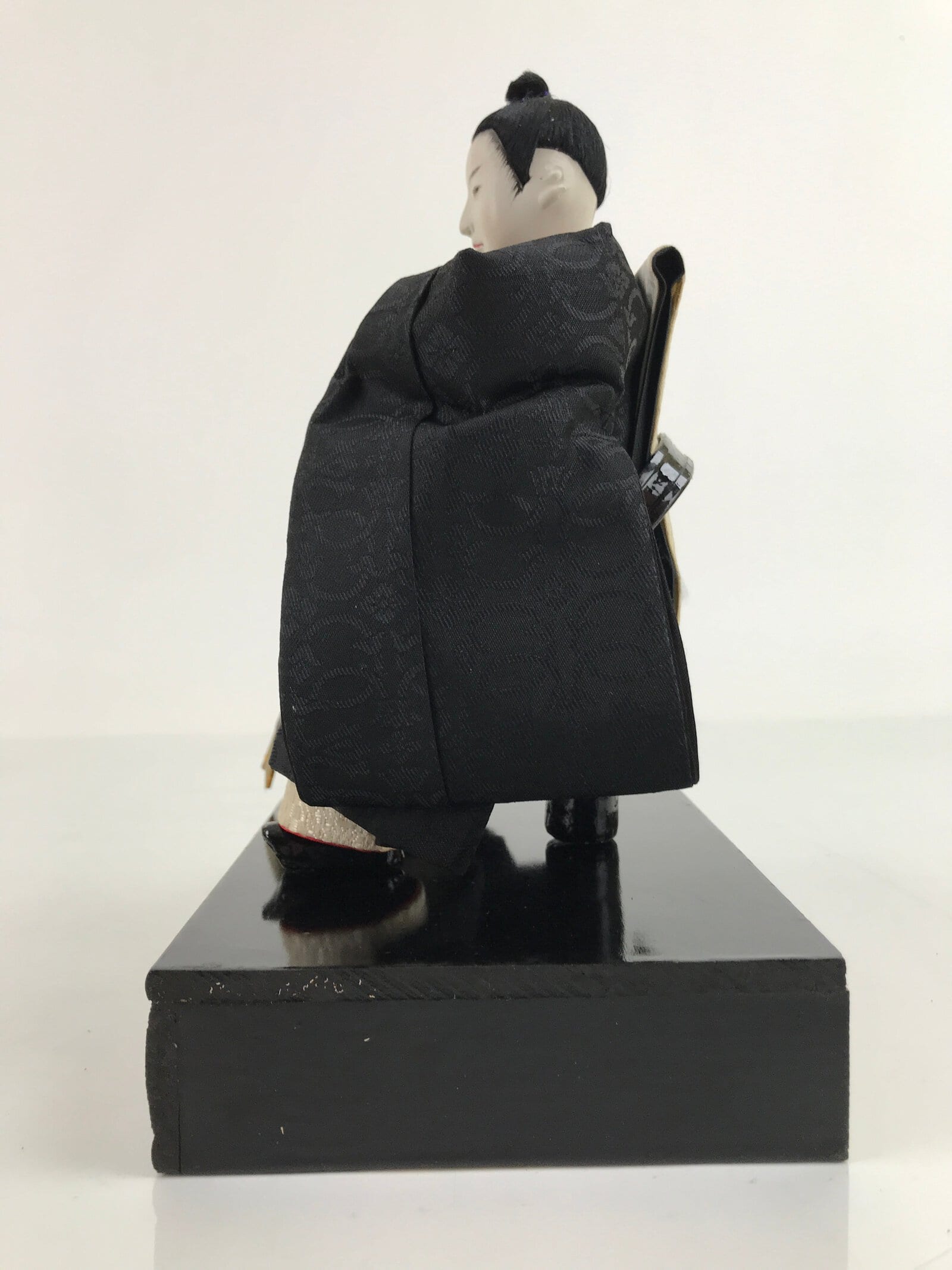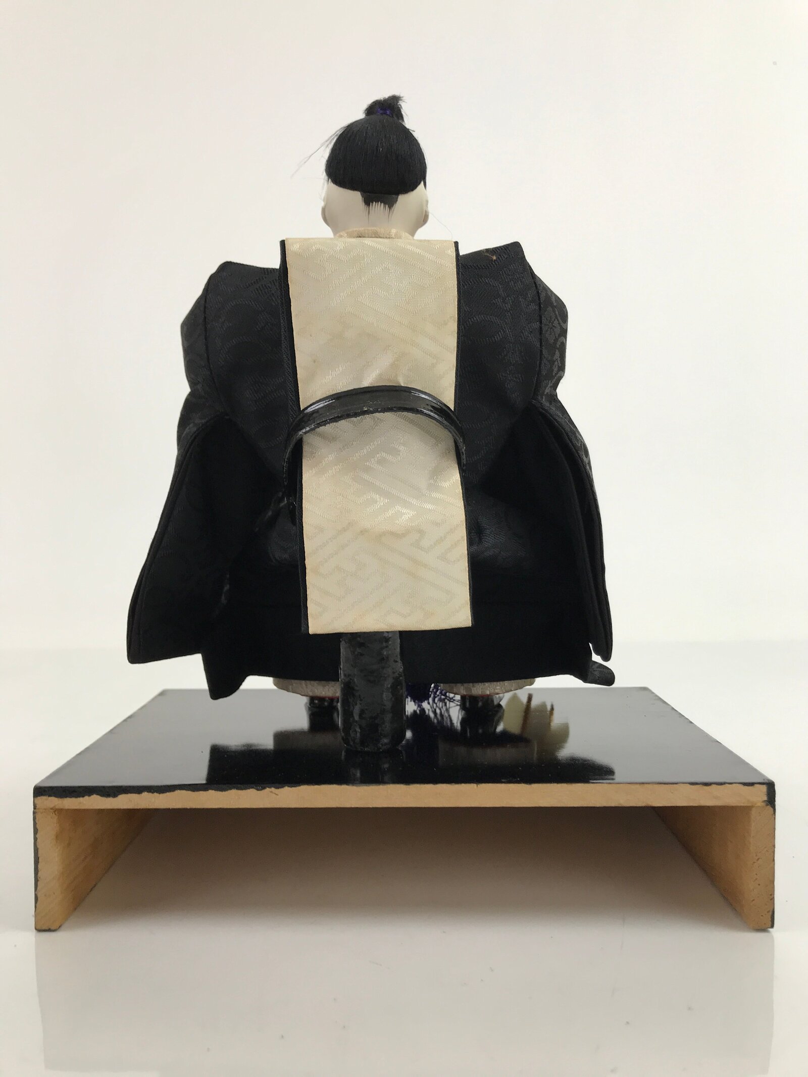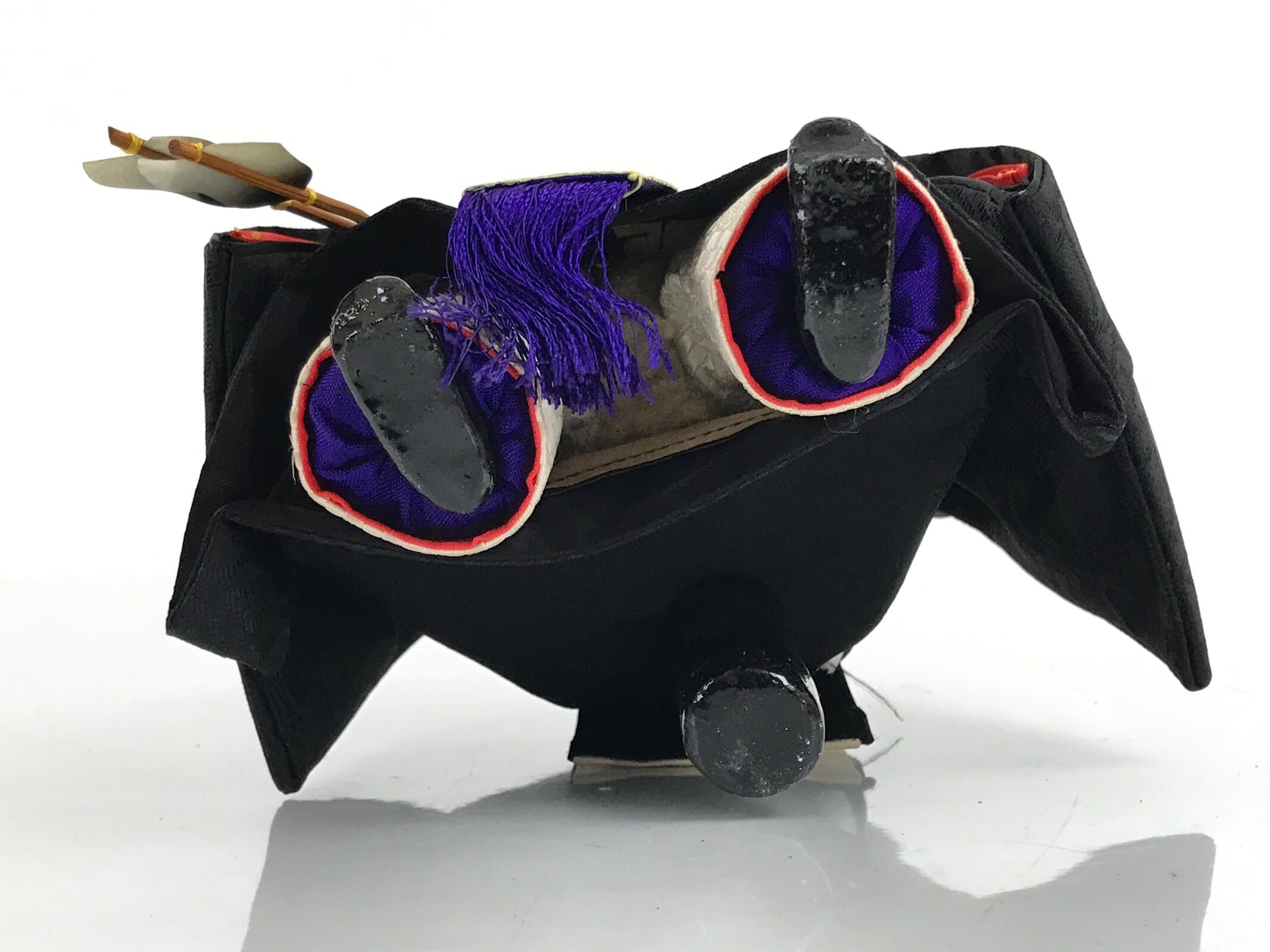 This vintage Japanese wooden guard doll wears a gorgeous black kimono coat and holds two arrows in one of his hands. This is a quality hina doll made of silk and wood and the head is removable as it was handcrafted separately from the body with a wood base and gofun, a white chalk commonly used in crafting doll faces made from the shells of oysters, clams, etc. This doll stands on a wooden lacquered stand decorated with maki-e art on the front. This elegant doll is an excellent addition to any hina set of doll collection.