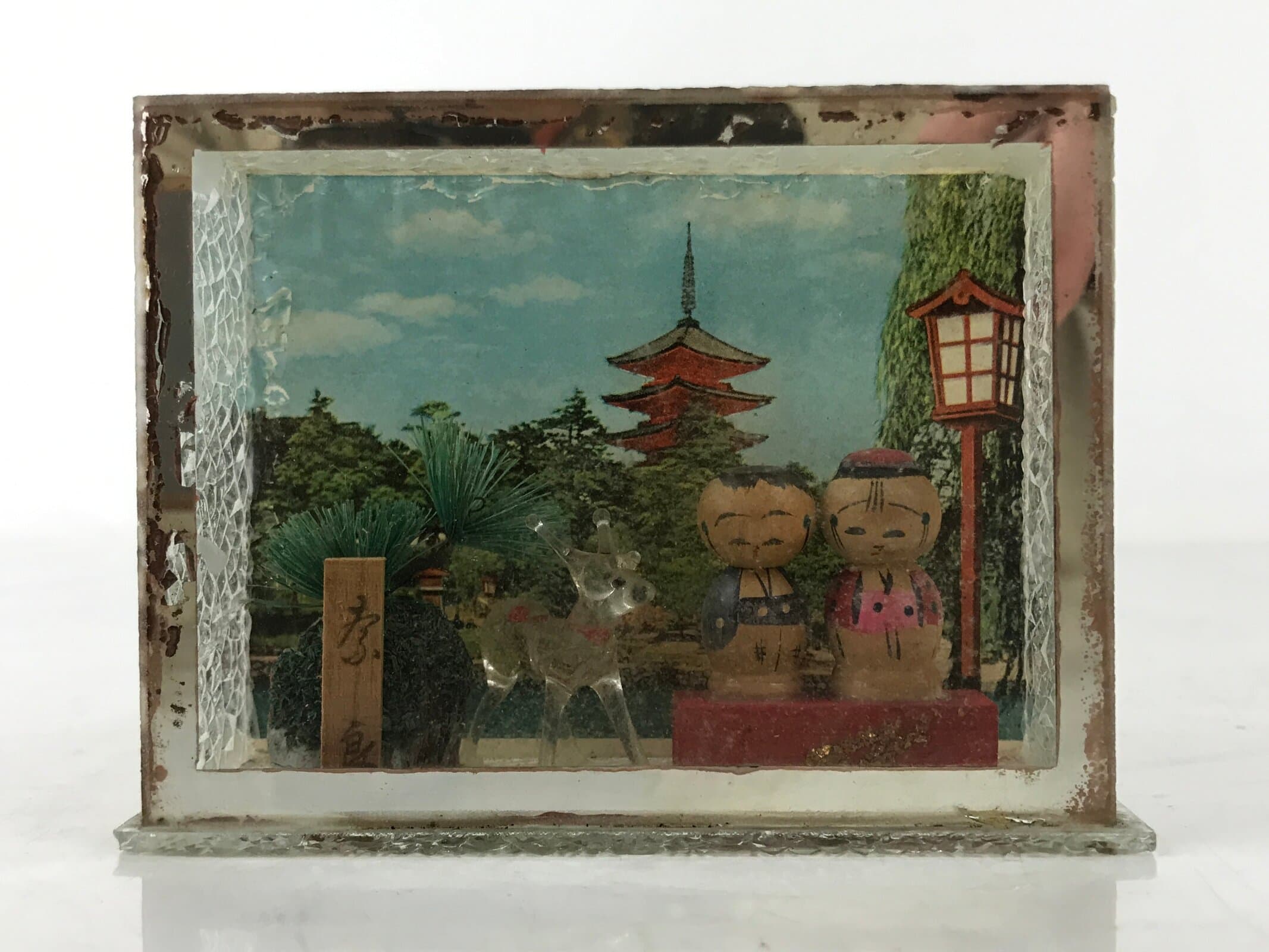 This vintage Japanese glass display case features a deer, a matsu pine tree, a couple in Kimono, a pagoda, and a lantern. This item is a souvenir from Nara, famous for its temples and deer. The orange-spotted transparent deer is made of glass, it is called garasu zaiku in Japanese. The figurines are displayed in a glass case, which you cannot open. The front panel is transparent, and the back panel has a printed pagoda and lantern.