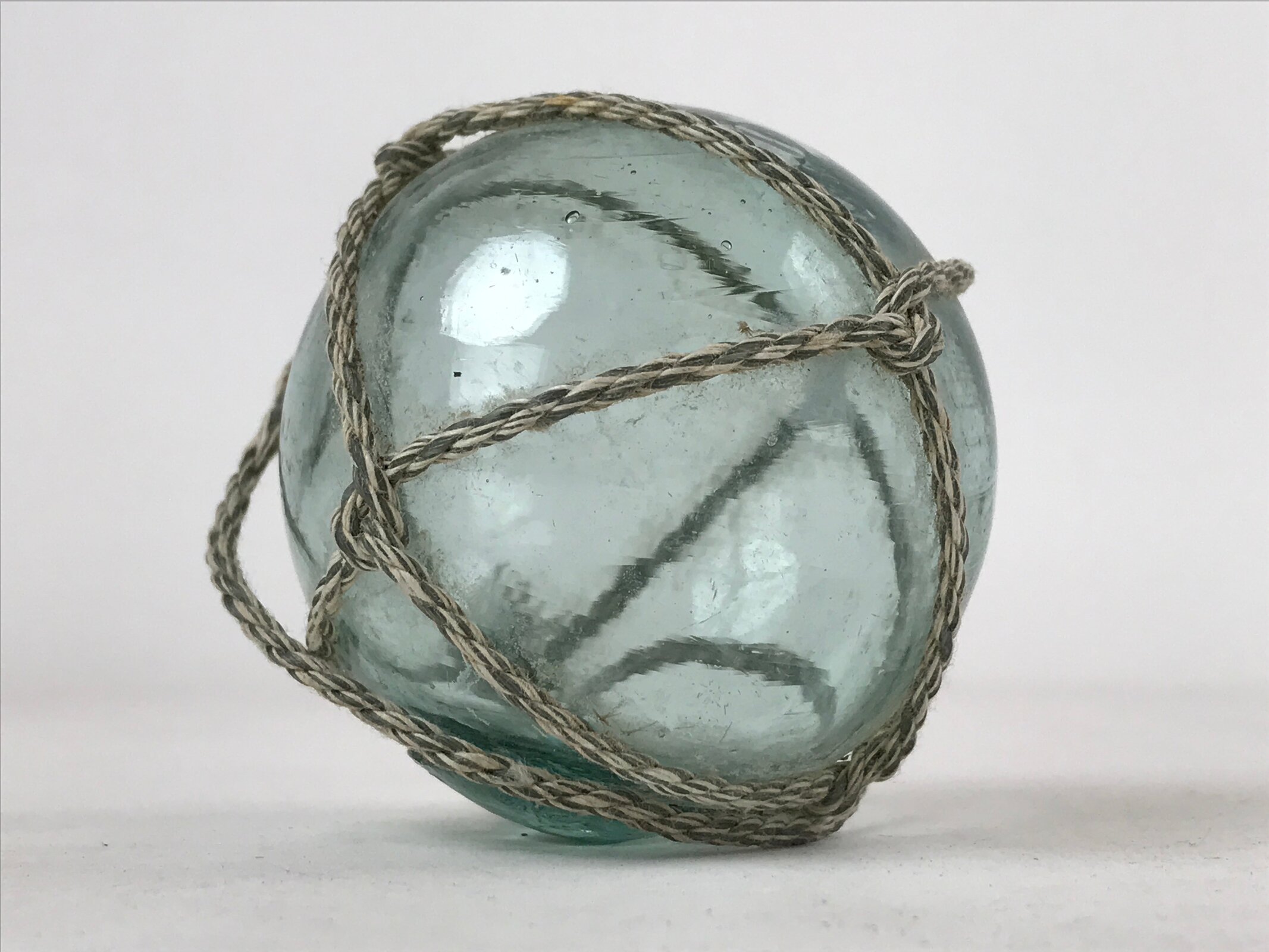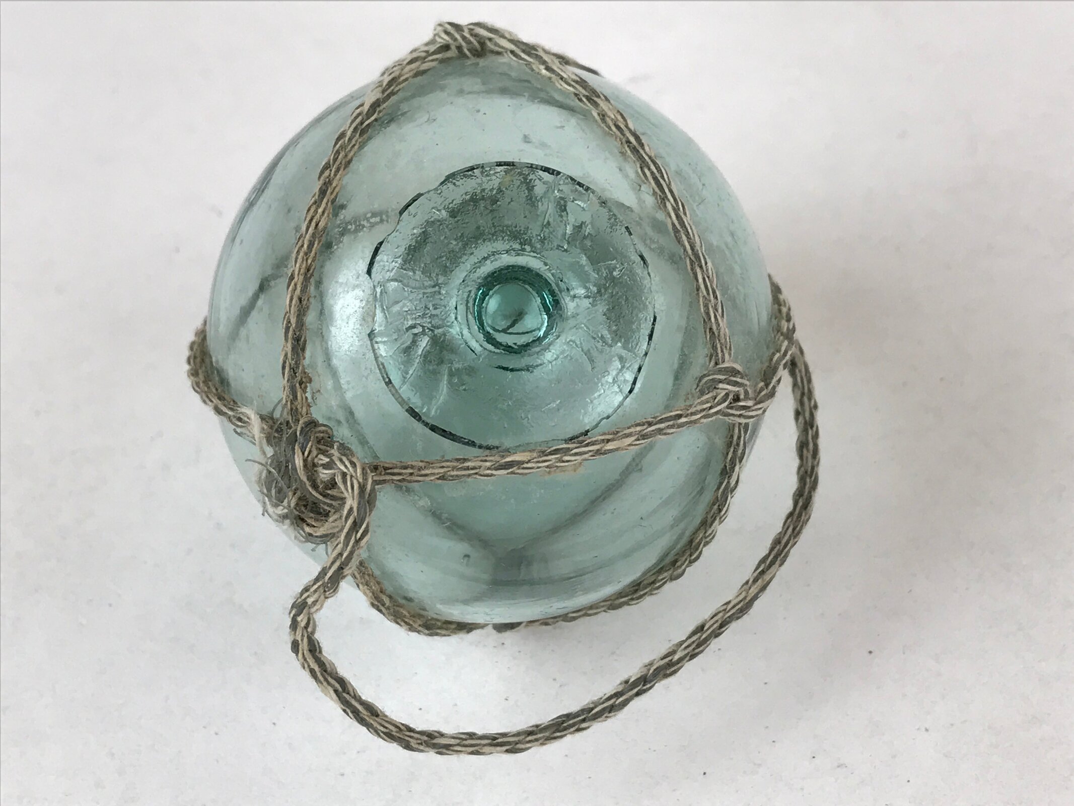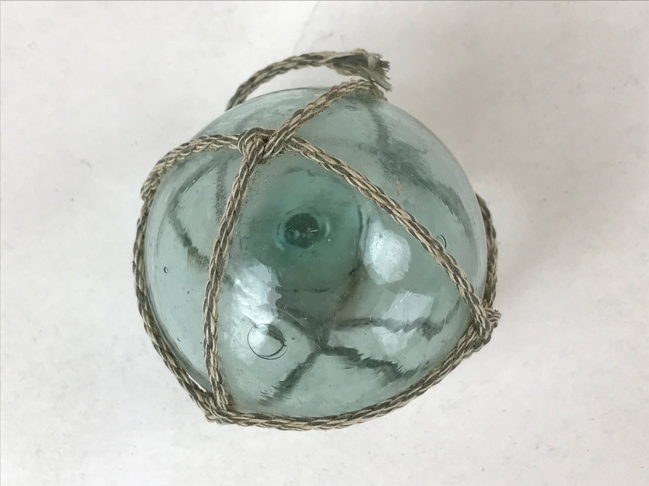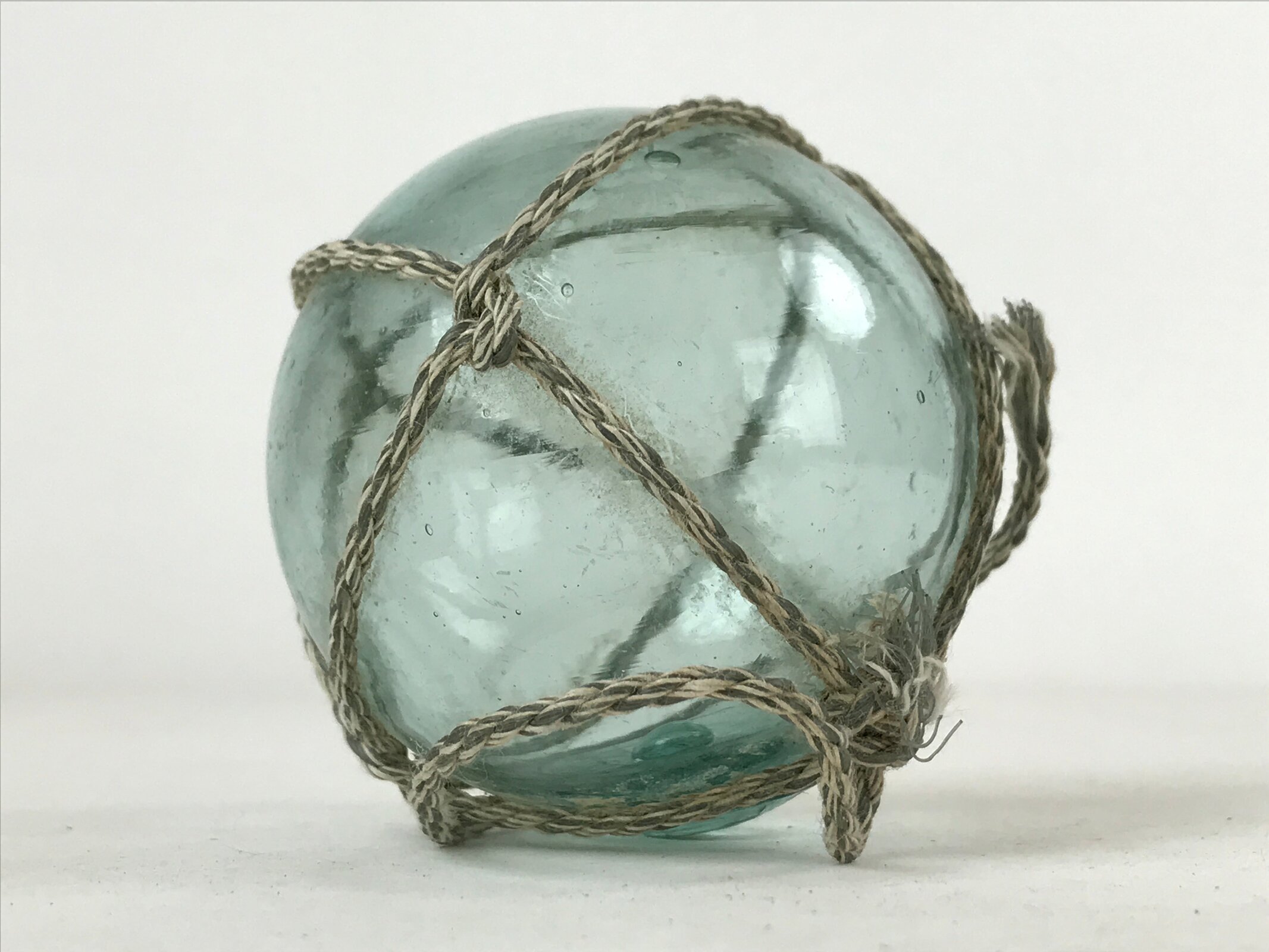 This small float is a clear blue color with natural bubbles and ripples from the glass-blowing process. It has a thick nub on the bottom where the ball was sealed before cooling. This ukidama is also secured in a white and gray rope net.