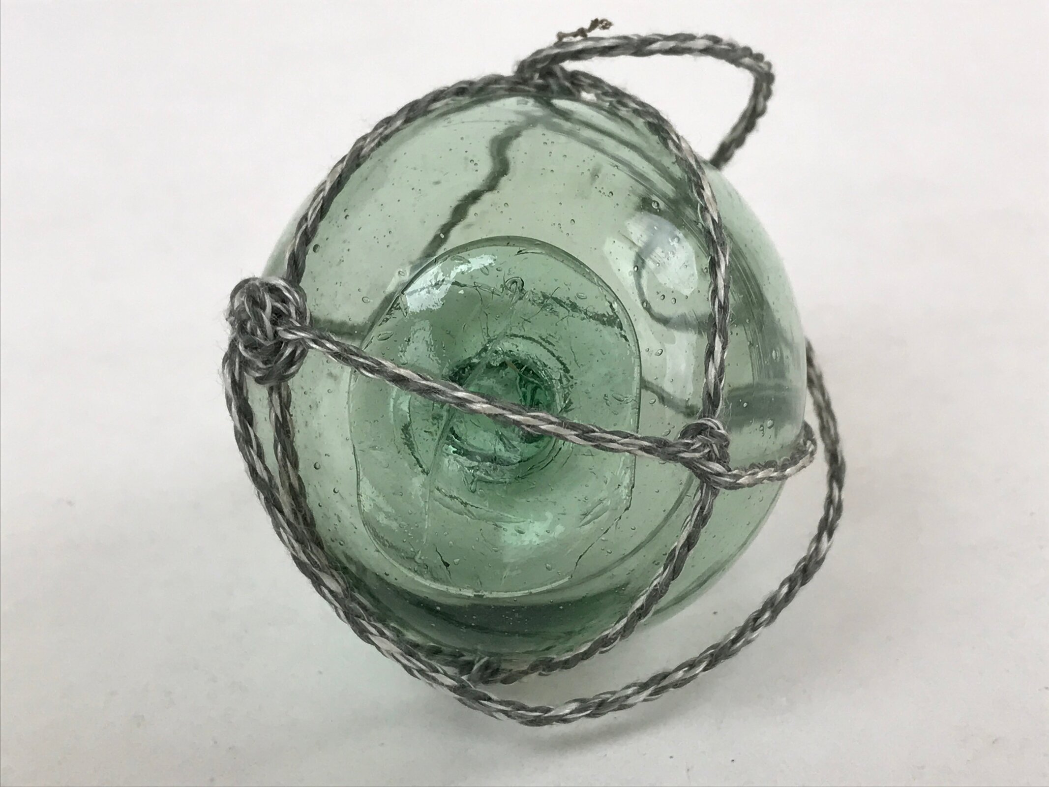 This small float is a clear blue color with natural bubbles and ripples from the glass-blowing process. It has a thick nub on the bottom where the ball was sealed before cooling. This ukidama is also secured in a white and gray rope net.