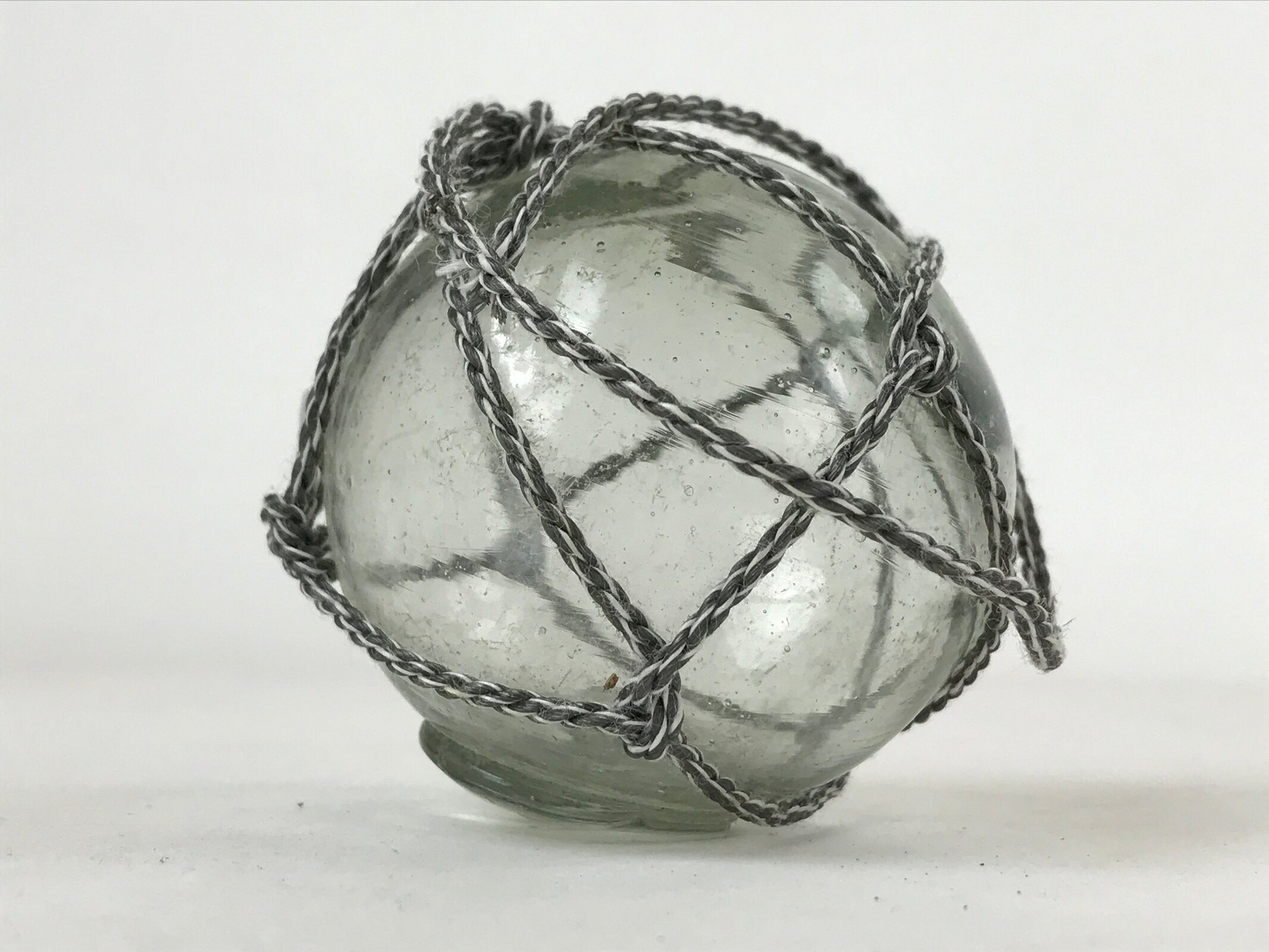 This small float is a clear blue color with natural bubbles and ripples from the glass-blowing process. It has a thick nub on the bottom where the ball was sealed before cooling. This ukidama is also secured in a white and gray rope net.