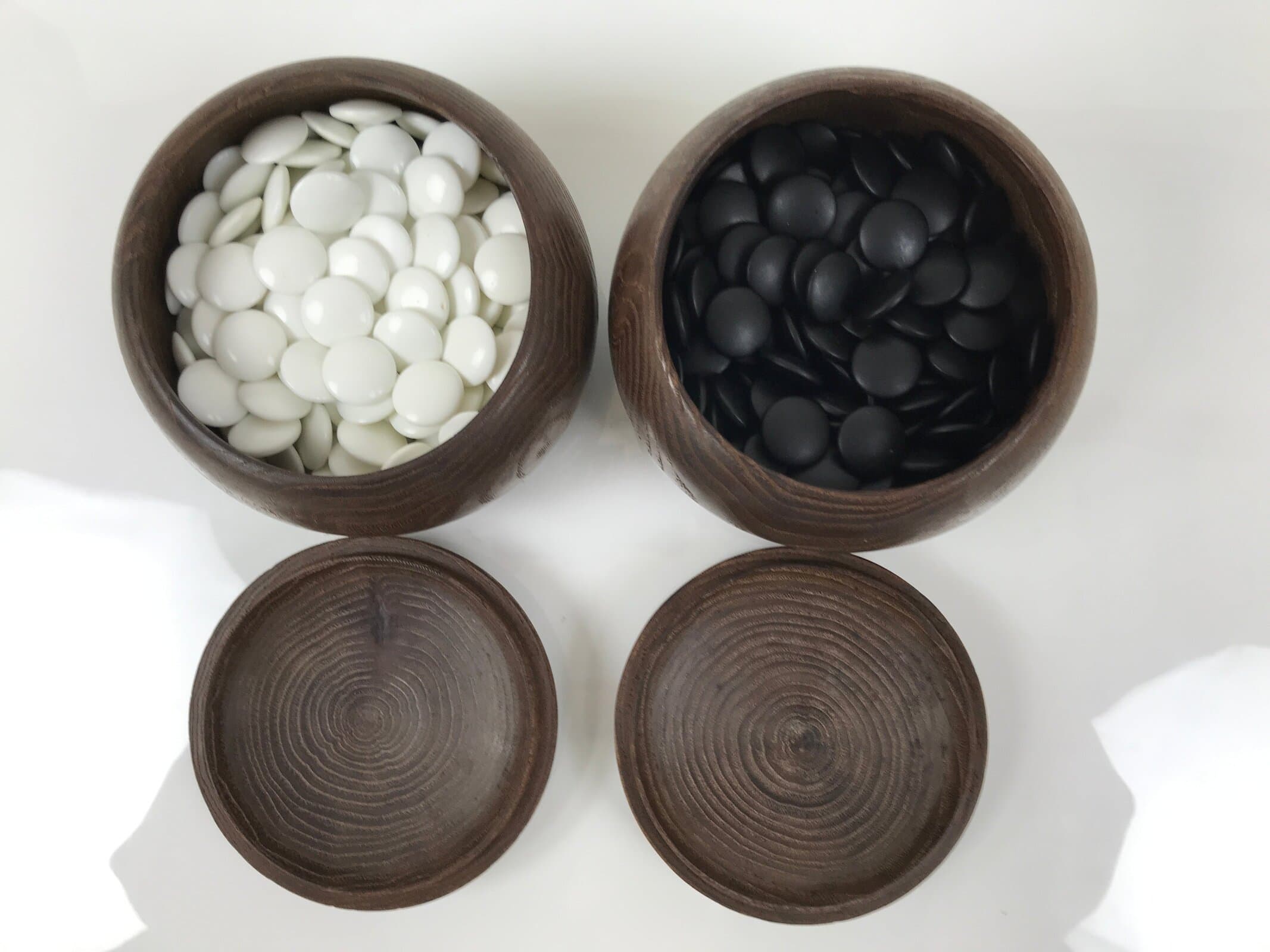 This is a vintage goishi, or go stone, set used to play the popular strategy board game Igo, or Go. This beautiful set of game pieces made from black and white glass is contained in lidded dark brown wooden bowls for easy, decorative storage.