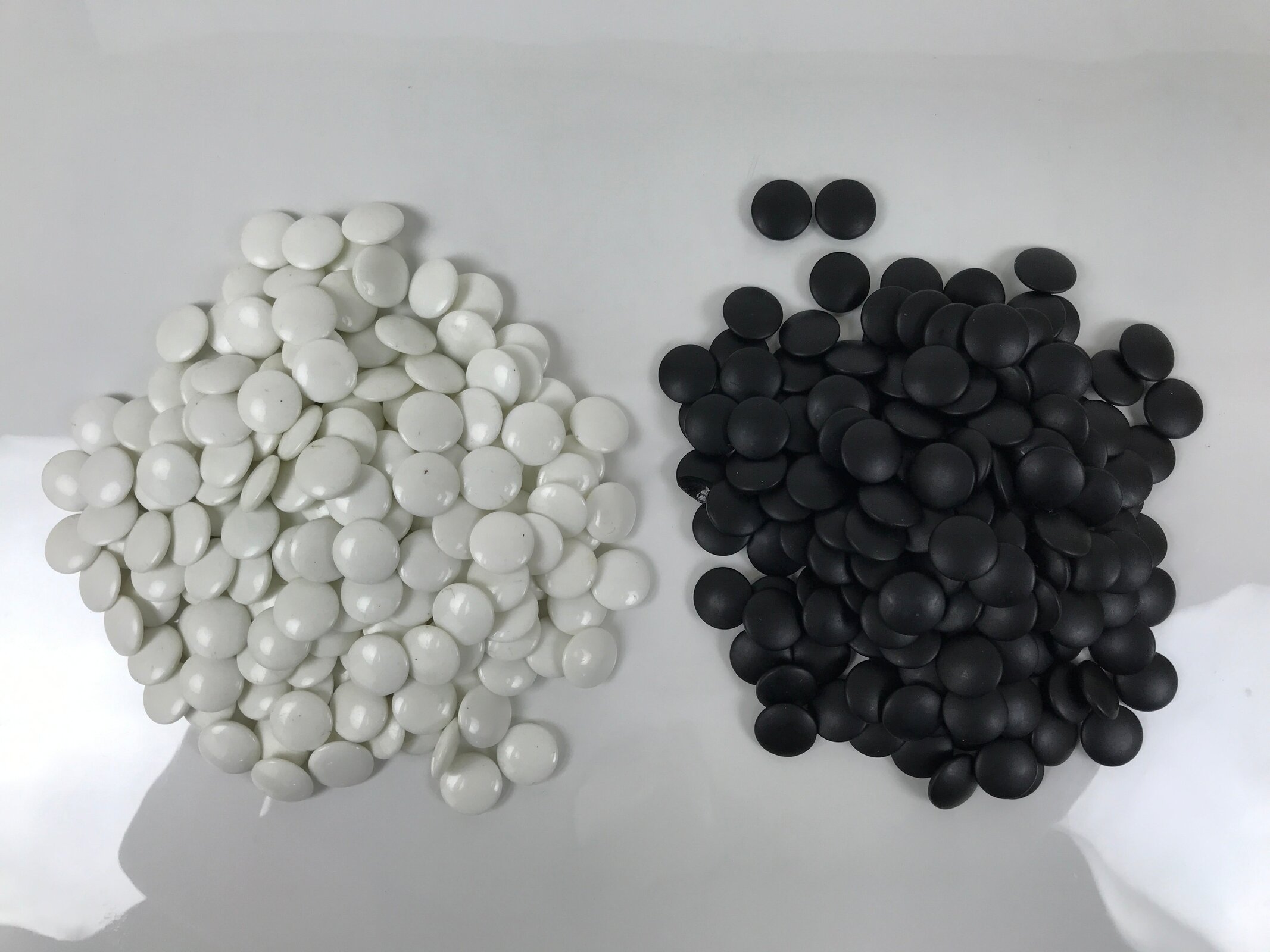 Black and white stones are used as game pieces by two players. By placing the stones on the intersections of lines on a go board, the goal of the game is to section off a larger portion of the board as the other player.