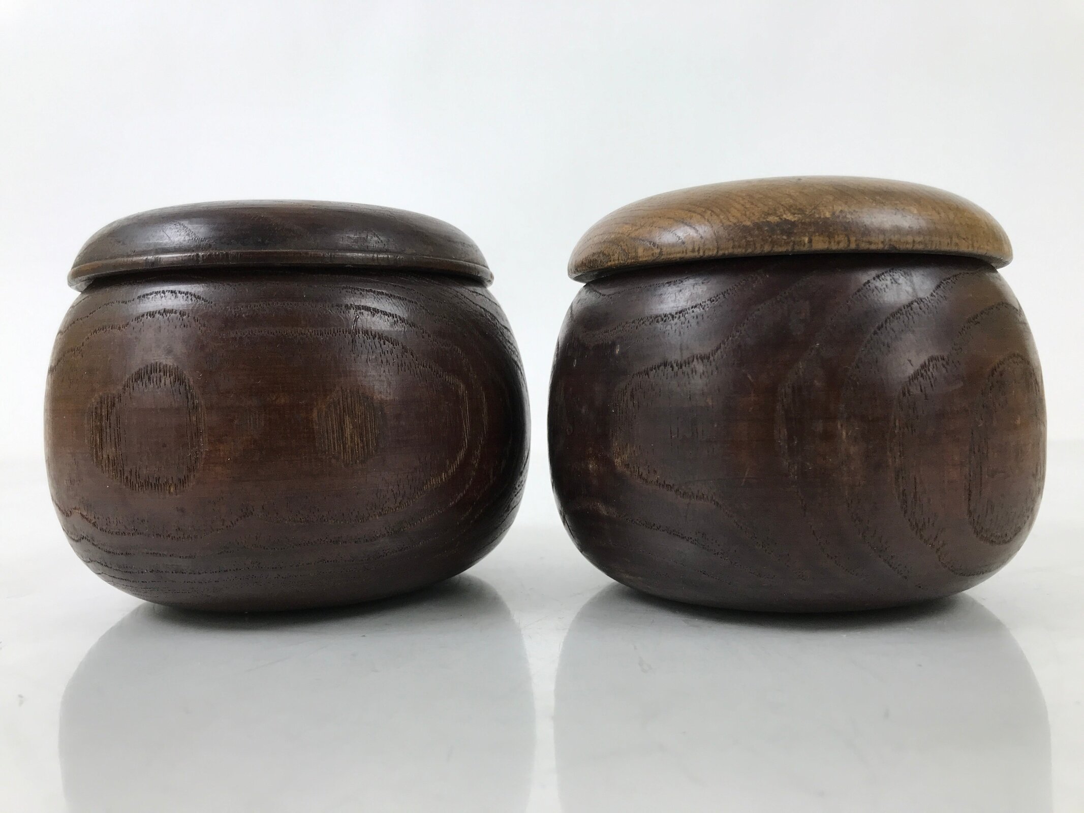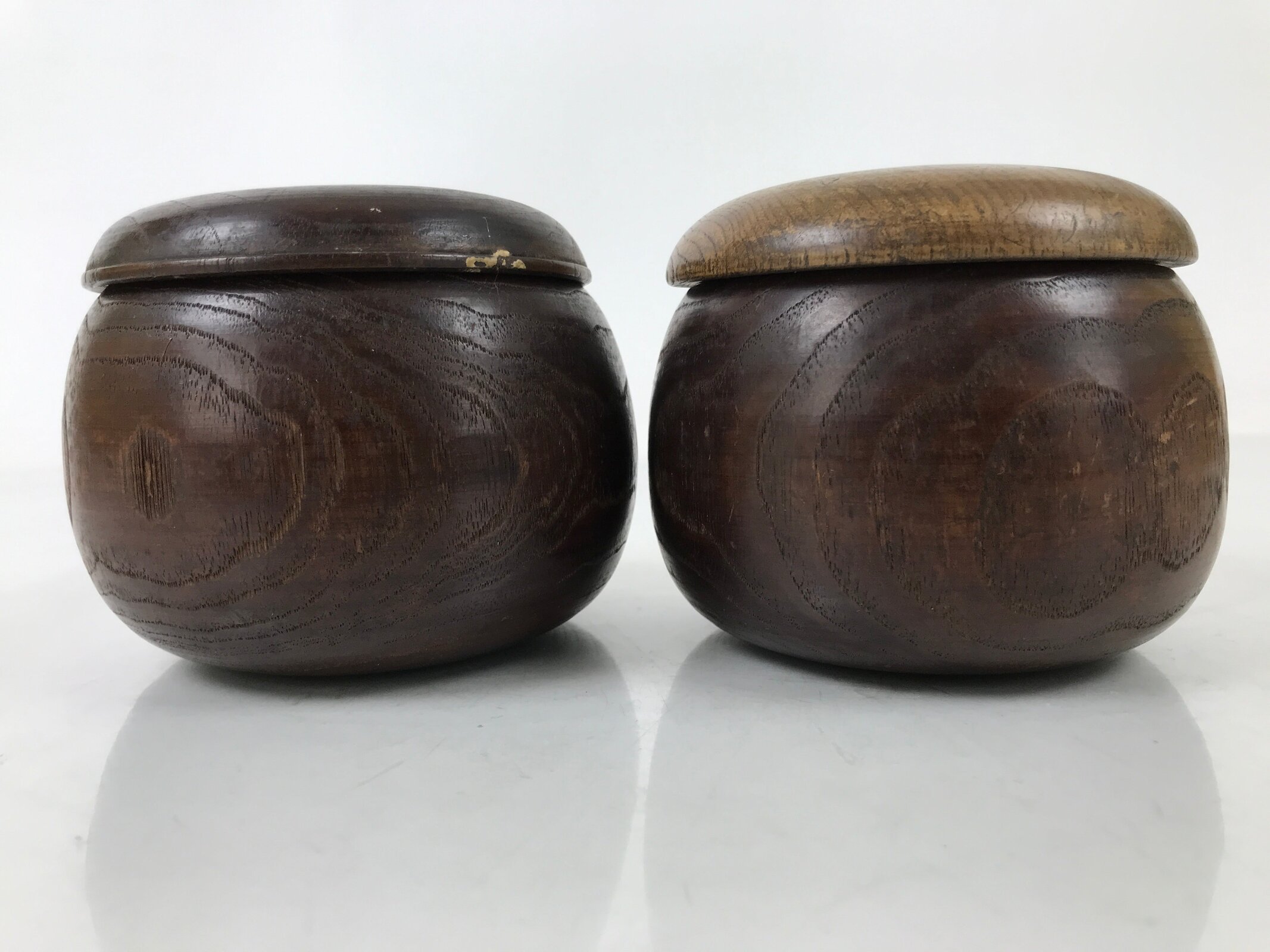This is a vintage goishi, or go stone, set used to play the popular strategy board game Igo, or Go. This beautiful set of game pieces made from black stone and white glass is contained in lidded dark brown wooden bowls for easy, decorative storage.