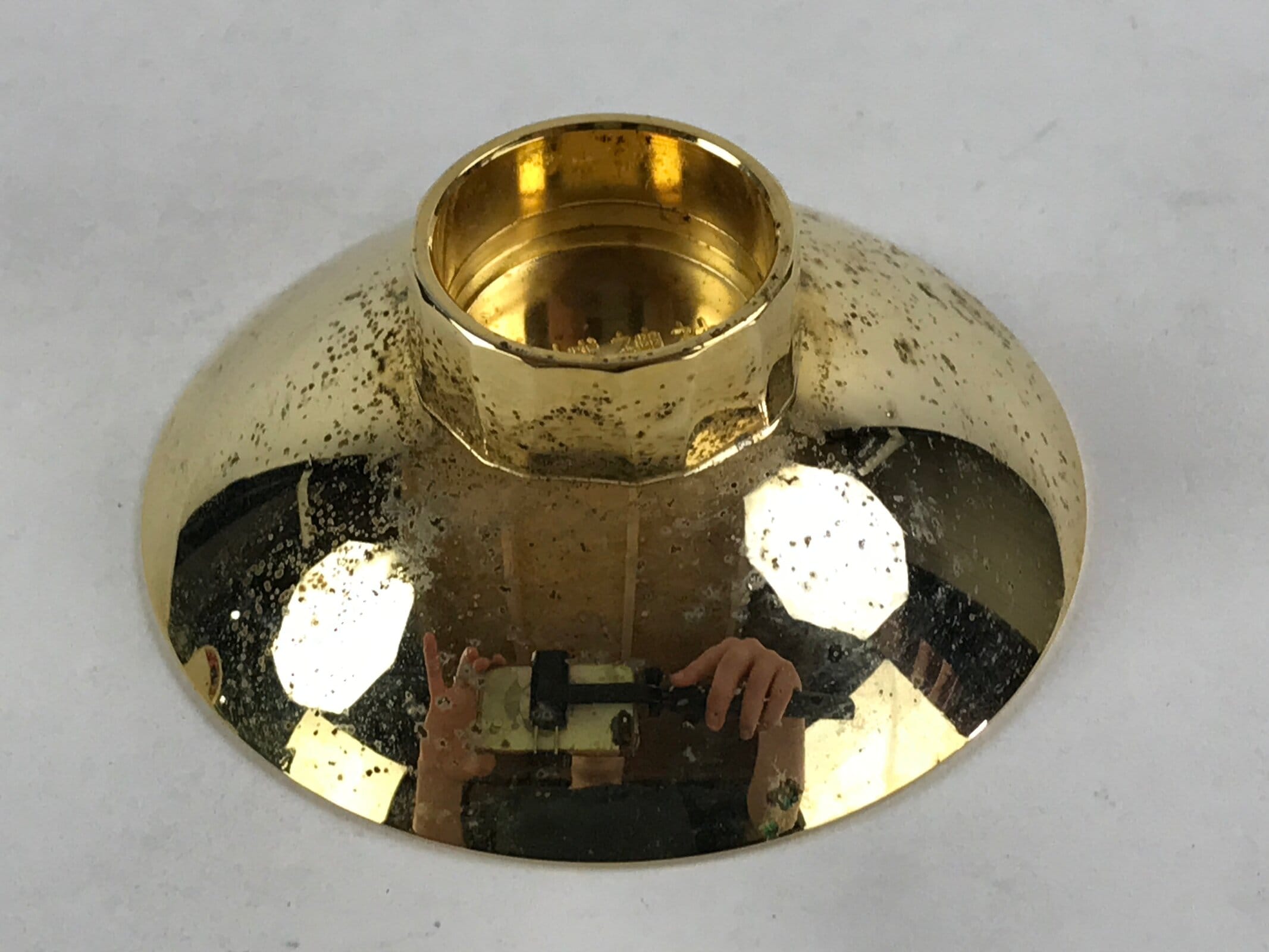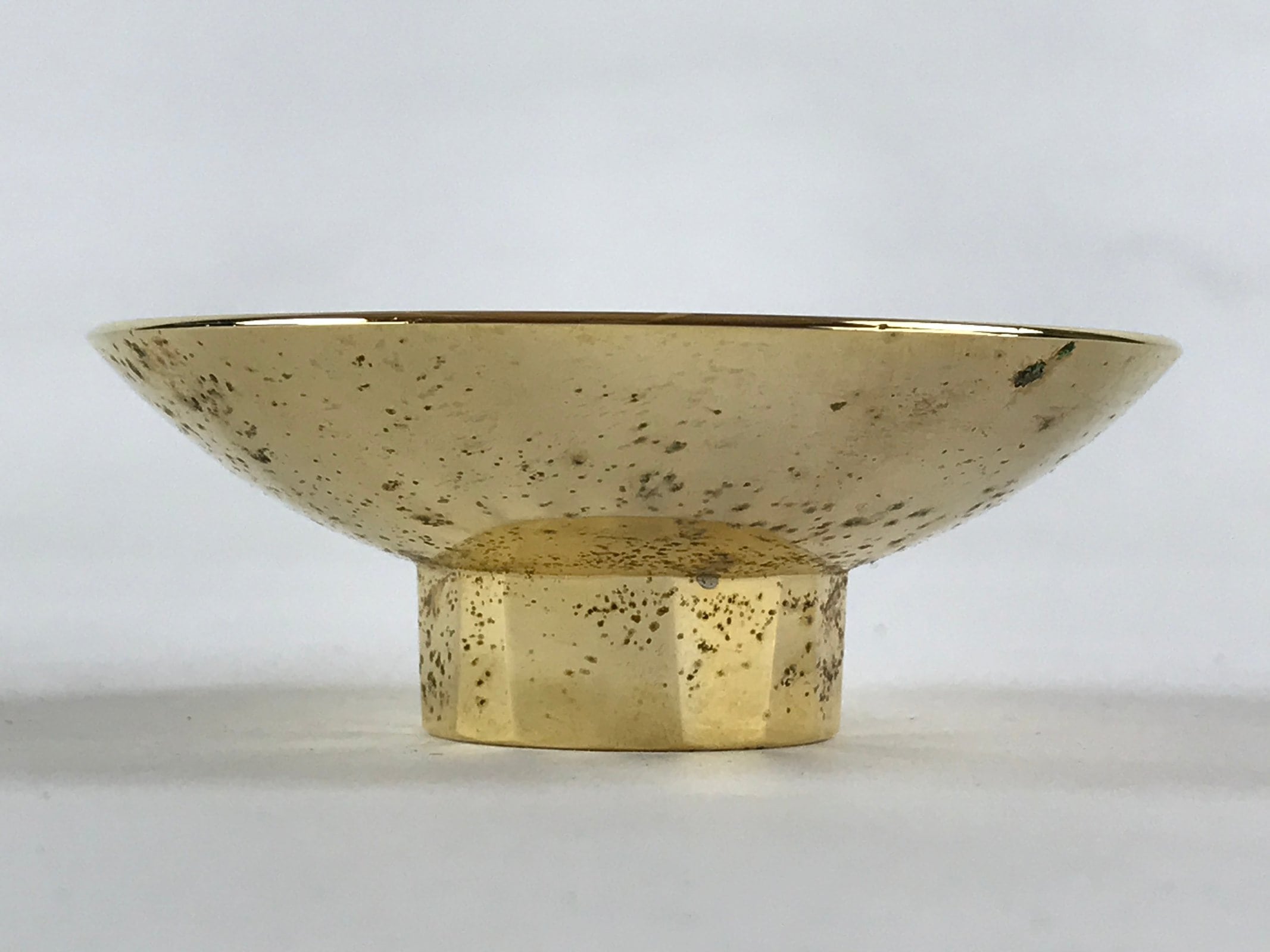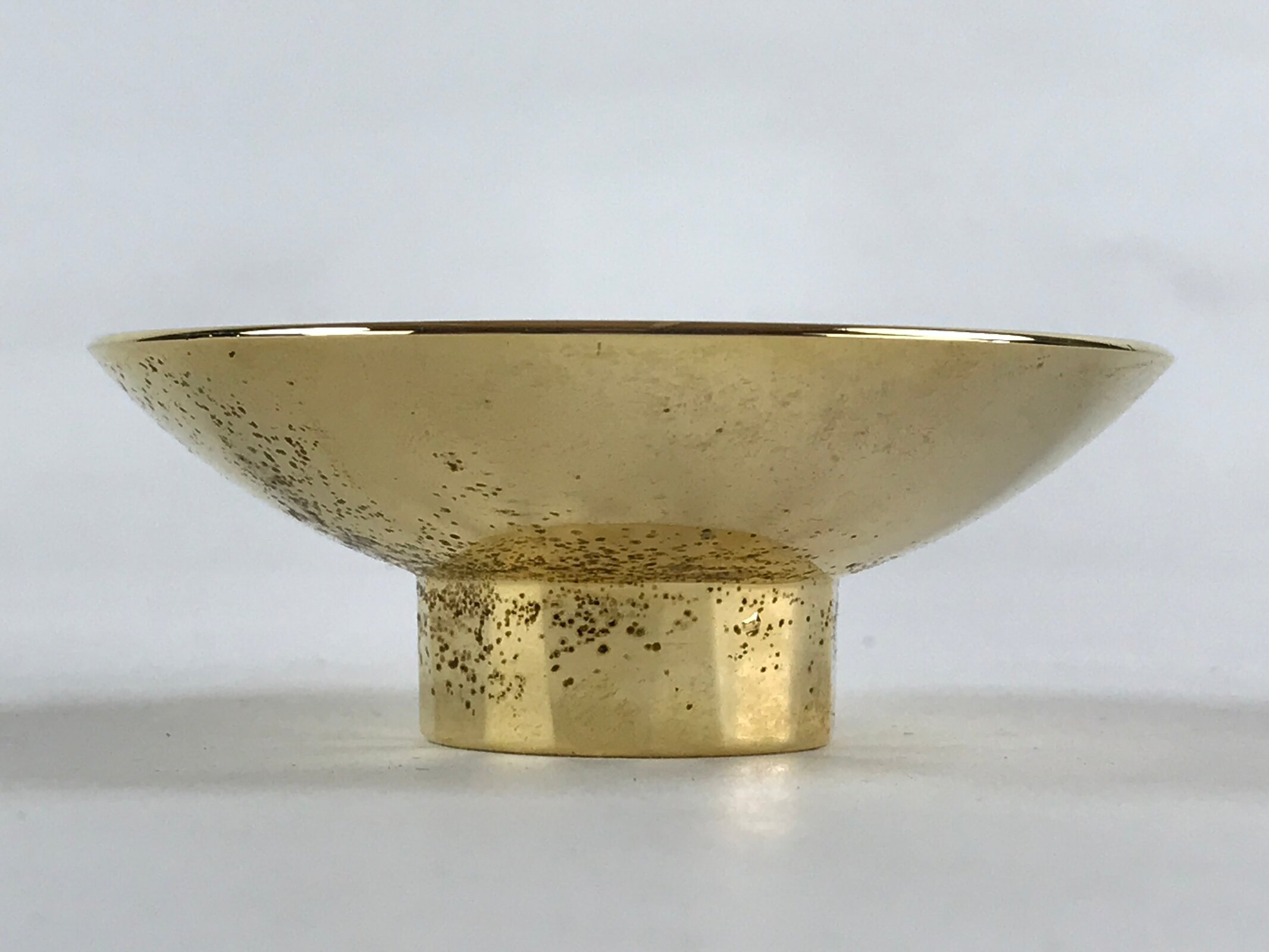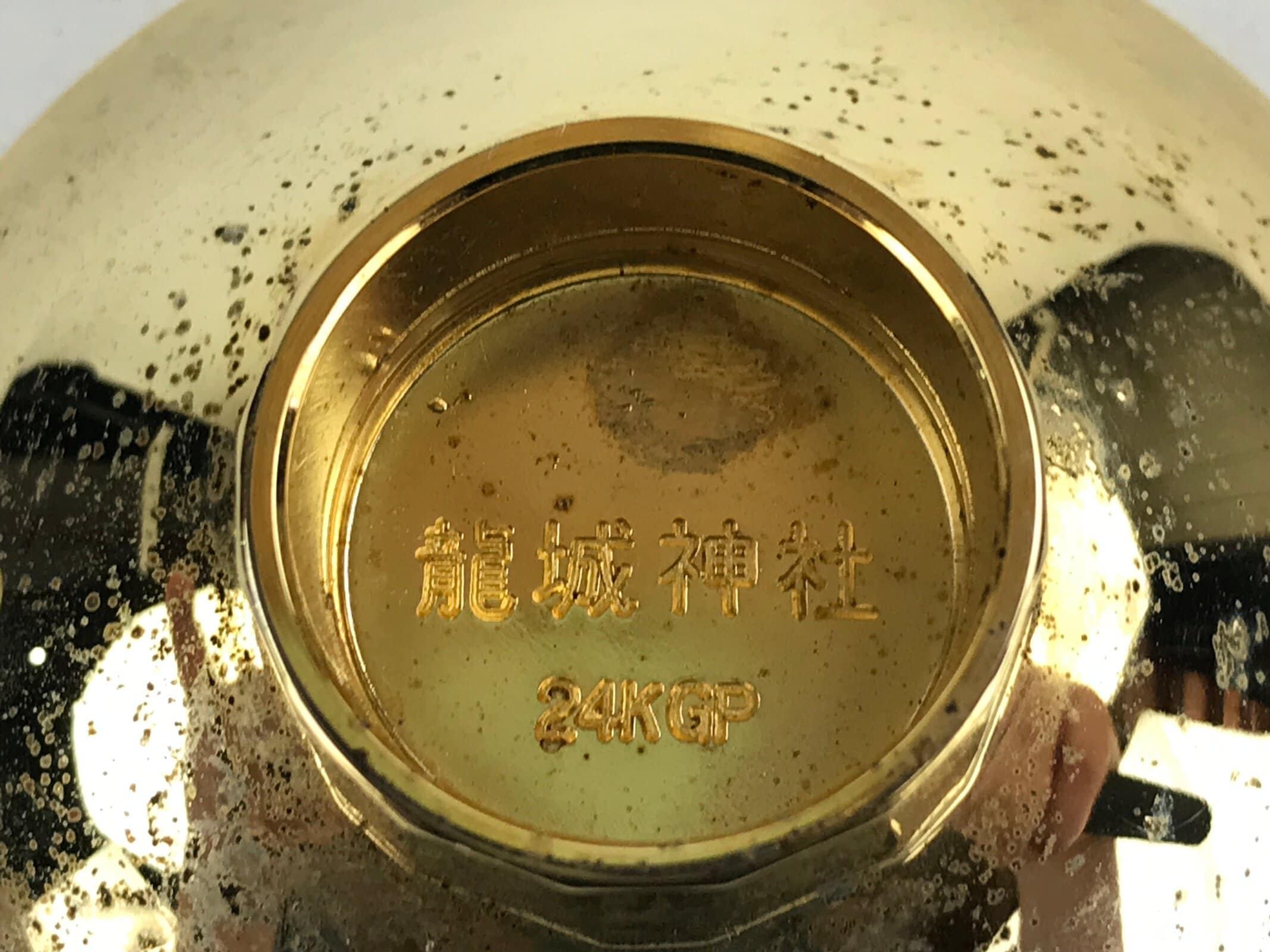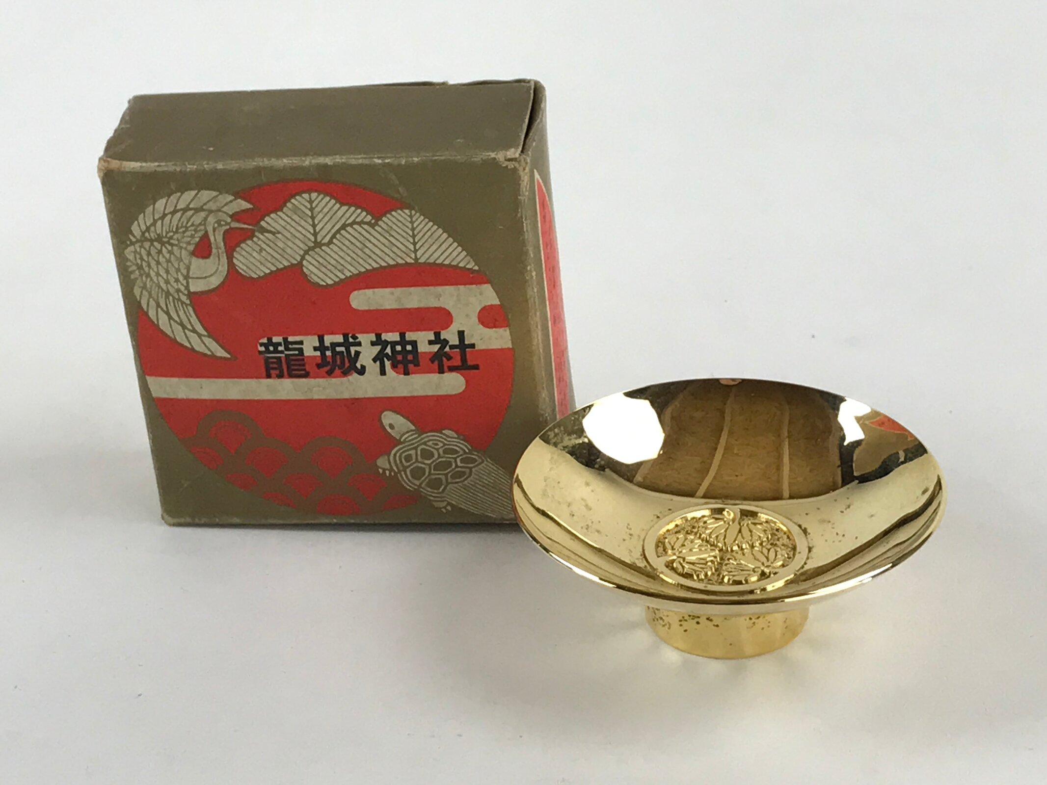 This is a Japanese golden sake cup, Sakazuki. Sakazuki is a sake cup used when drinking Japanese sake. This is gold, and inside the cup is the crest of Aoi. It is the crest of Tokugawa, the old samurai general of Japan. On the back of the cup is written Tatsuki Shrine 24K GP.