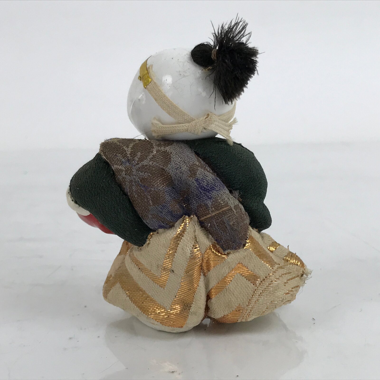 This vintage Japanese gosho ningyo figurine represents a boy wearing a green, gold and beige hakama and holding a red object. This figurine is most likely of wood and papier mache, or hariko, and decorated with pieces of fabric, paper and threads for the hair.