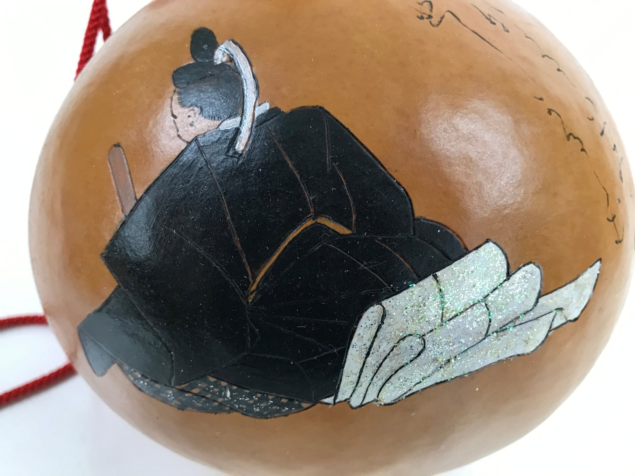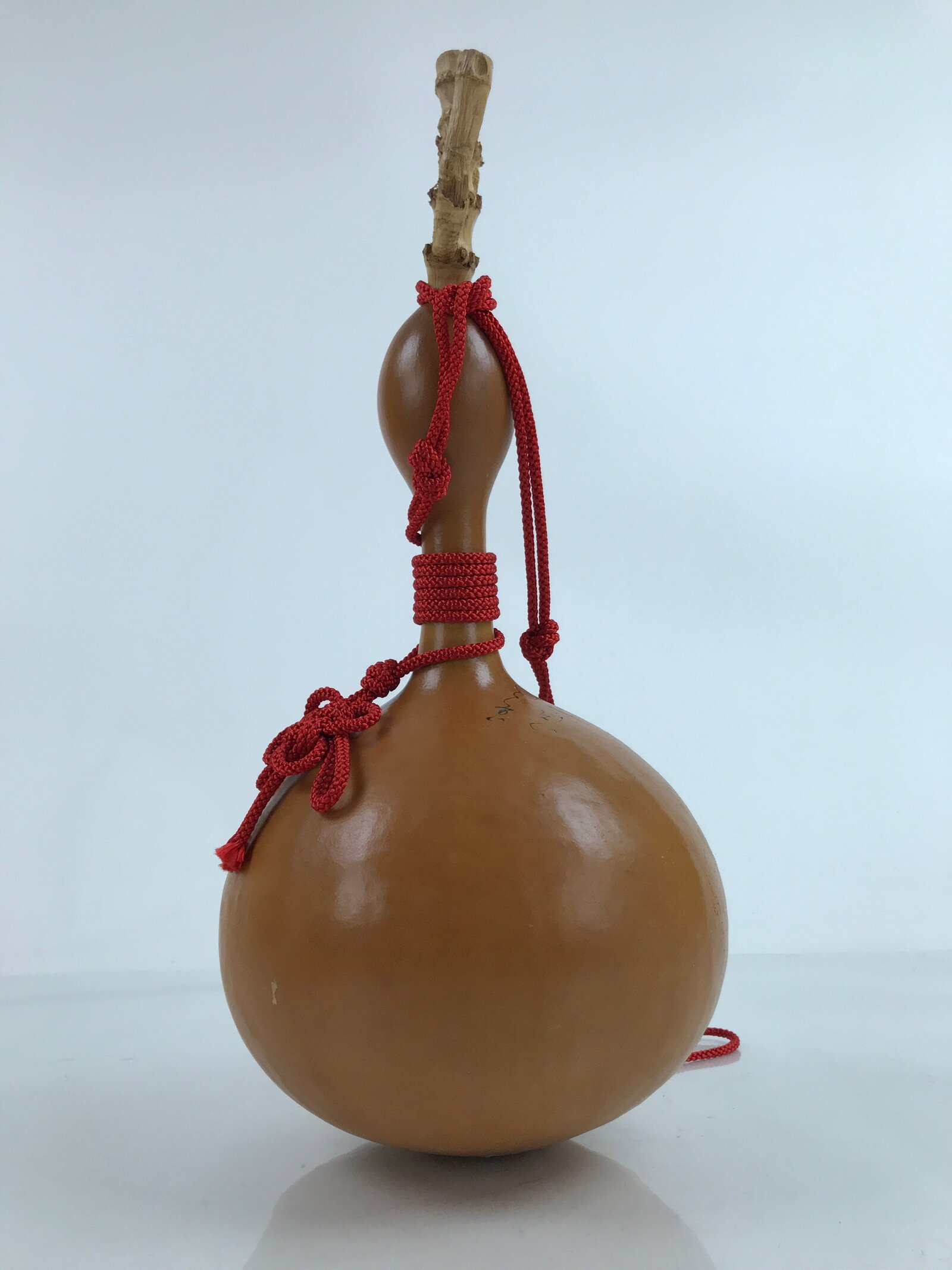 This Japanese naturally dried hyotan gourd was not only made for storing and carrying sake and seeds but also as a good luck charm for display. It features a natural brown color and rounded curvy shape. It has a braided red cord tied at the neck and at the mouth. This hyotan features a poem and an illustration of a man on one side. The cap (wood twig) is glued.