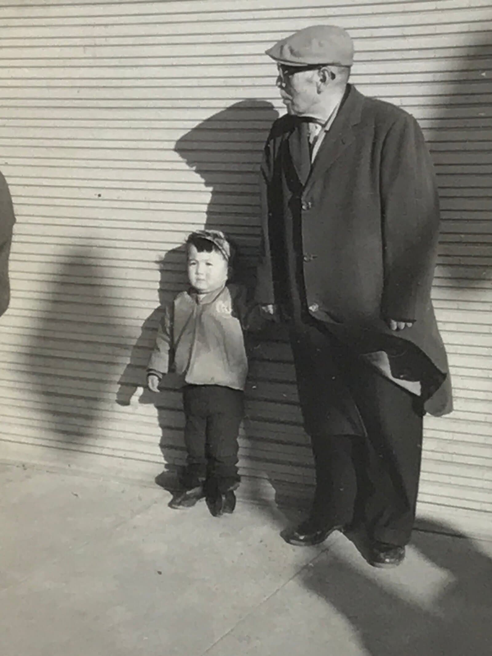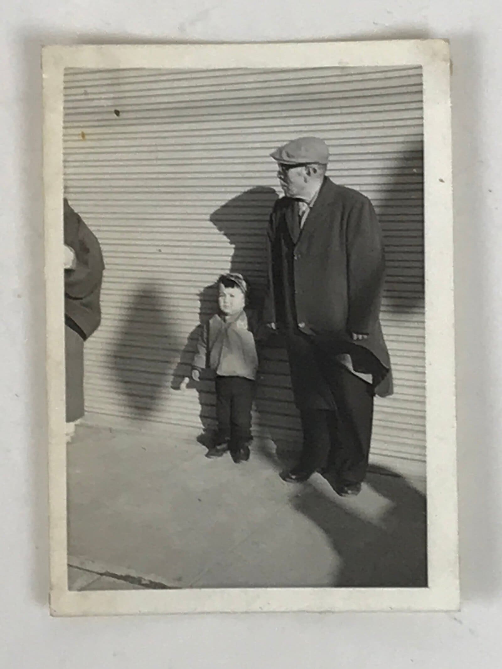 This is a Japanese vintage black and white photograph of a grandfather holding his very young grandson’s hand, waiting in front of a business shutter door. They are dressed for autumn.