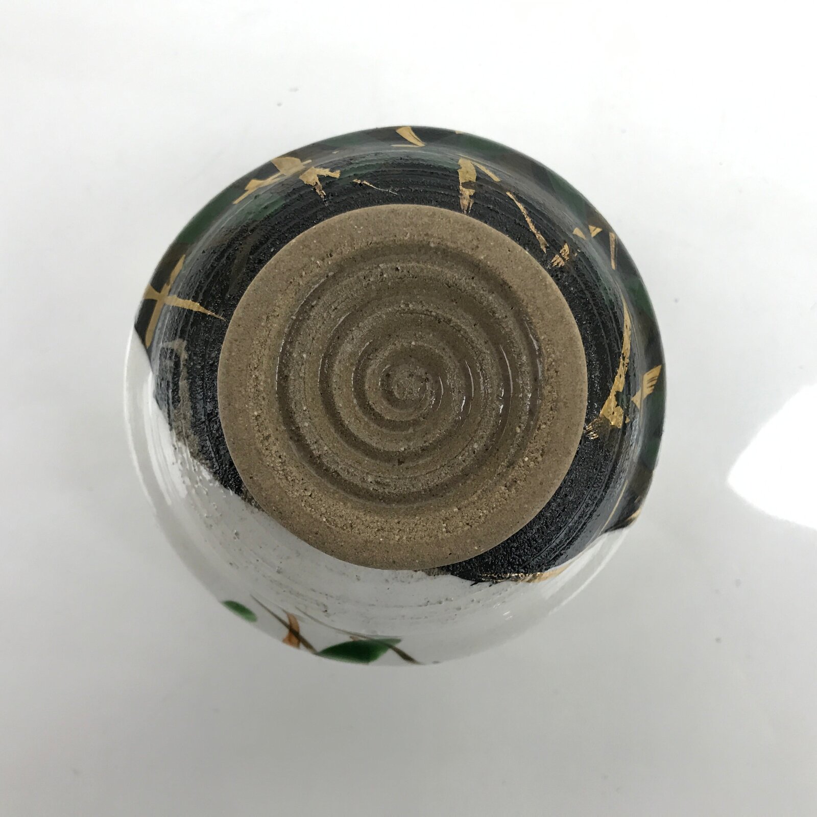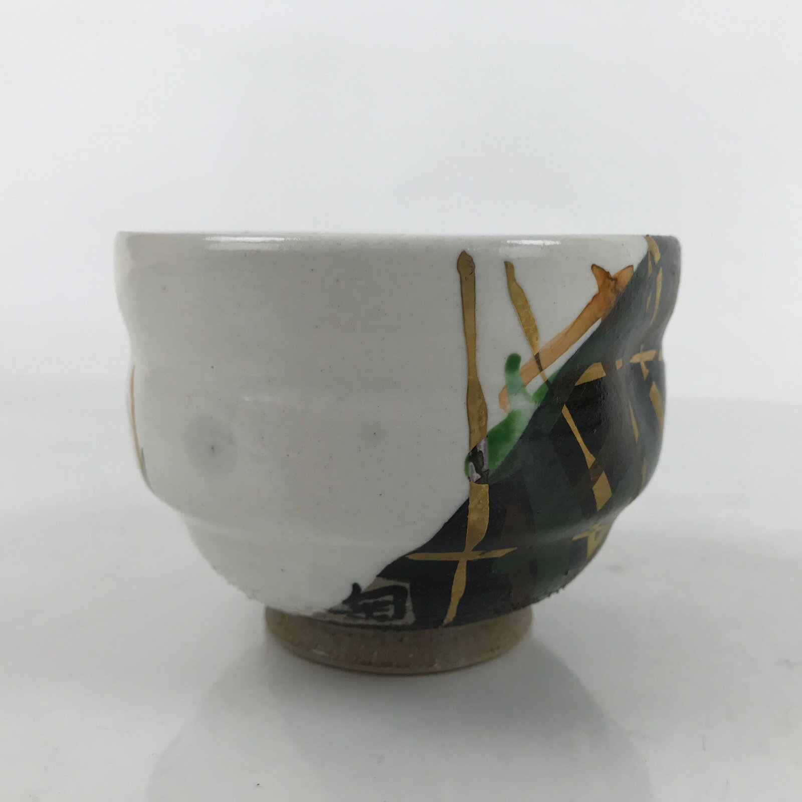 This is a vintage Japanese ceramic green tea bowl or matcha chawan. It is white and black and features bamboo leaves painted in green, brown and gold. It is signed on one side. It is light-weighted and easy to handle.
