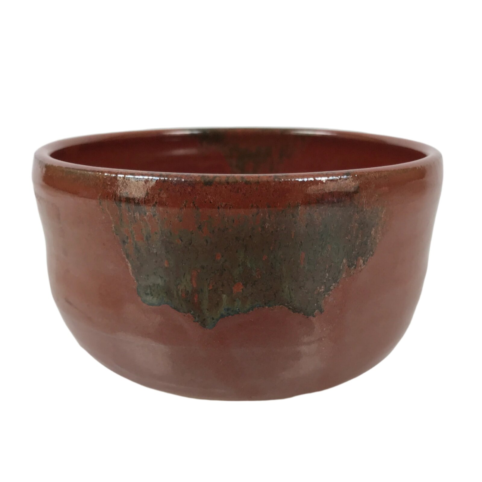 This is a vintage Japanese ceramic green tea bowl or matcha chawan. This bowl has a brownish red glossy glaze with brown and green spots. There is a sign on the foot.