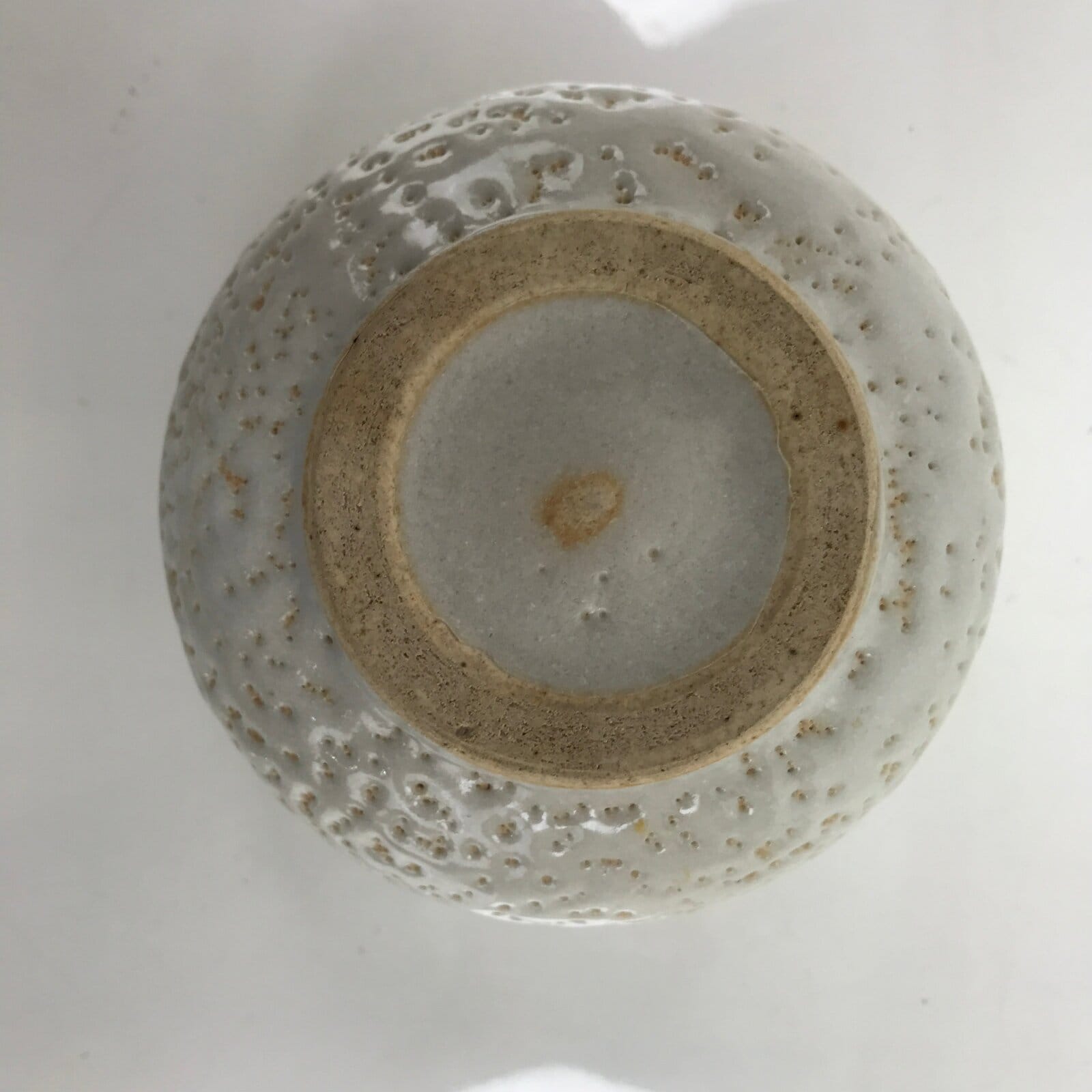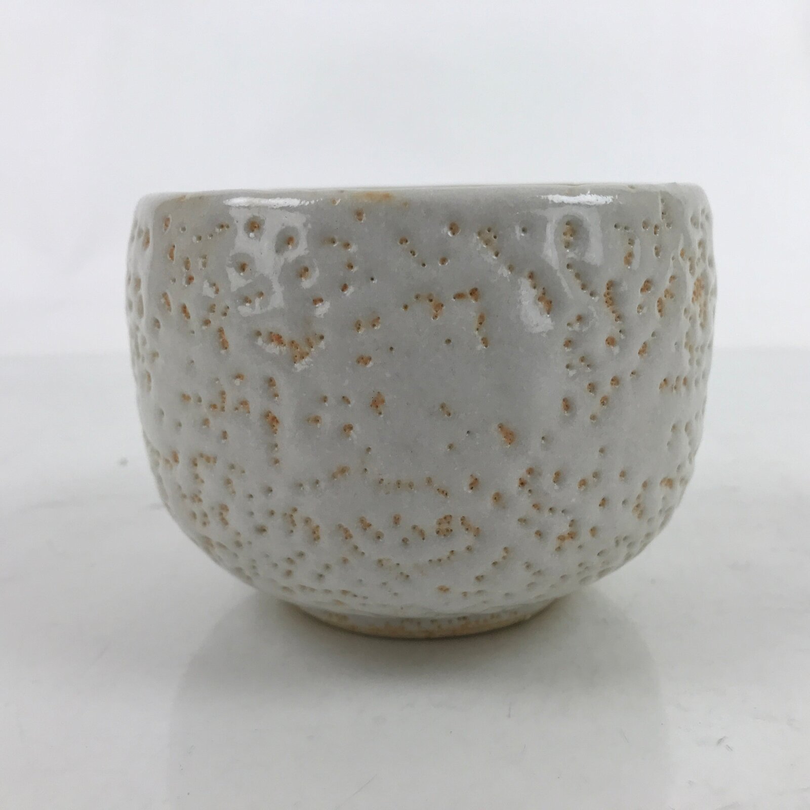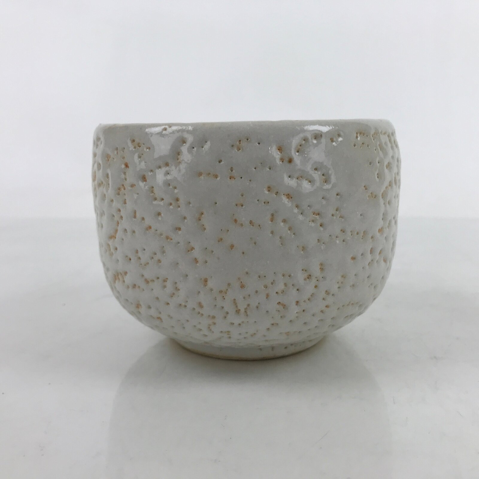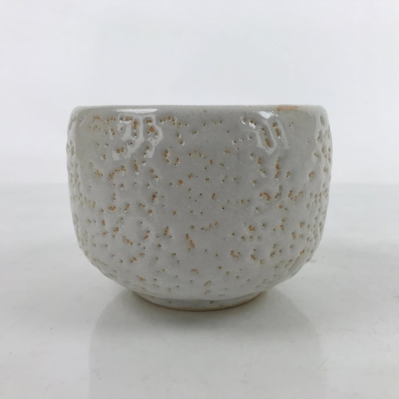 This is a vintage Japanese ceramic green tea bowl or matcha chawan. It is a white textured glaze. This piece is in the yuki shino style. It is sturdy and easy to handle.