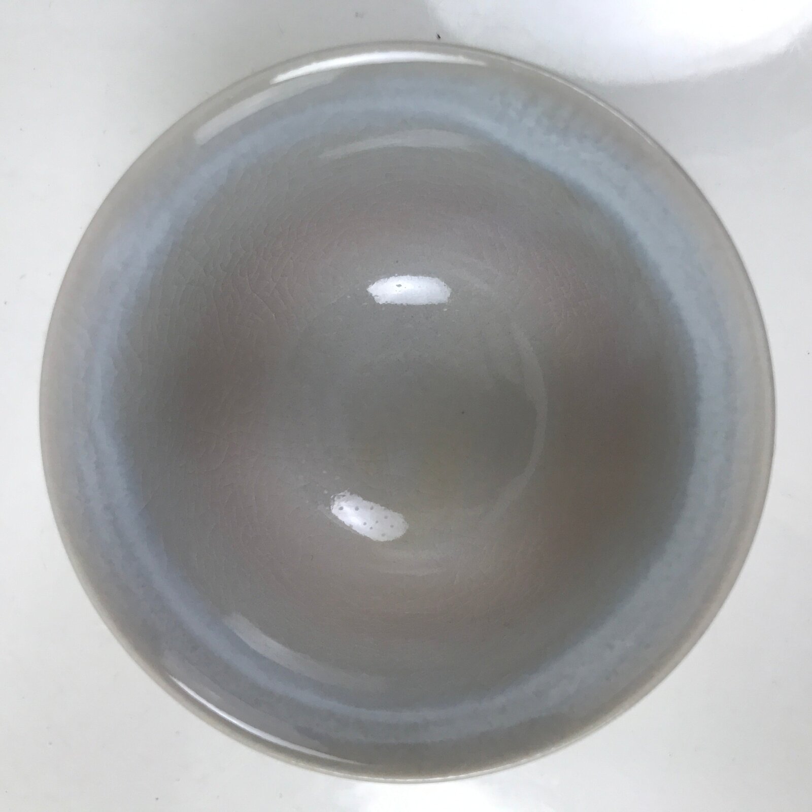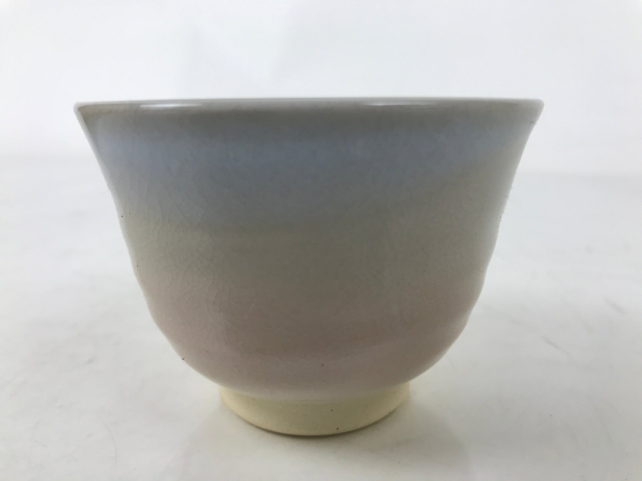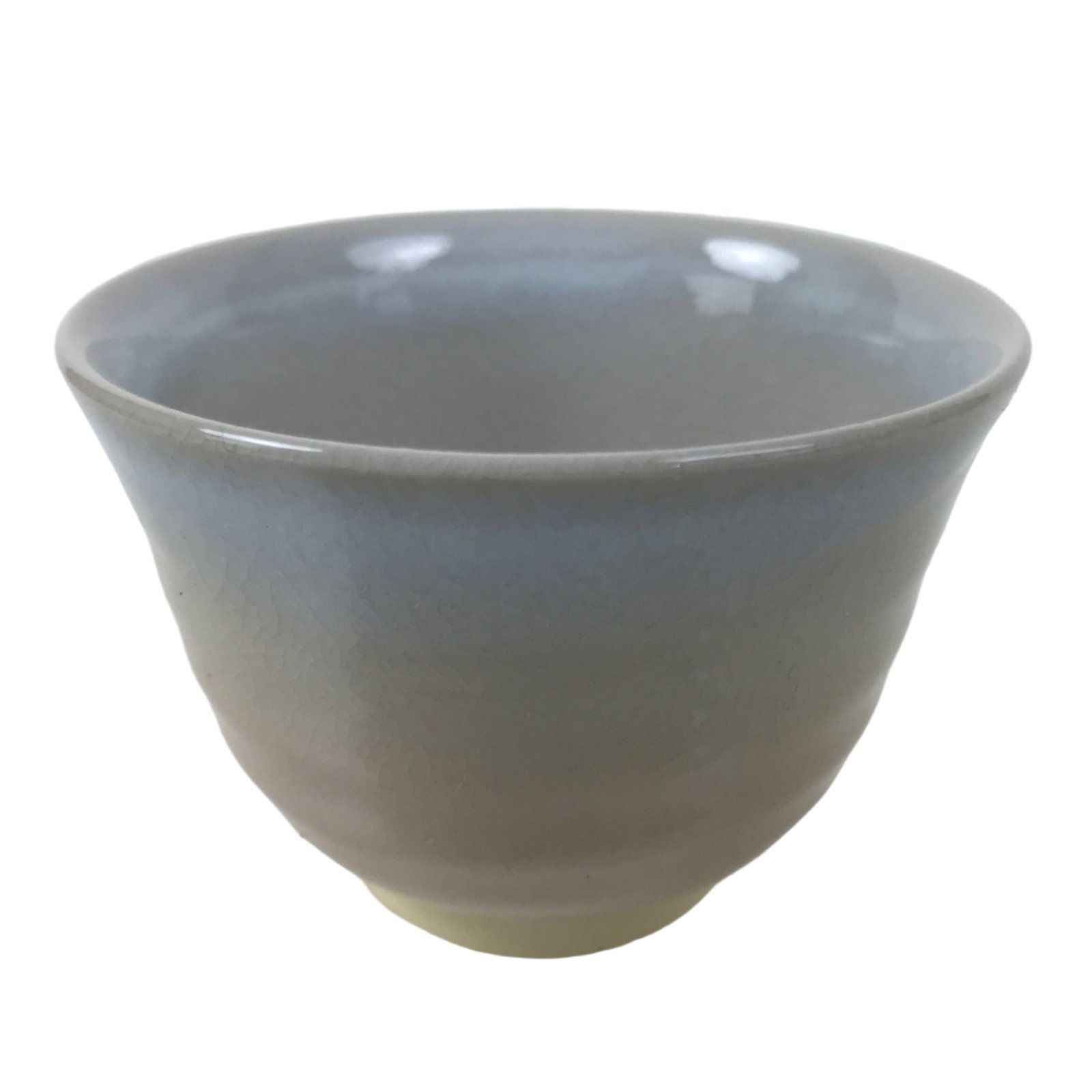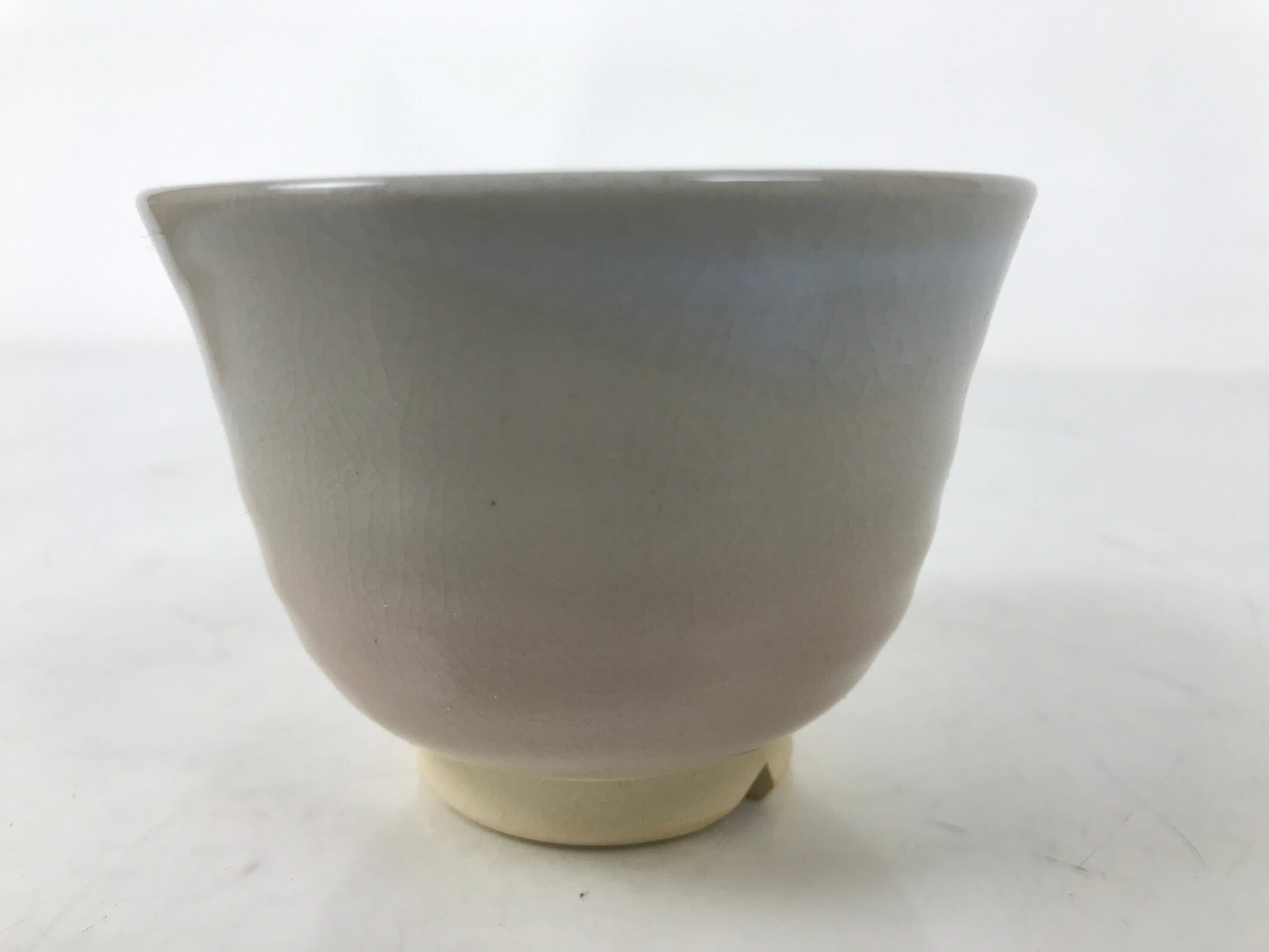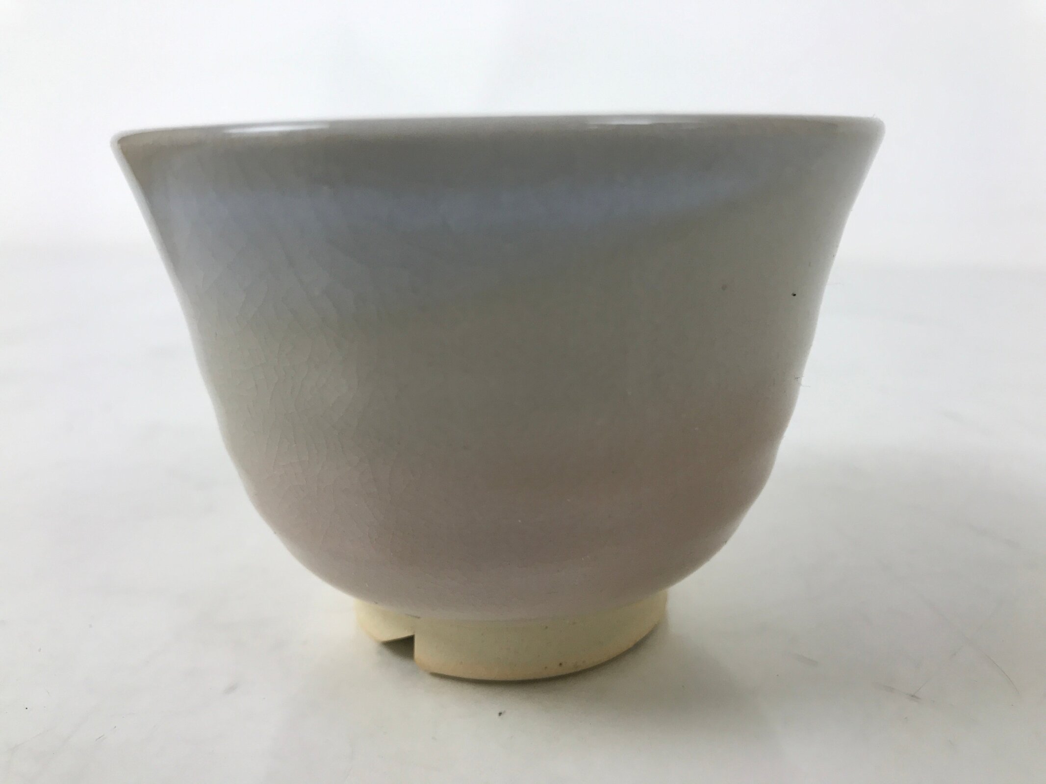 This vintage Japanese ceramic teacup is in a very basic pink and gray color with no other designs other than a crackled look. The base has a triangle cutout, which is a common feature of hagi-yaki pottery. The bottom is stamped with the hagi 萩 kanji.