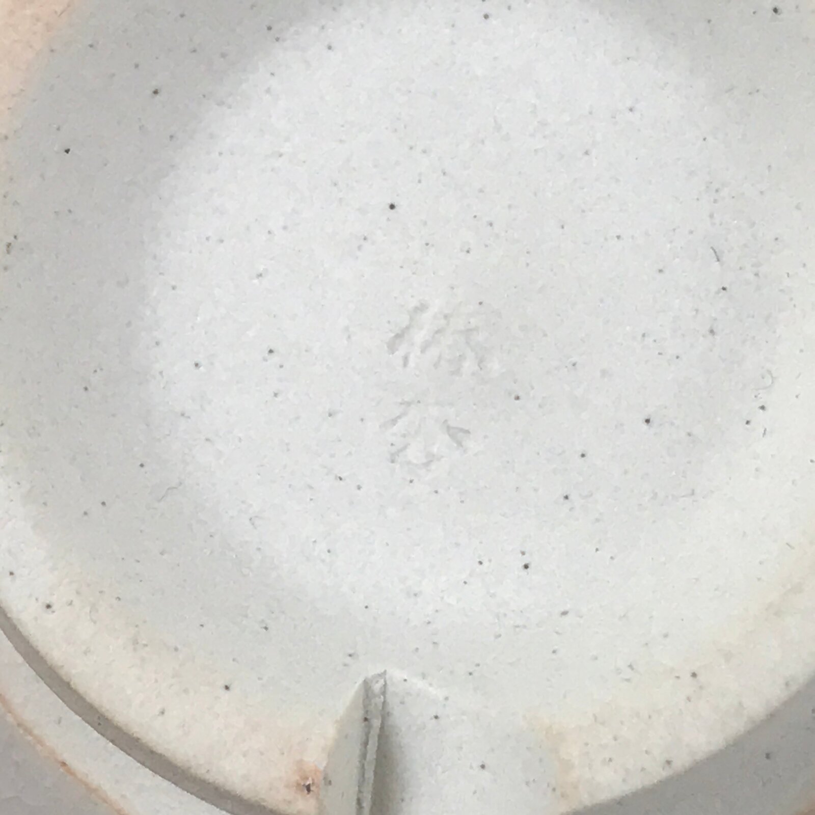 This vintage Japanese ceramic teacup is in a very basic pink and gray color with no other designs other than a crackled look. The base has a triangle cutout, which is a common feature of hagi-yaki pottery. The bottom is stamped with the hagi 萩 kanji.