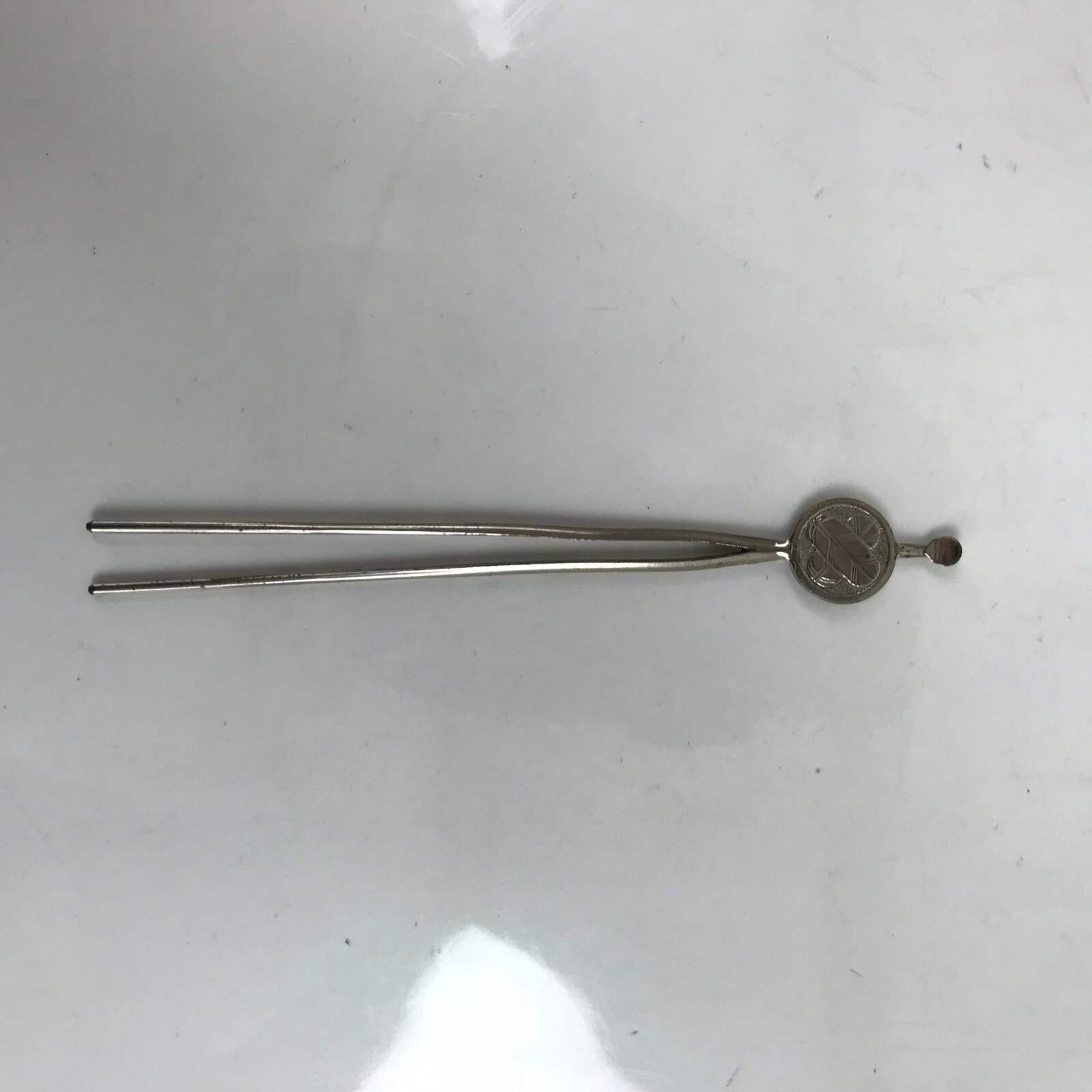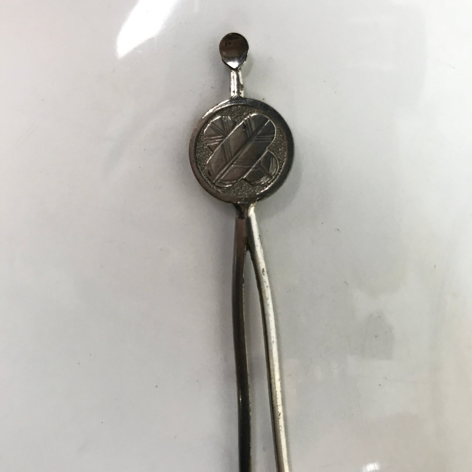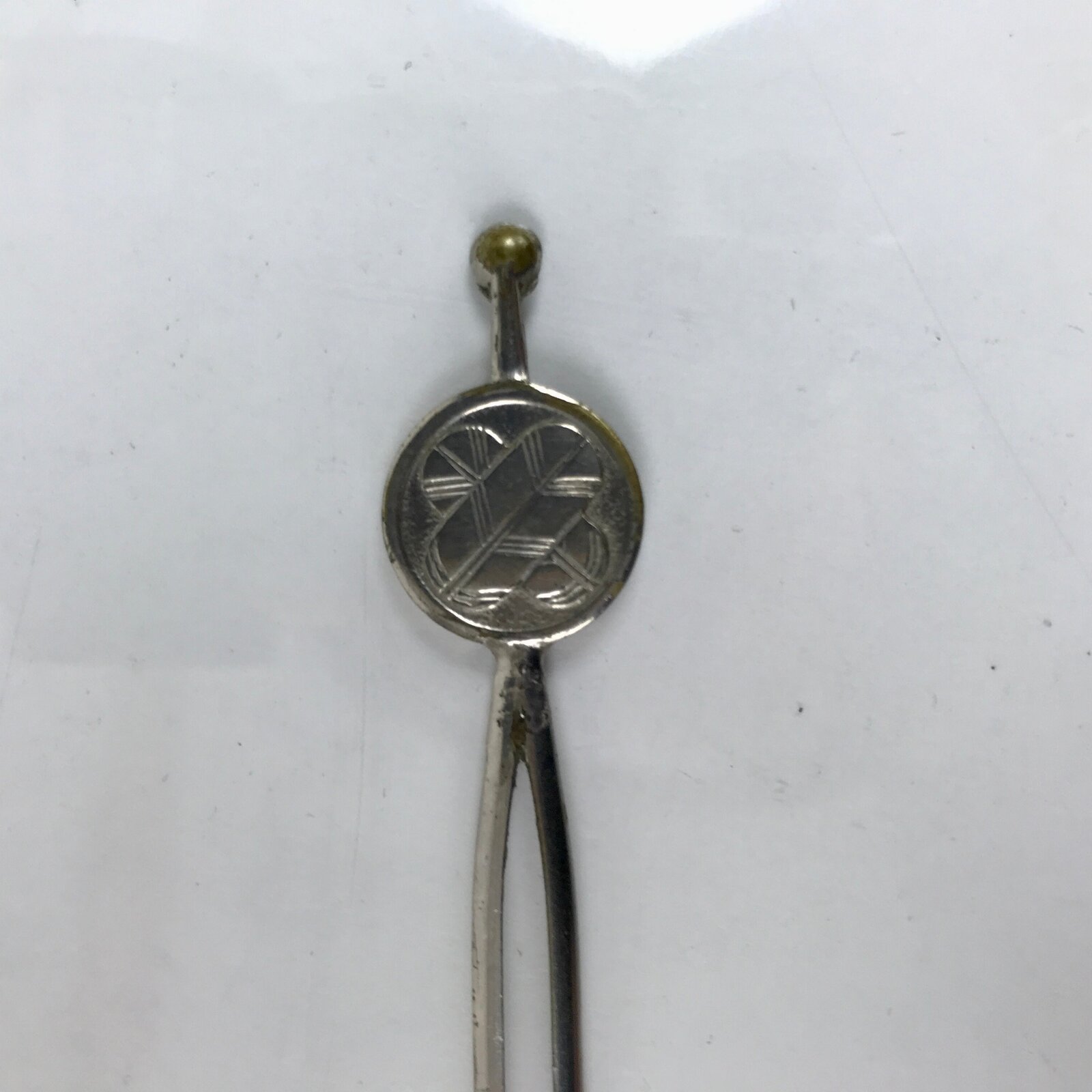 This is a vintage Japanese hair accessory for women’s kimono fashion. It is a metal Futamata-Kanzashi. Futamata means 2 legs. The main feature of this hairpiece is a family crest or kamon at the very top. It depicts crossed hawk feathers or marunichigaitakanoha.