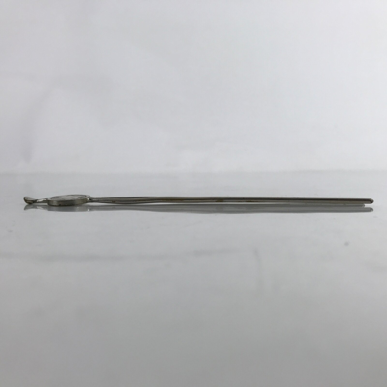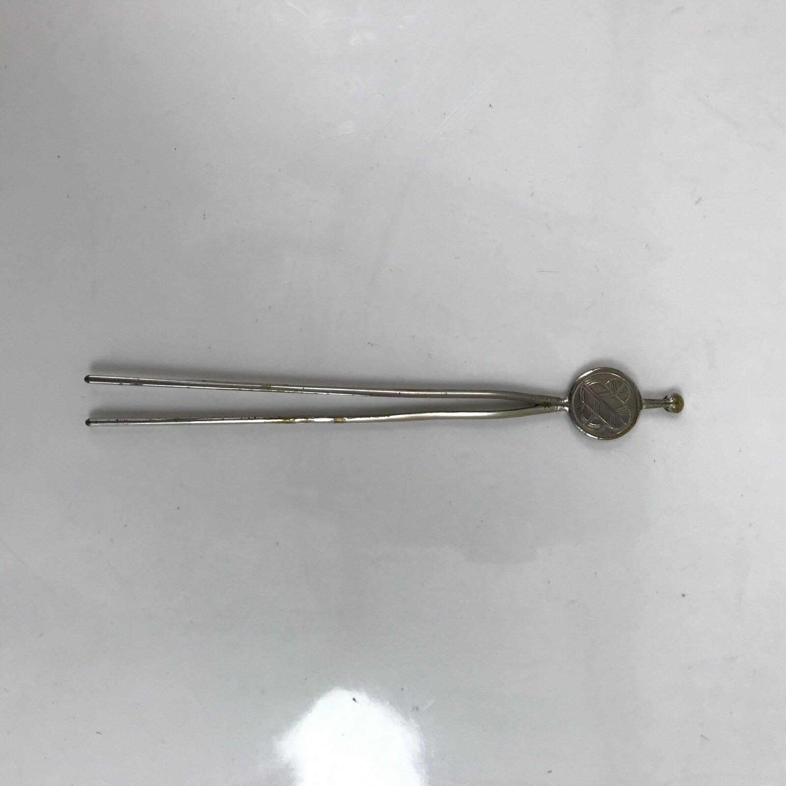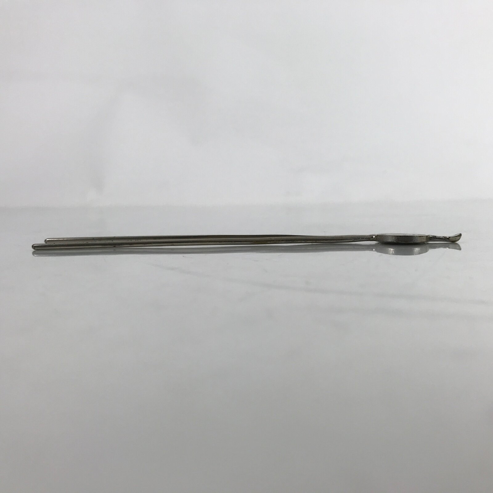 This is a vintage Japanese hair accessory for women’s kimono fashion. It is a metal Futamata-Kanzashi. Futamata means 2 legs. The main feature of this hairpiece is a family crest or kamon at the very top. It depicts crossed hawk feathers or marunichigaitakanoha.