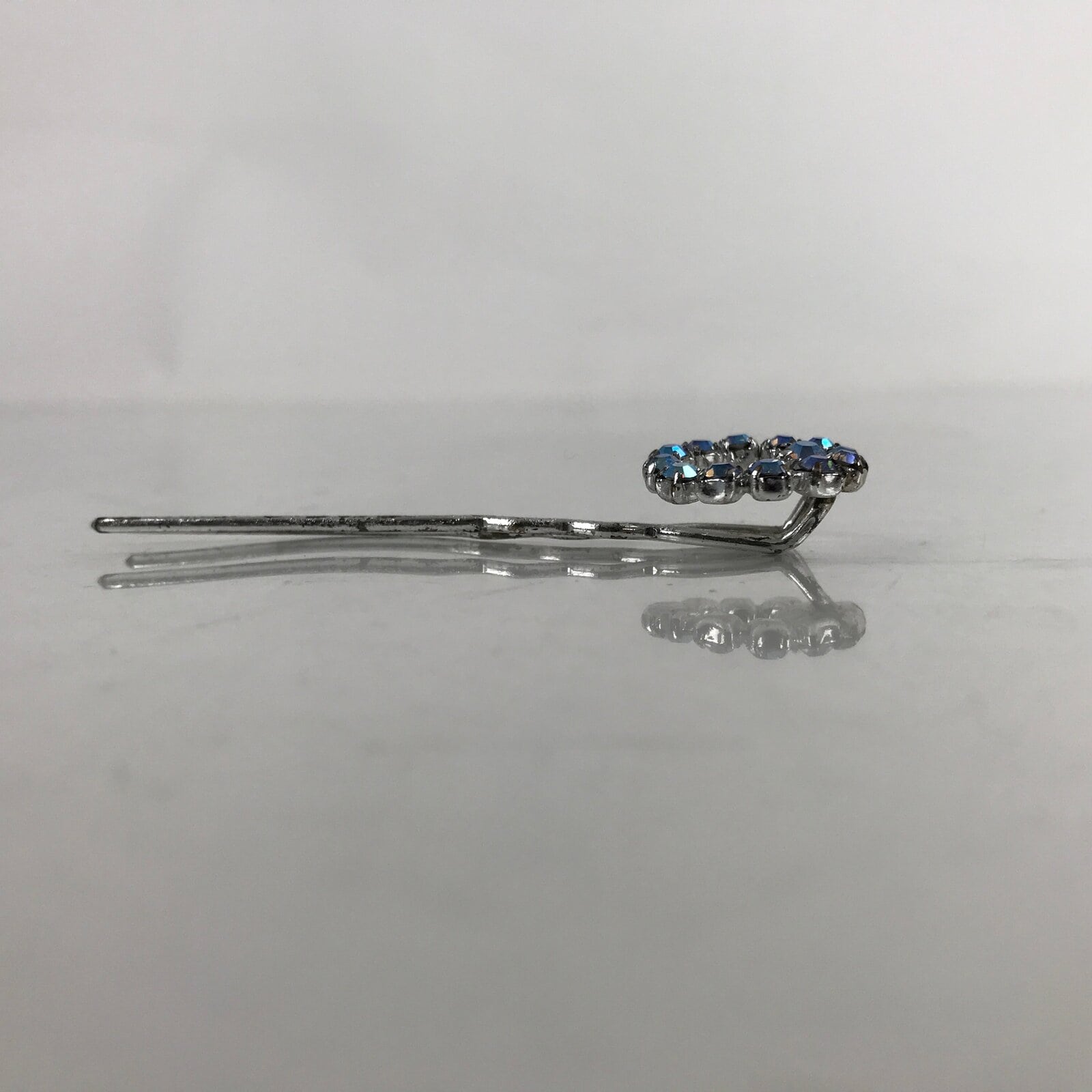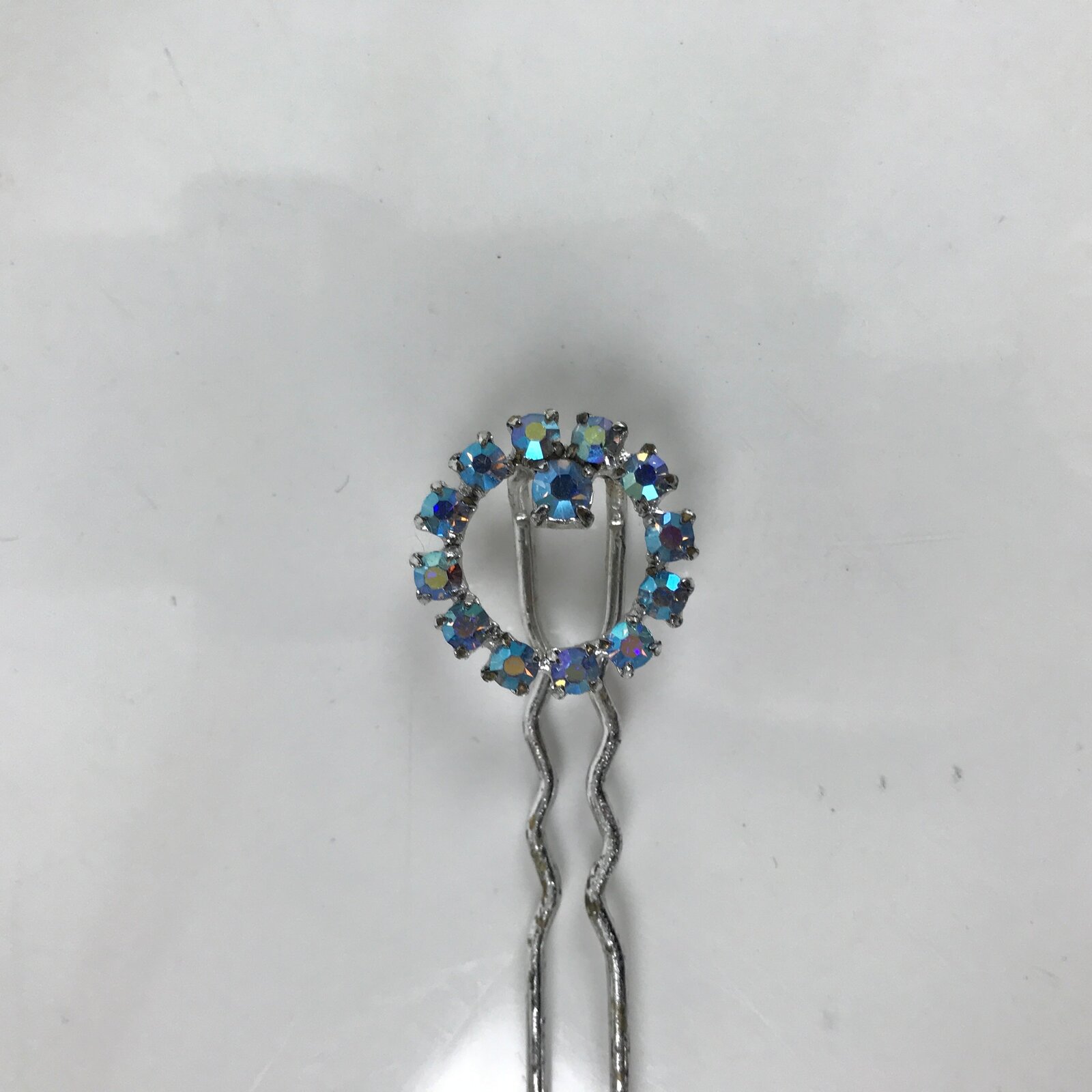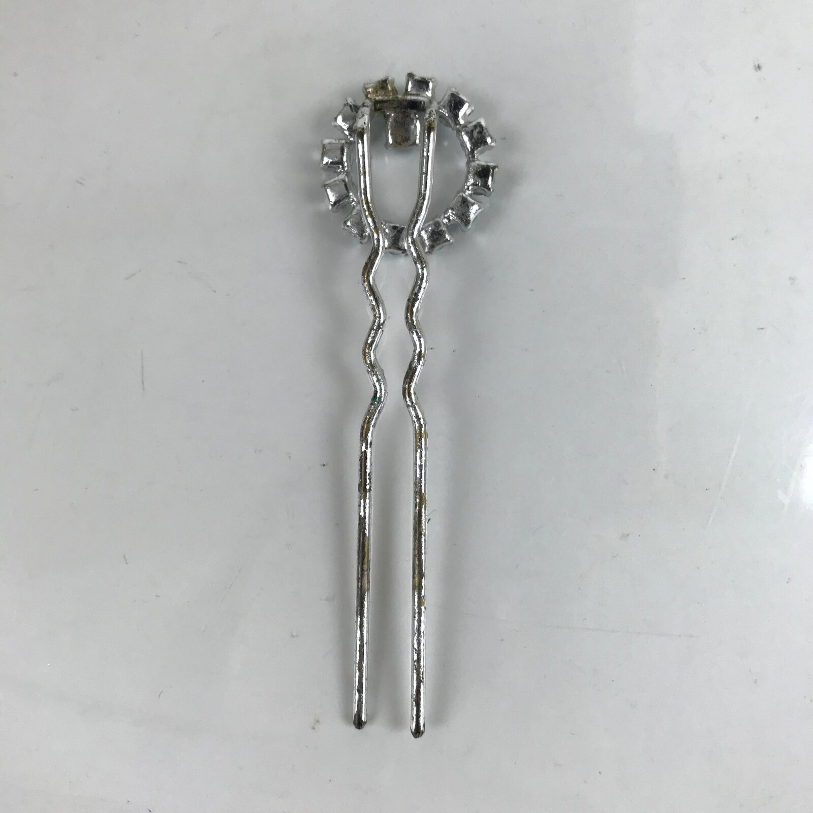 This is a vintage Japanese hair accessory for women’s kimono fashion. It is a metal Futamata-Kanzashi. Futamata means 2 legs. It is ornamented with pale blue rhinestones at the top.