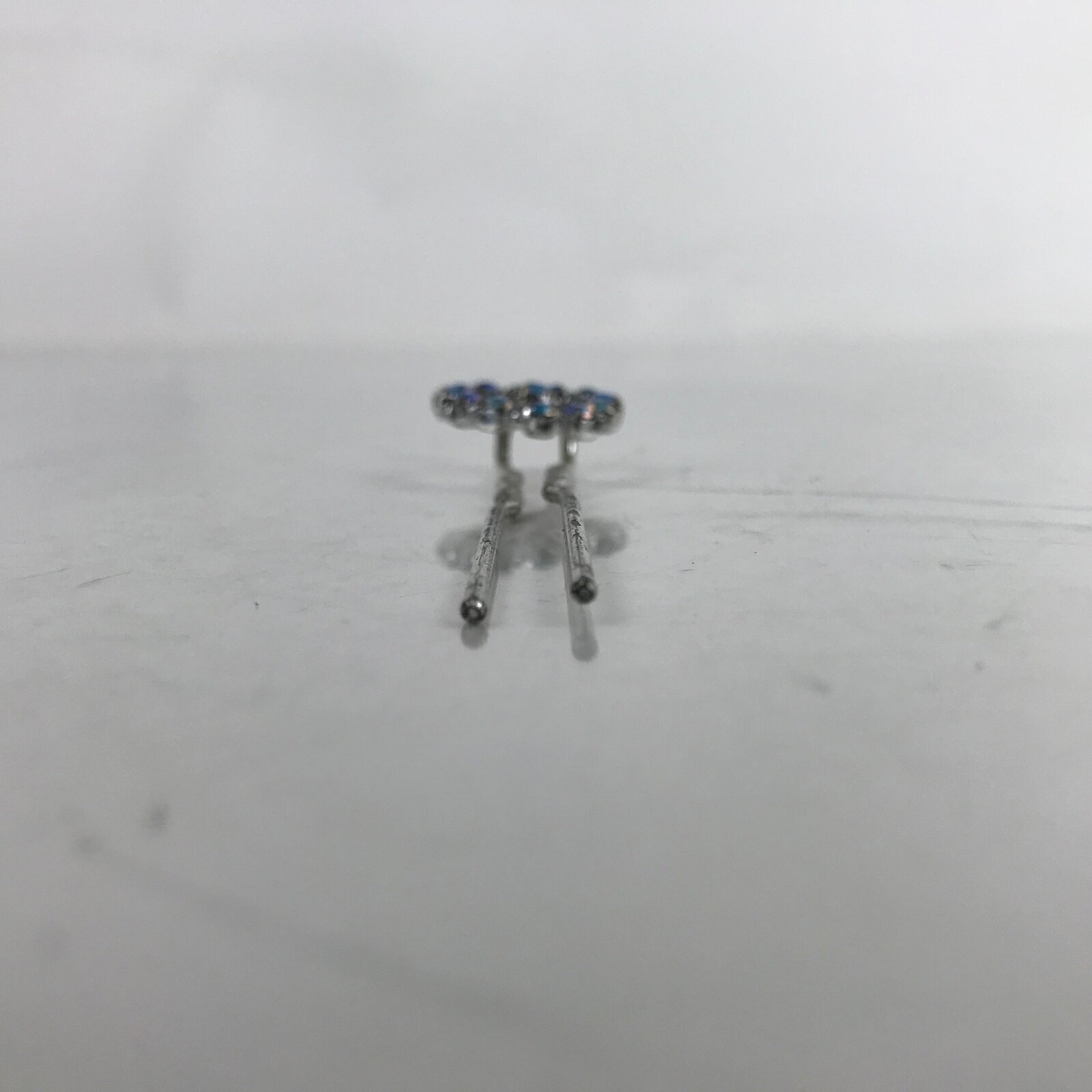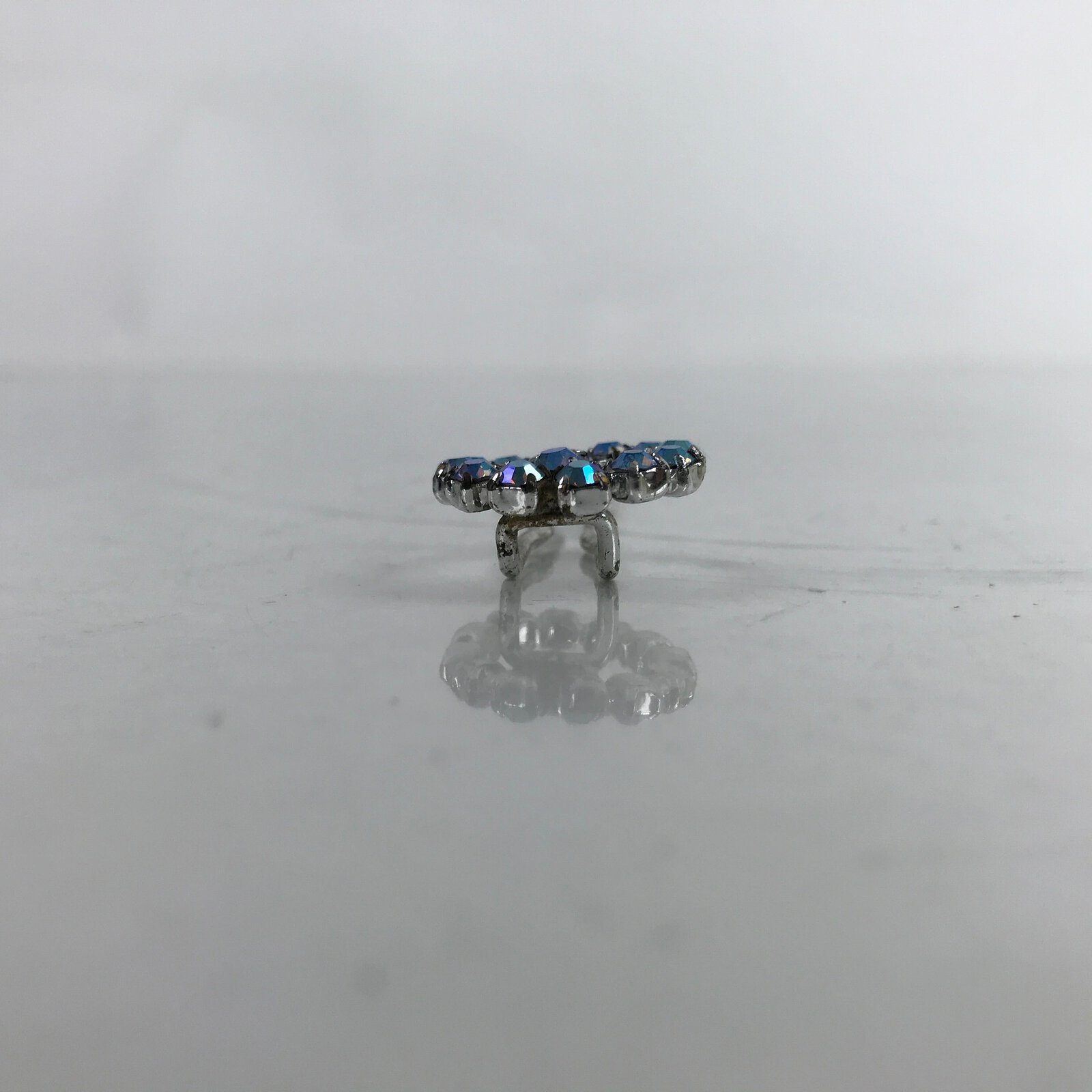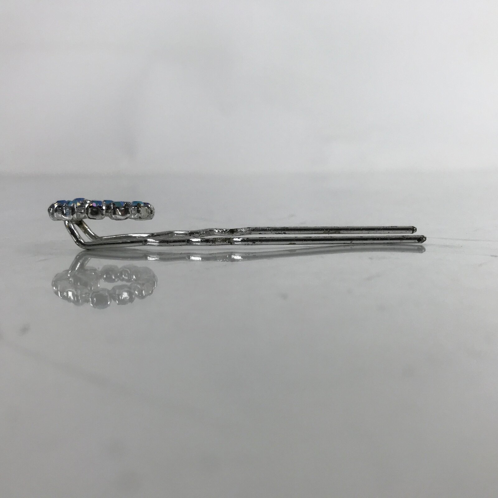 This is a vintage Japanese hair accessory for women’s kimono fashion. It is a metal Futamata-Kanzashi. Futamata means 2 legs. It is ornamented with pale blue rhinestones at the top.