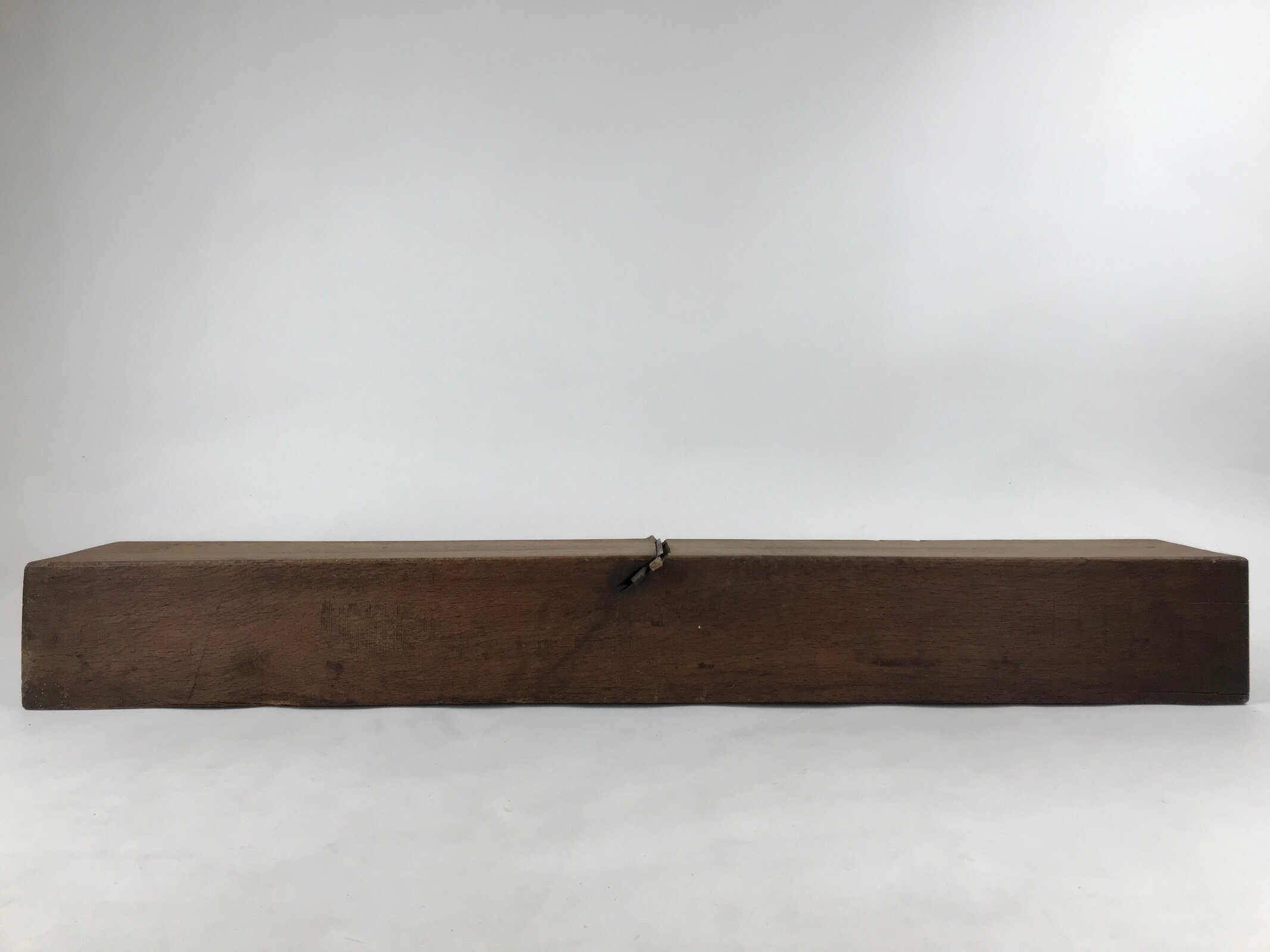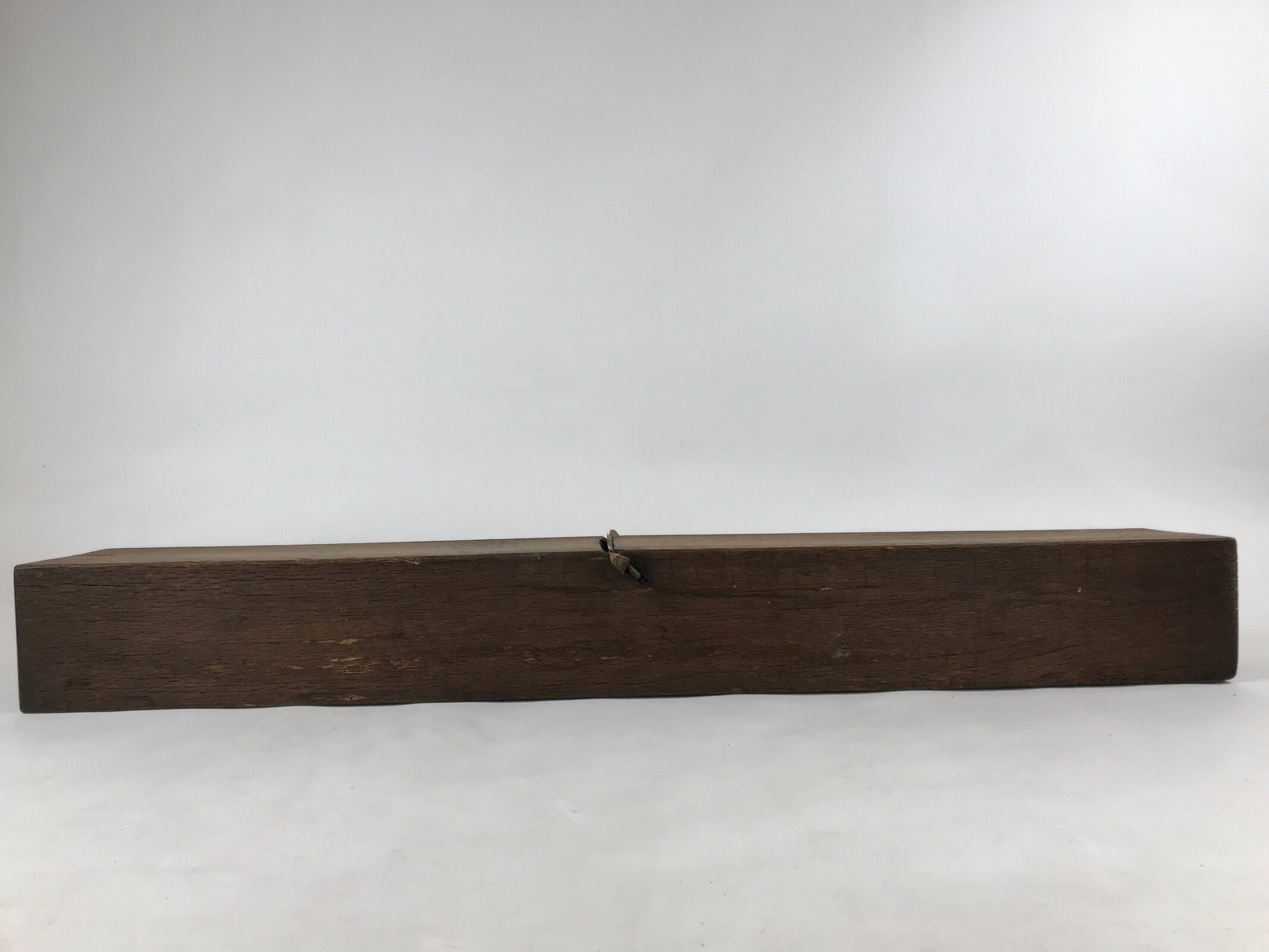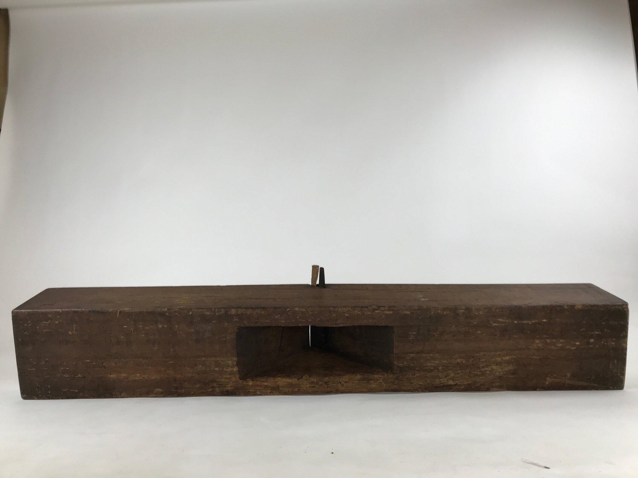 This is a Japanese vintage hand plane tool, hira kanna. It is a woodworking tool made of hardwood and used for smoothing the wood surface. This kanna is uniquely oversized and heavy. It is meant to be stationary and sit atop a table or a pair of sawhorses while passing a wood piece over the top of it. The filed wood falls out the opening in the bottom.