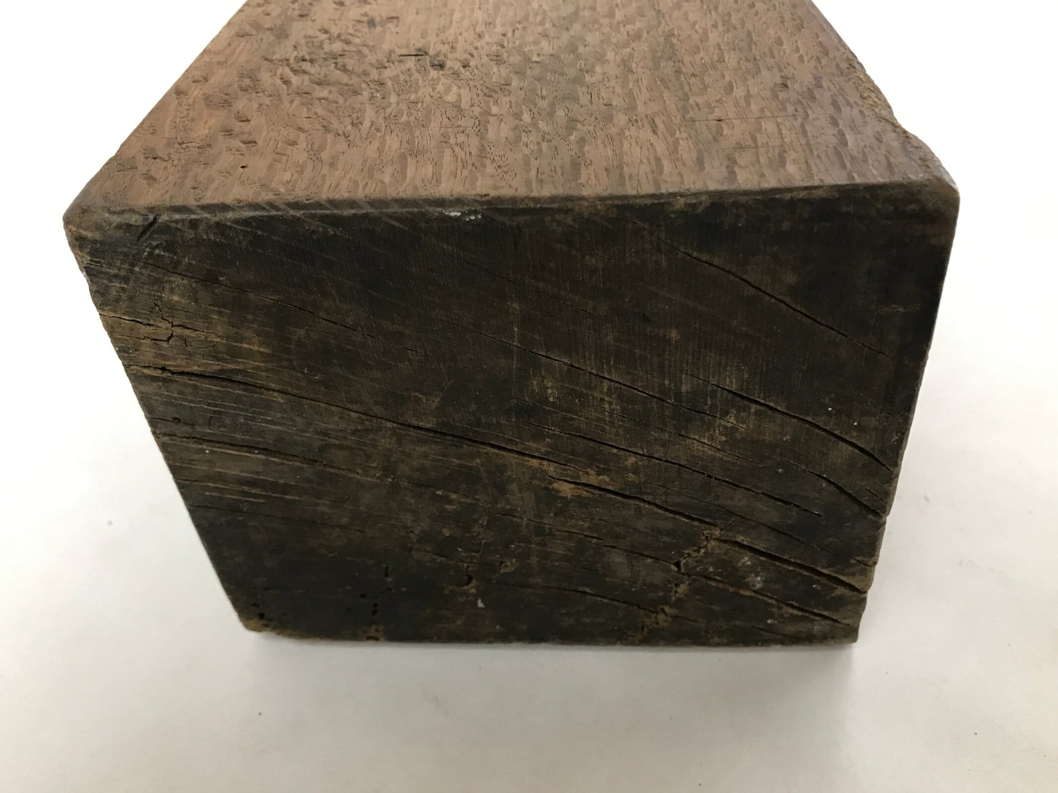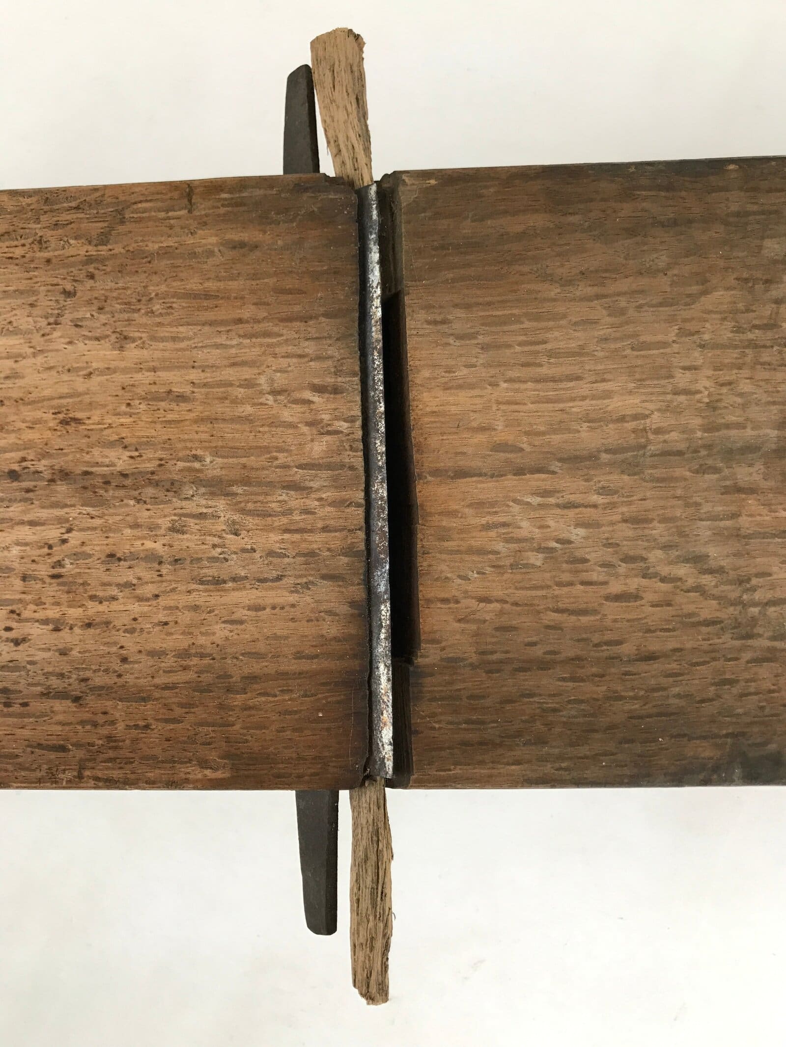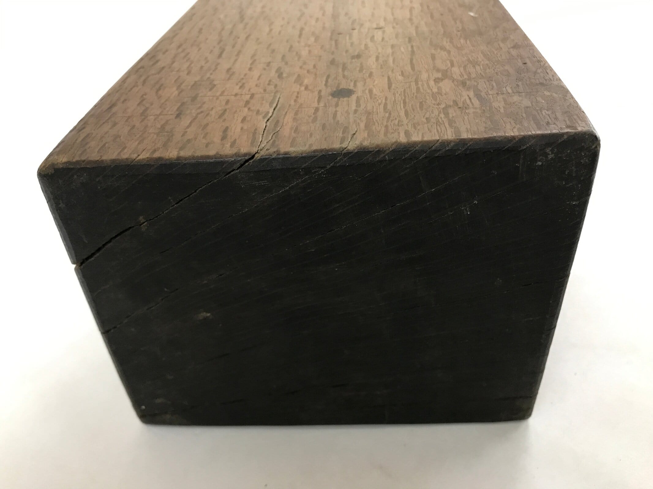 This is a Japanese vintage hand plane tool, hira kanna. It is a woodworking tool made of hardwood and used for smoothing the wood surface. This kanna is uniquely oversized and heavy. It is meant to be stationary and sit atop a table or a pair of sawhorses while passing a wood piece over the top of it. The filed wood falls out the opening in the bottom.
