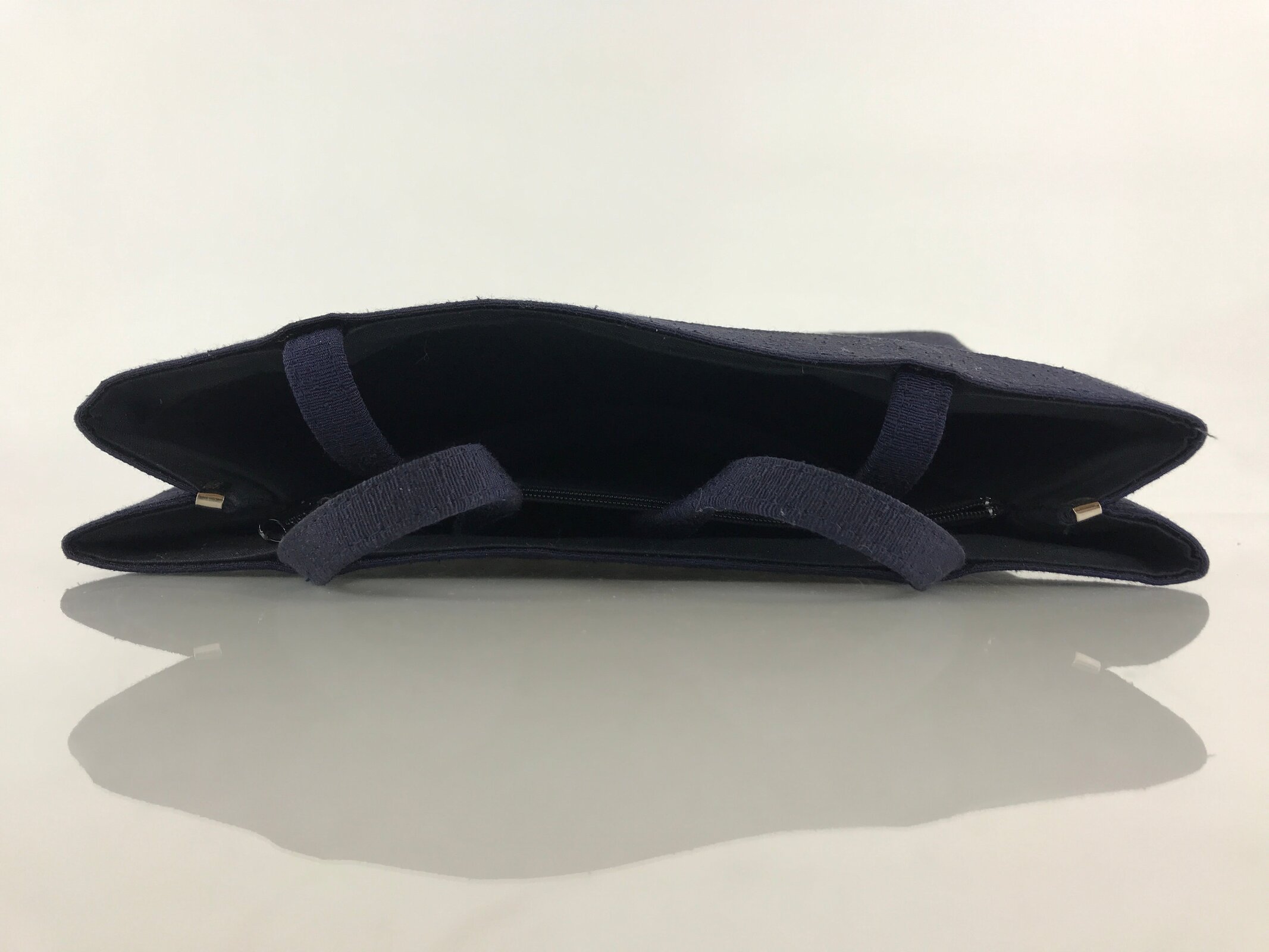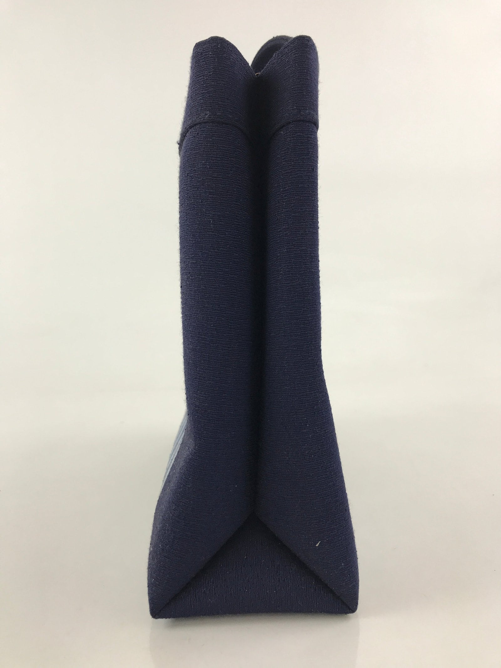 This Japanese handbag is crafted from Kimono fabric. Featuring blue cloth and a striped material, it exudes a tranquil atmosphere and can be used in any situation. The bag contains a zippered compartment inside, adding an extra layer of organization.