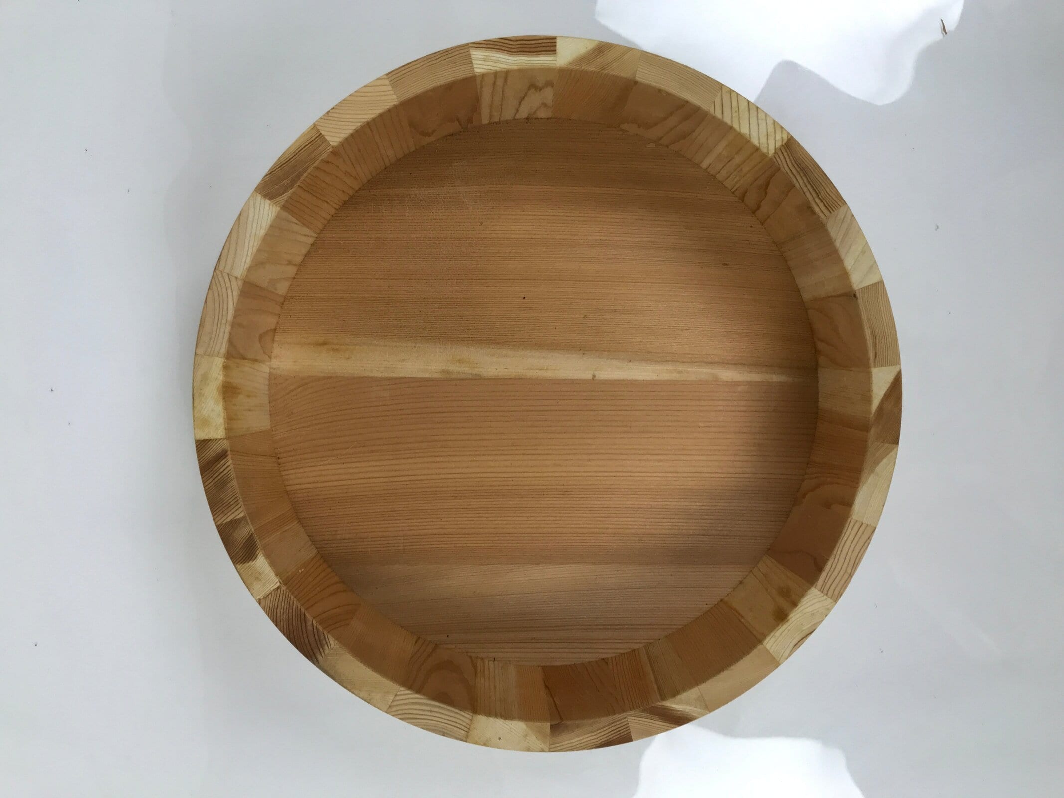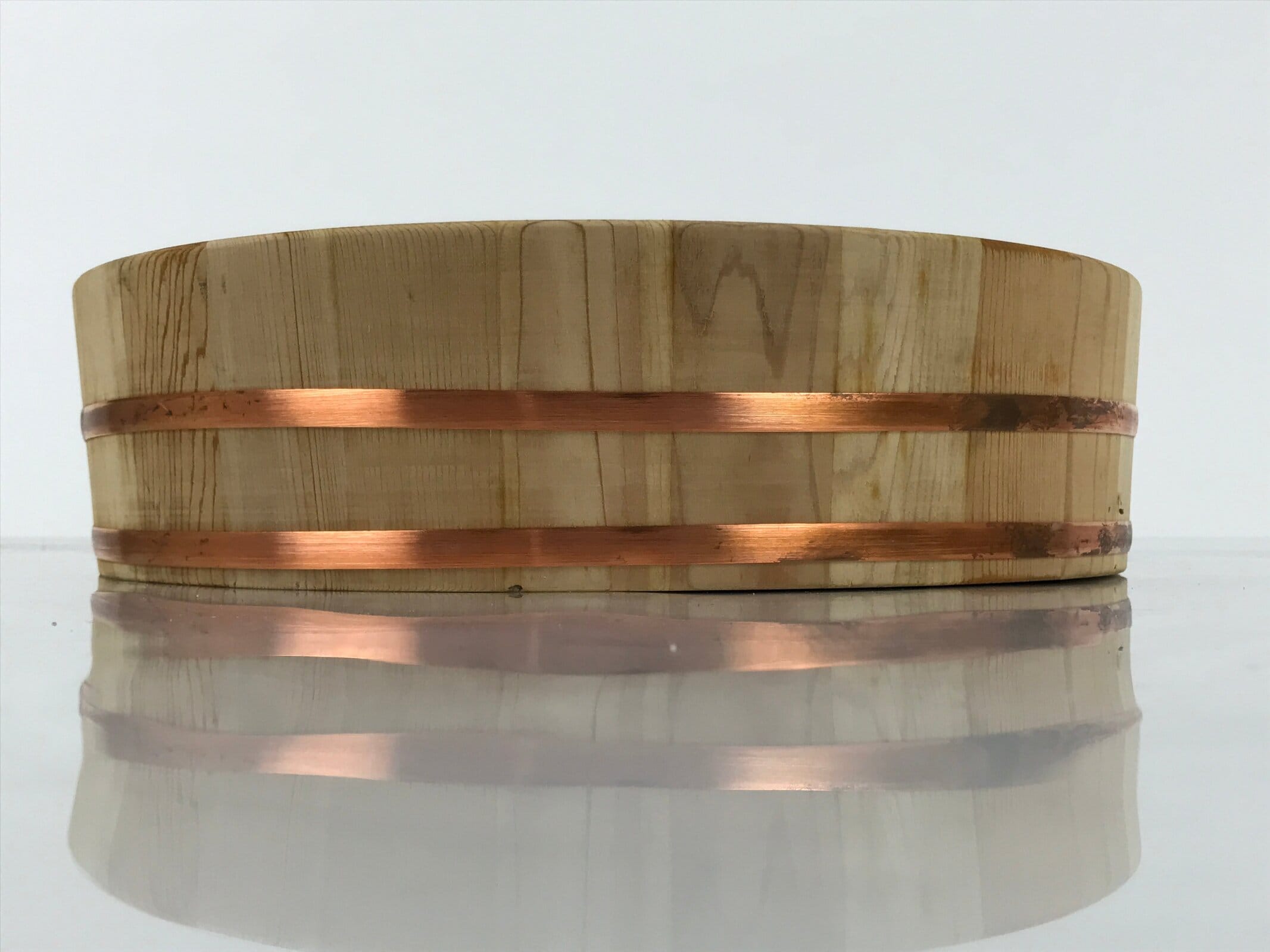 This is a Japanese vintage wooden sushi bucket. It is called Sushioke, Hangiri, or Handai. Sushioke is a bucket used to serve sushi. This is usually made of cedar or cypress wood and is firmly held together by two thin metal plates or wires called Taga. This particular sushi bucket has two flat copper bands.