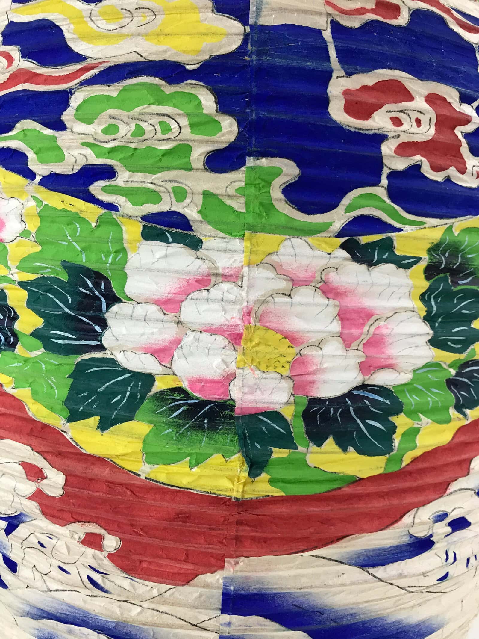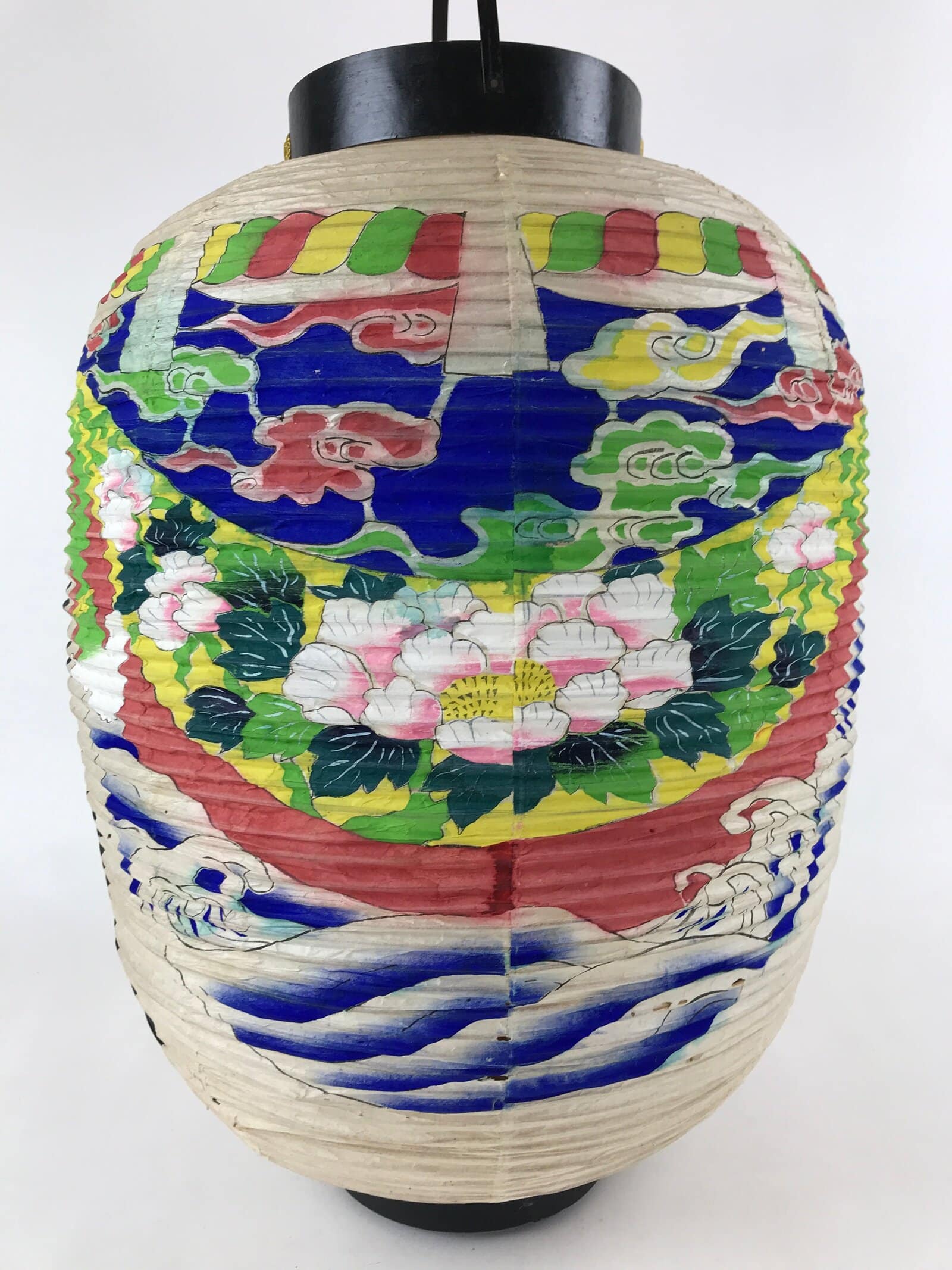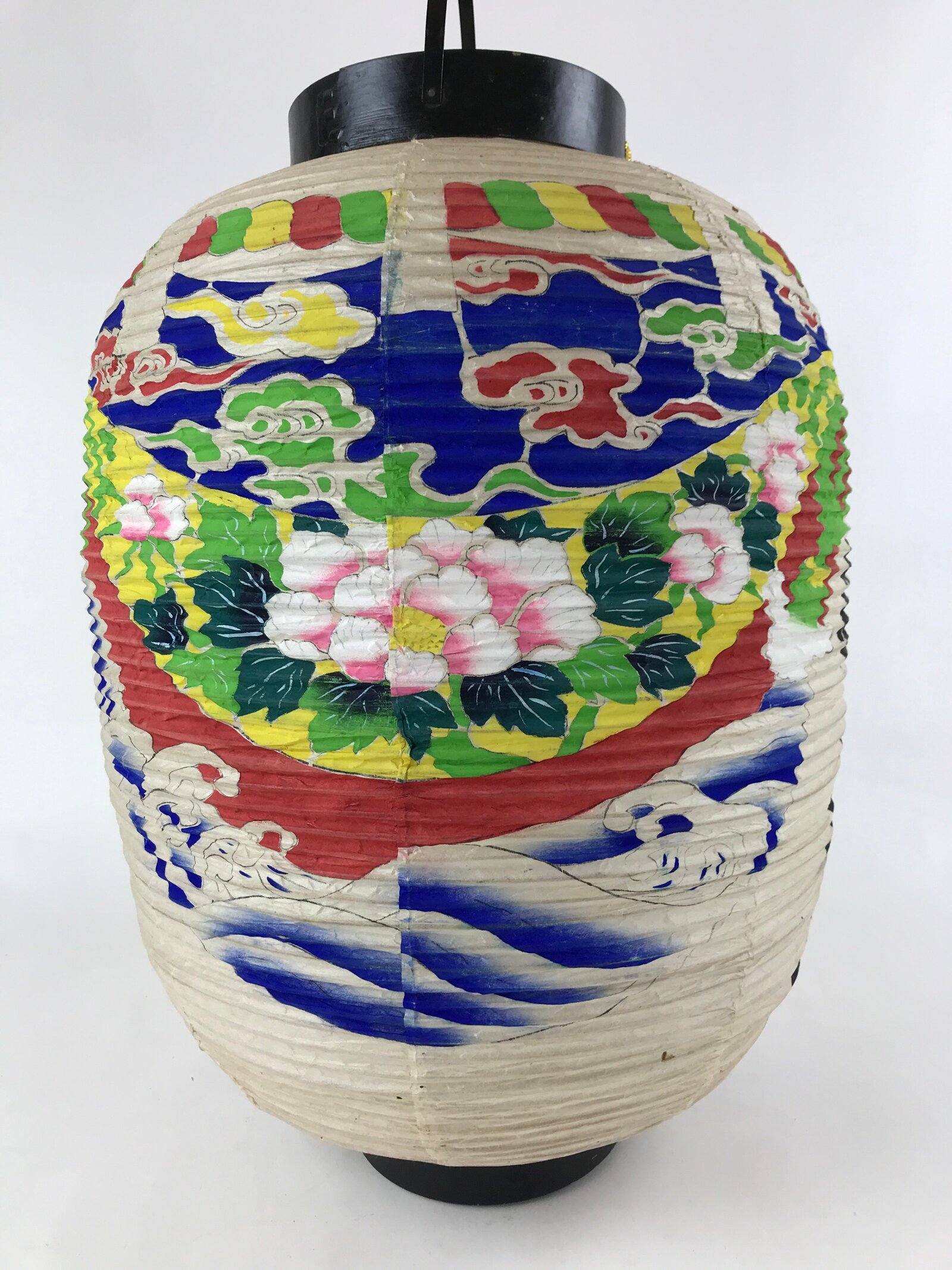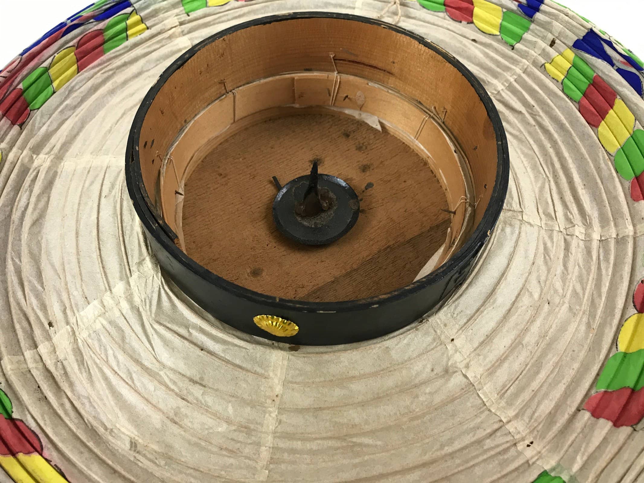 This is a Japanese vintage hanging paper lantern or Chochin. This large oblong paper lantern is foldable. It is decorated with a beautiful and colorful floral pattern. It has Japanese characters painted on the front and on the back and a built-in metal candle holder in the center of the base, which enables one to place a real candle inside of it. This lantern was probably used as an offering to the Japanese gods.