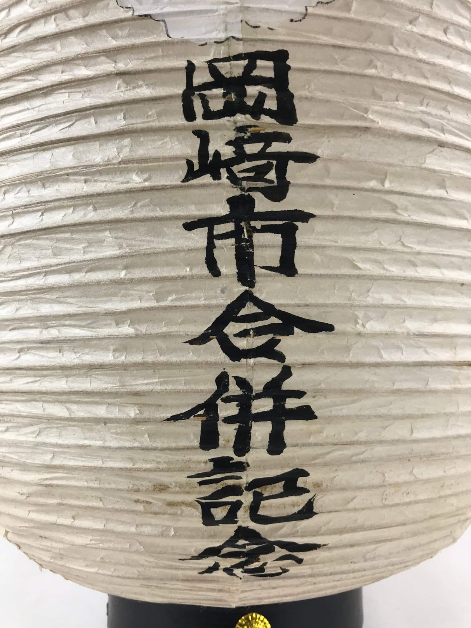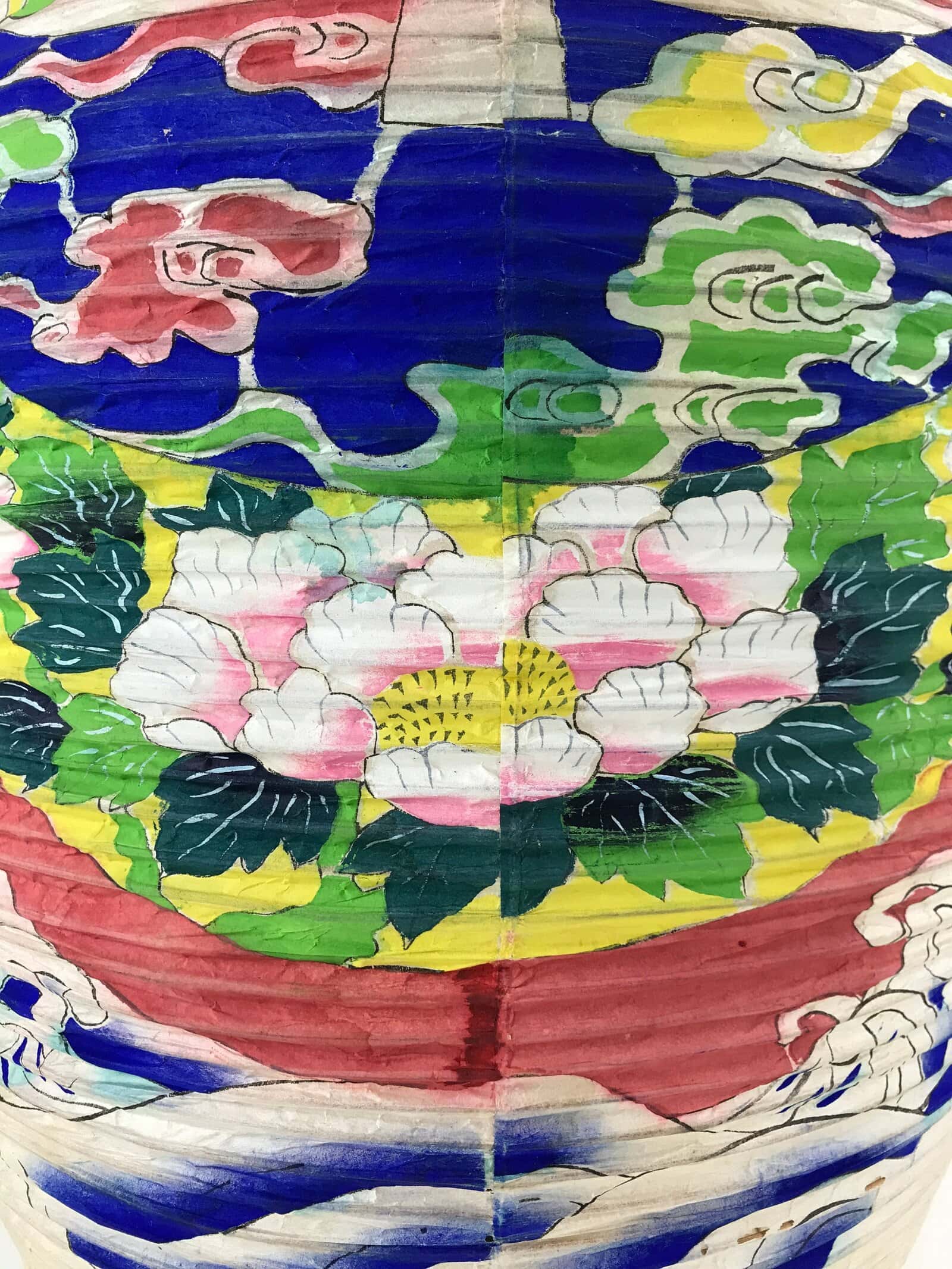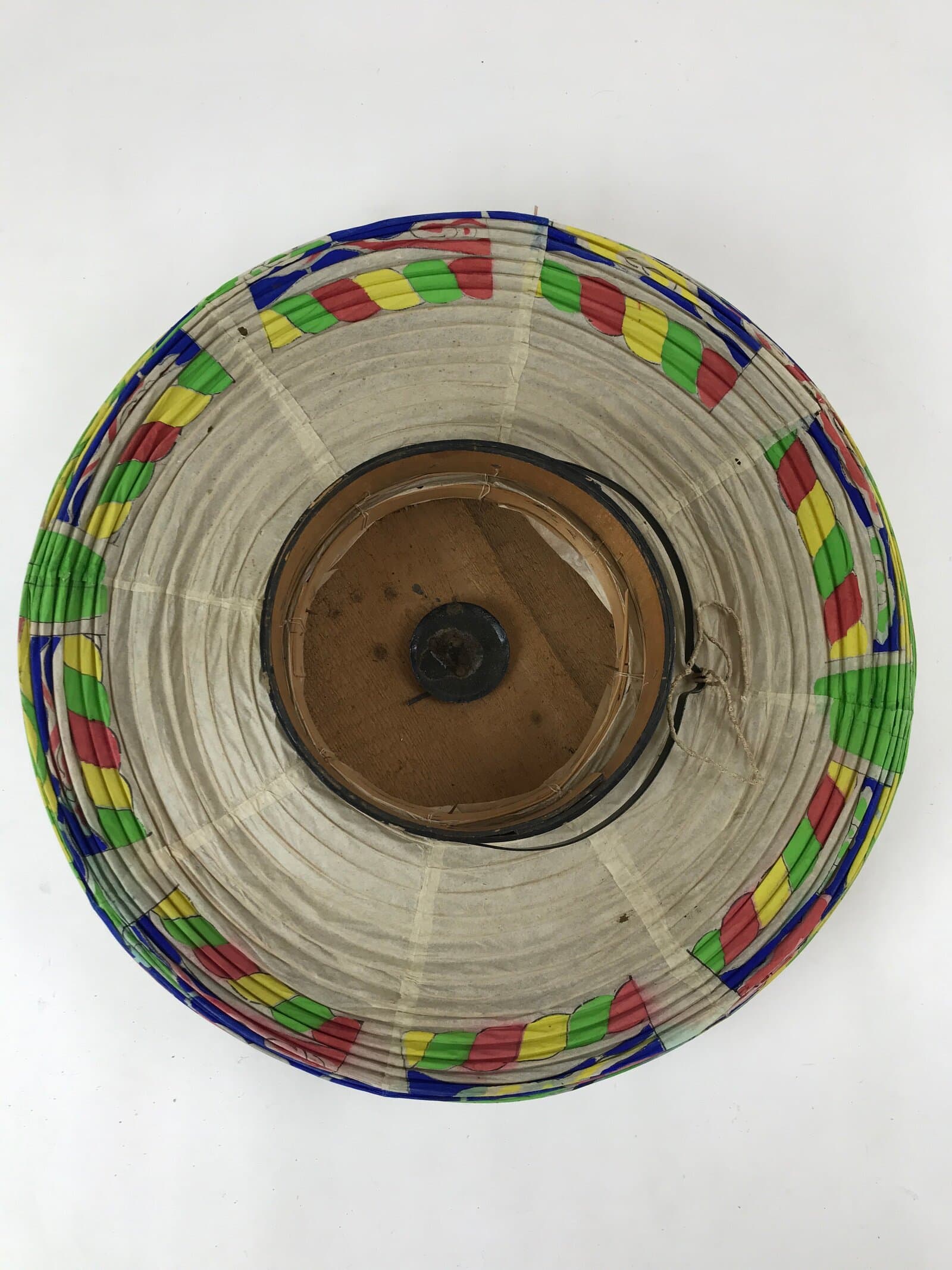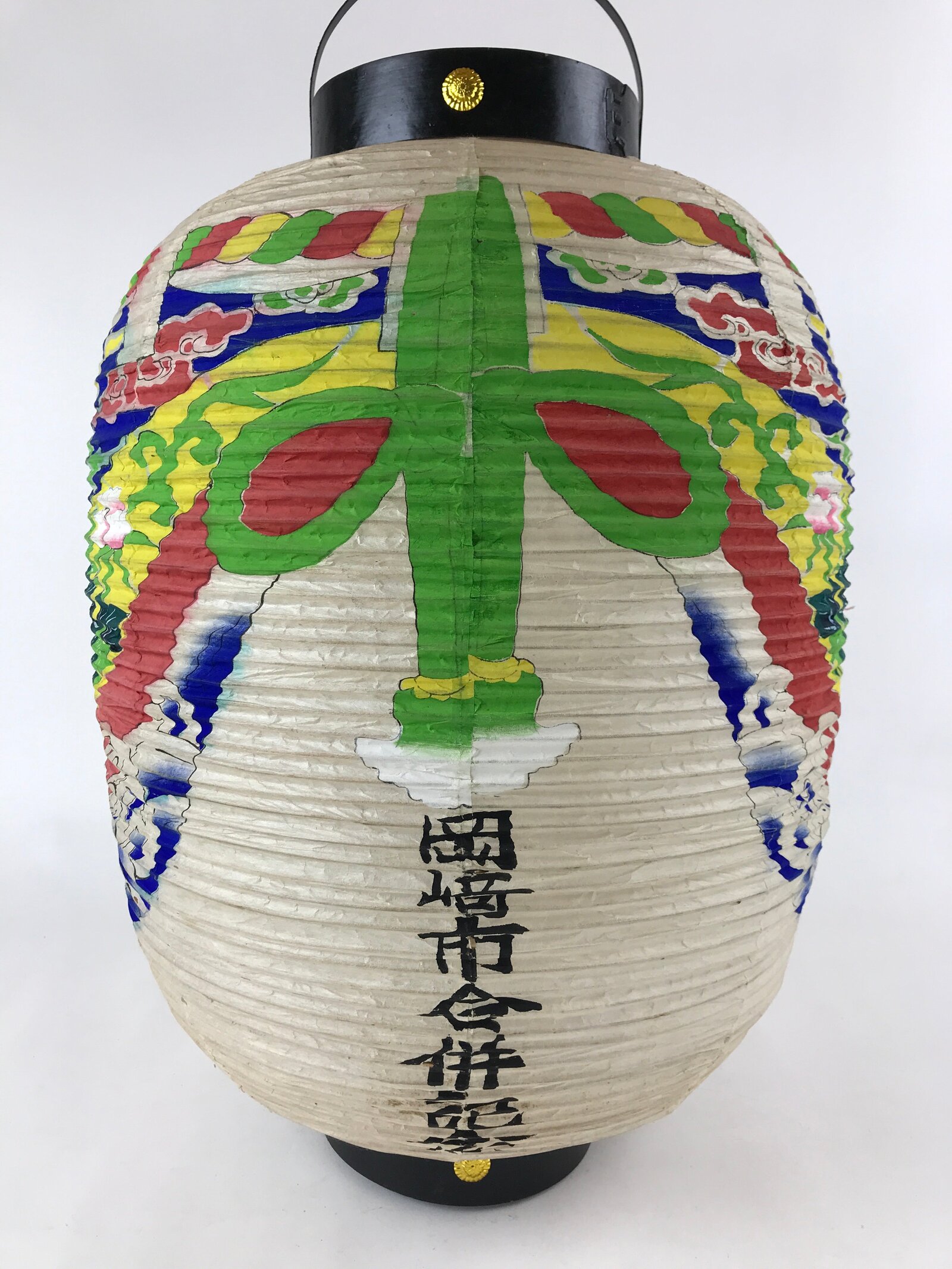 This is a Japanese vintage hanging paper lantern or Chochin. This large oblong paper lantern is foldable. It is decorated with a beautiful and colorful floral pattern. It has Japanese characters painted on the front and on the back and a built-in metal candle holder in the center of the base, which enables one to place a real candle inside of it. This lantern was probably used as an offering to the Japanese gods.