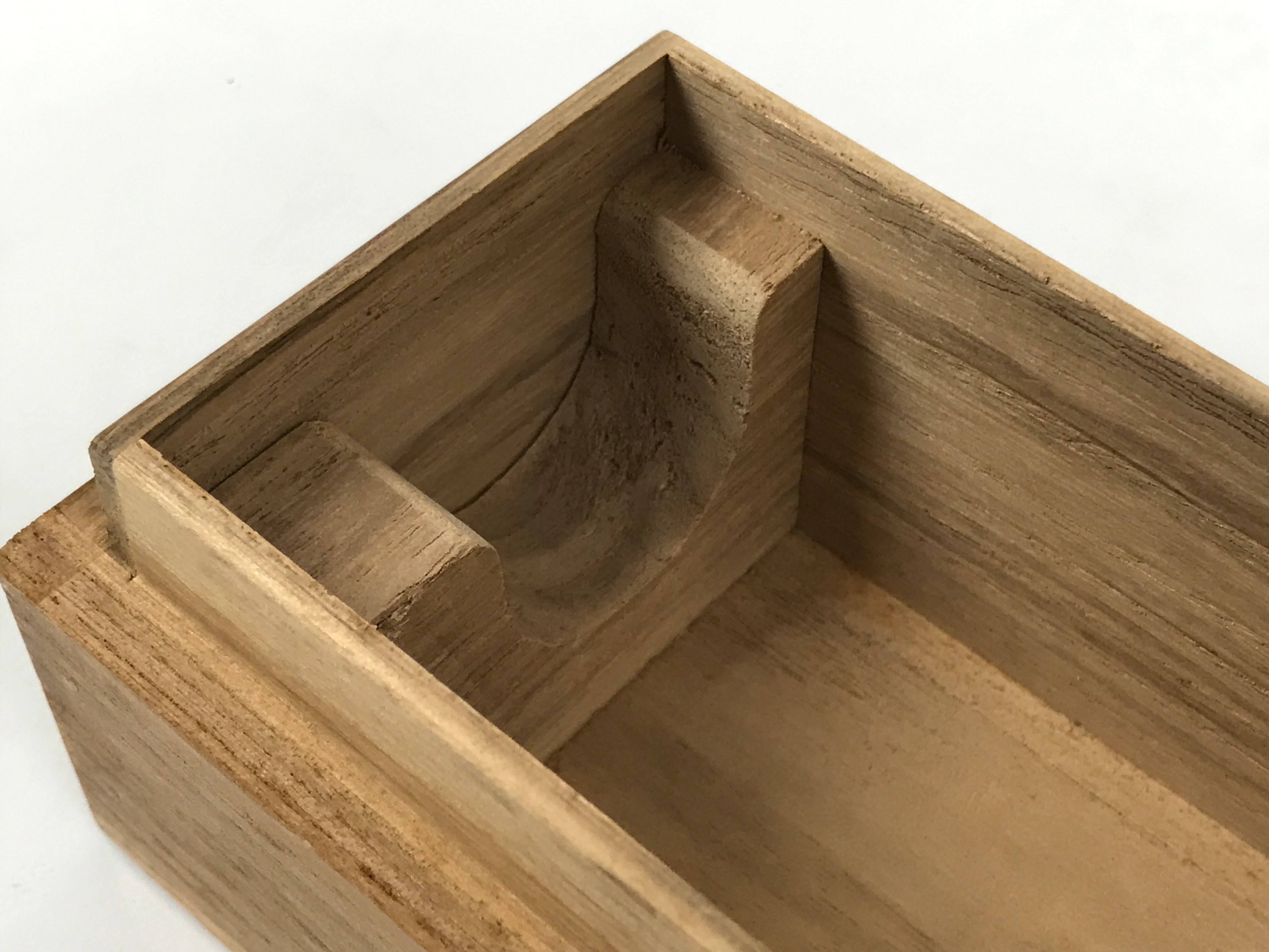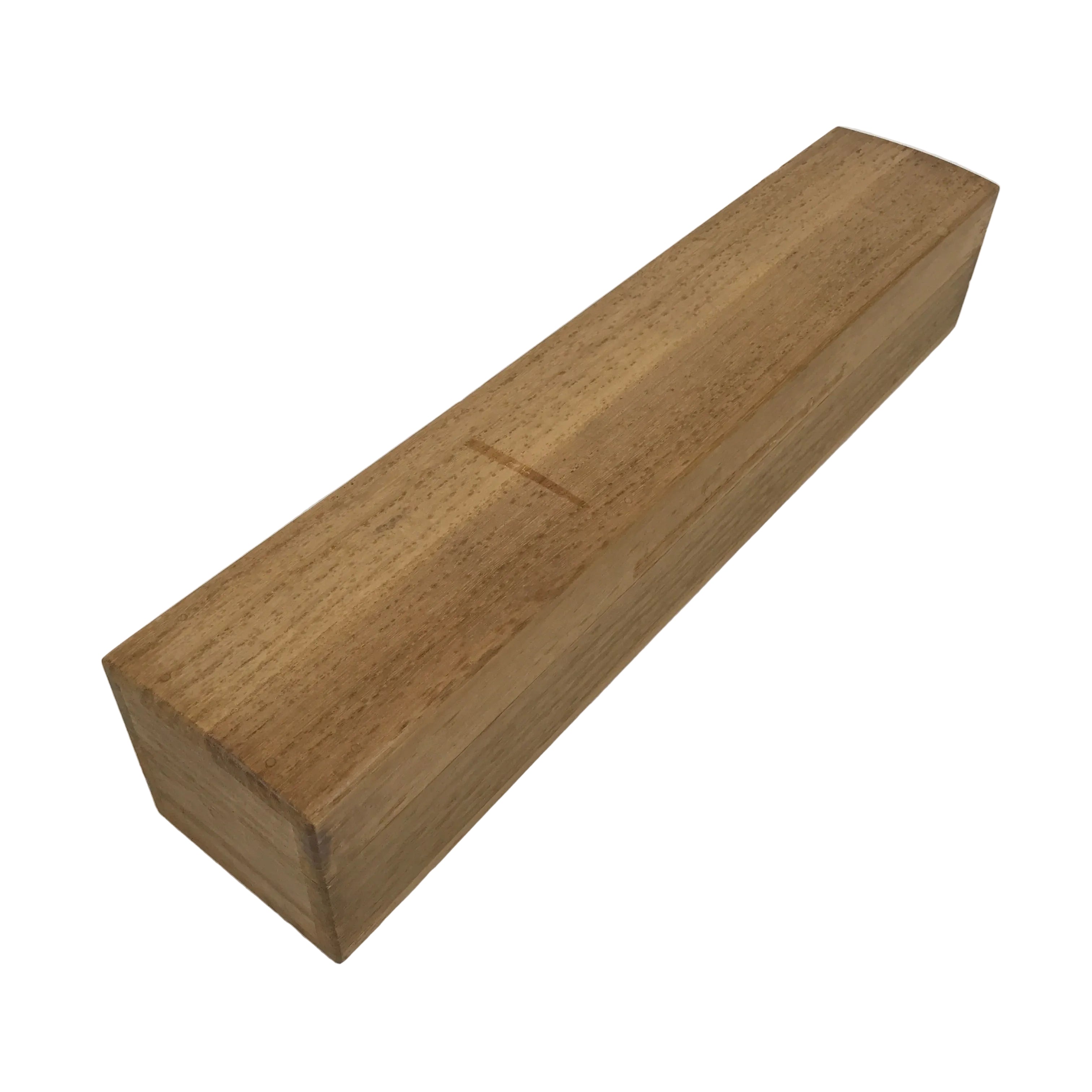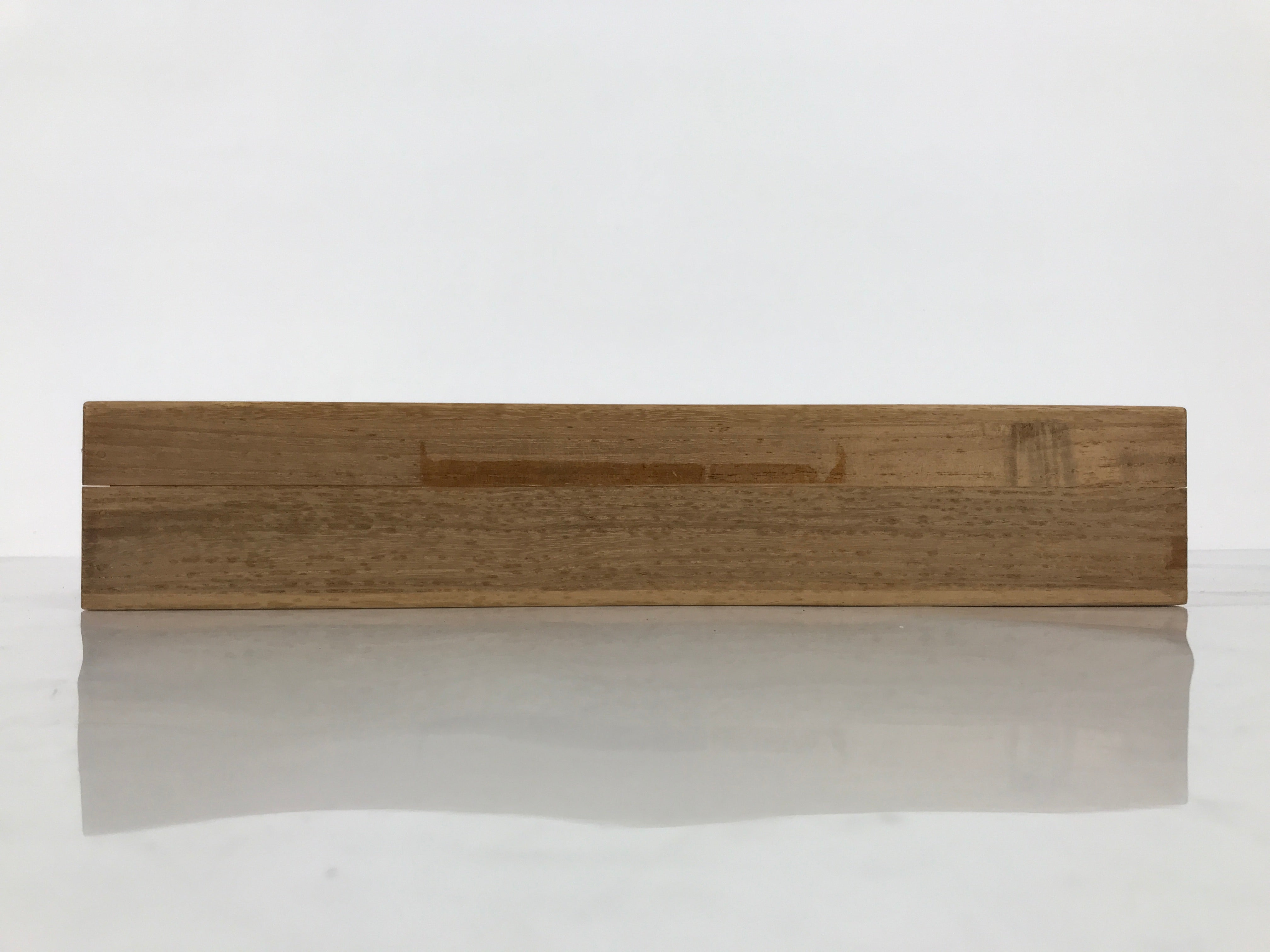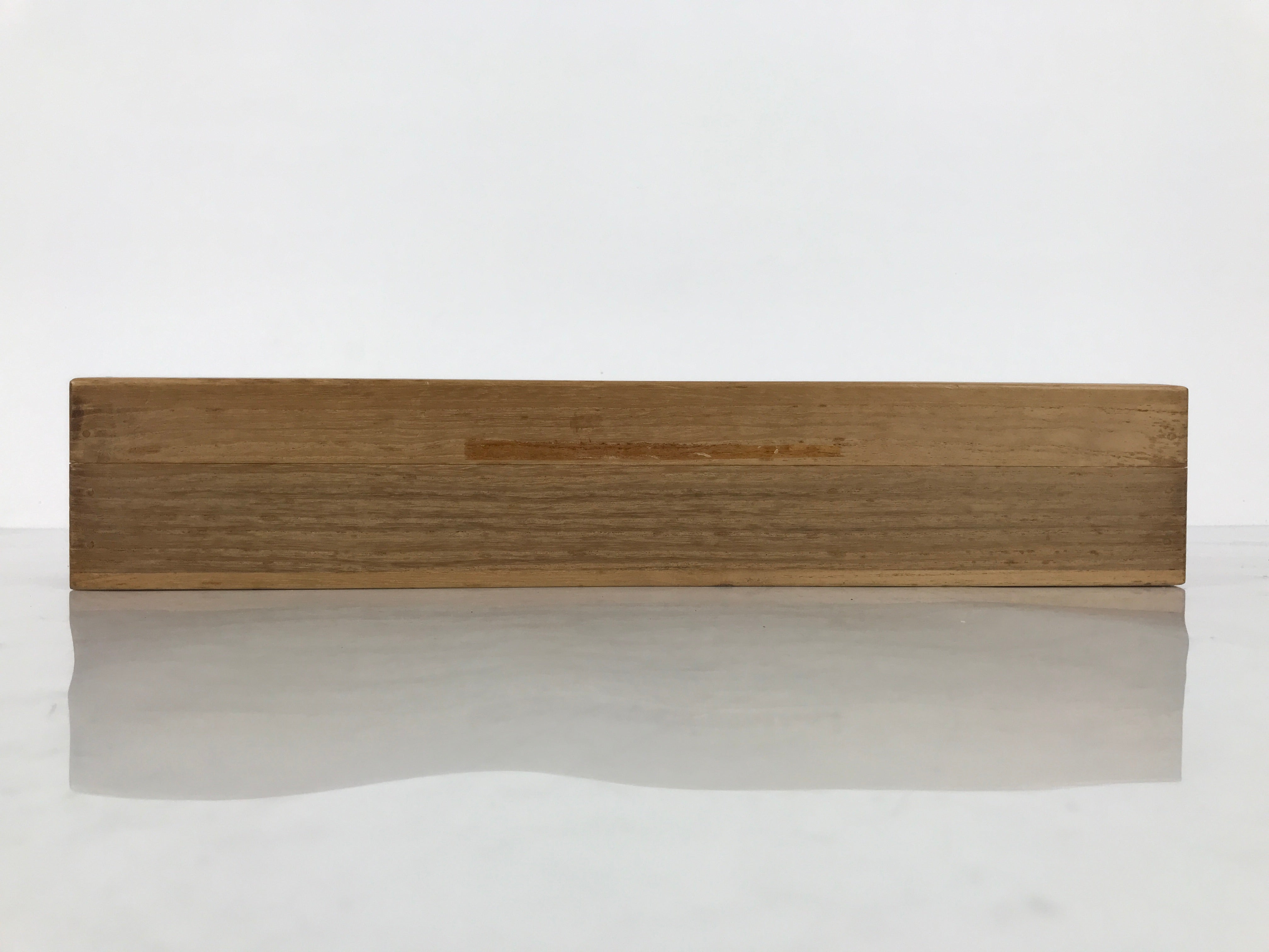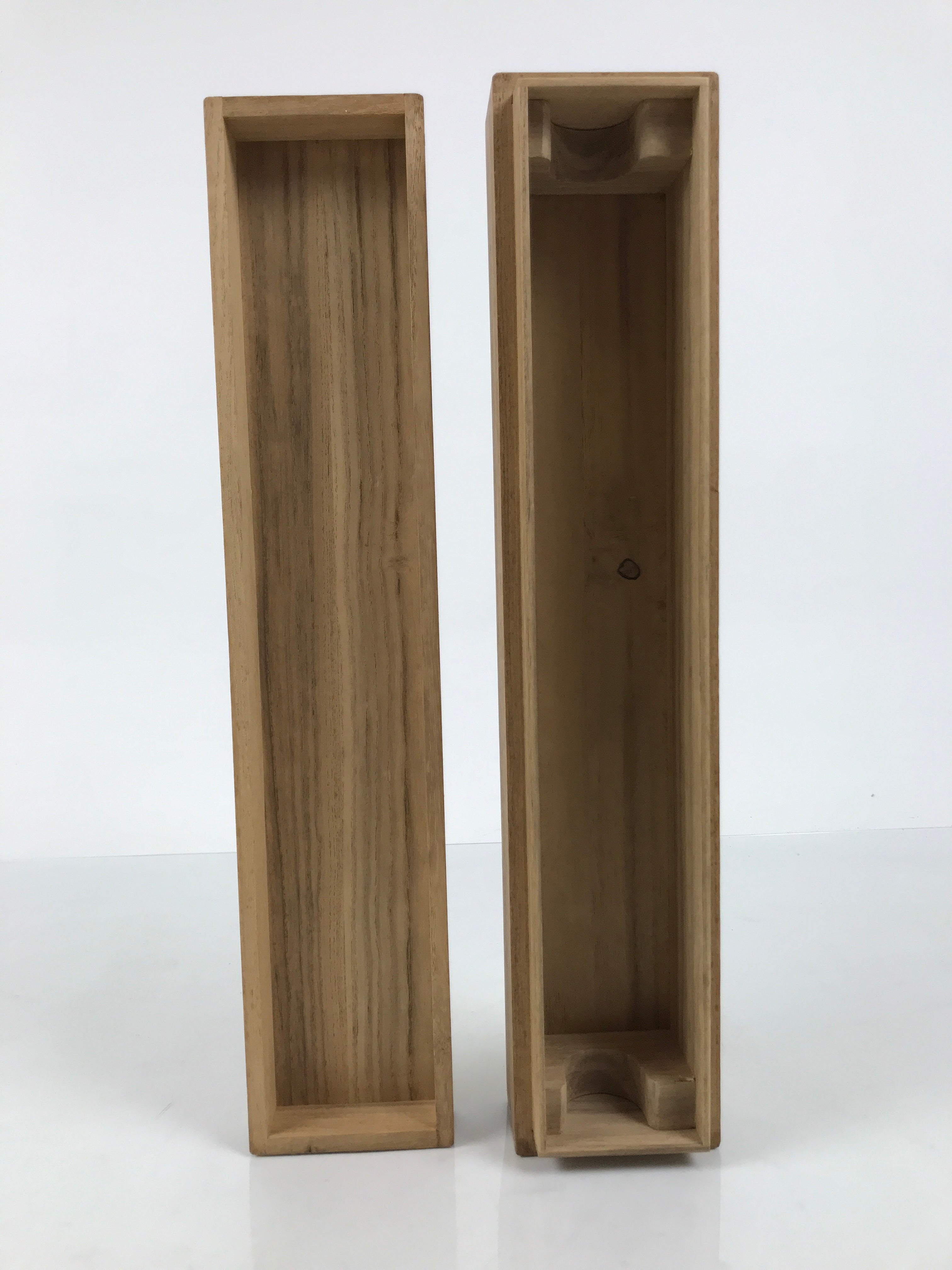 Hand-crafted and in a natural wood color, this sturdy, slender box is made to store a hanging scroll, or kakejiku. The lid fits flush on the top. It has two wooden brackets inside the box to secure the scroll. This specific box has no inscriptions.