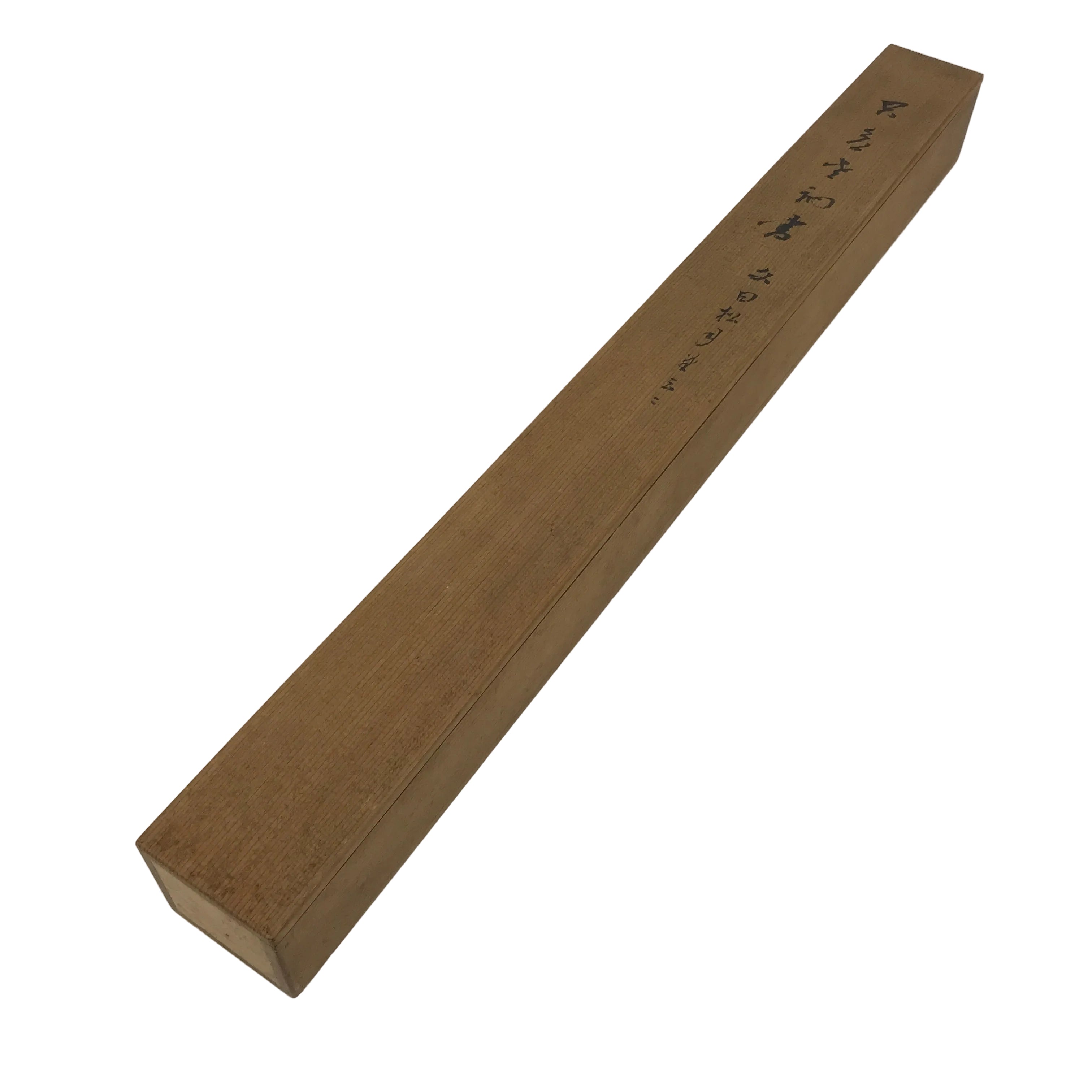 Hand-crafted and in a natural wood color, this sturdy, slender box is made to store a hanging scroll, or kakejiku. The lid sits on the top. It has two wooden brackets inside the box to secure the scroll. This specific box has inscriptions on the top and on the bottom of the lid.