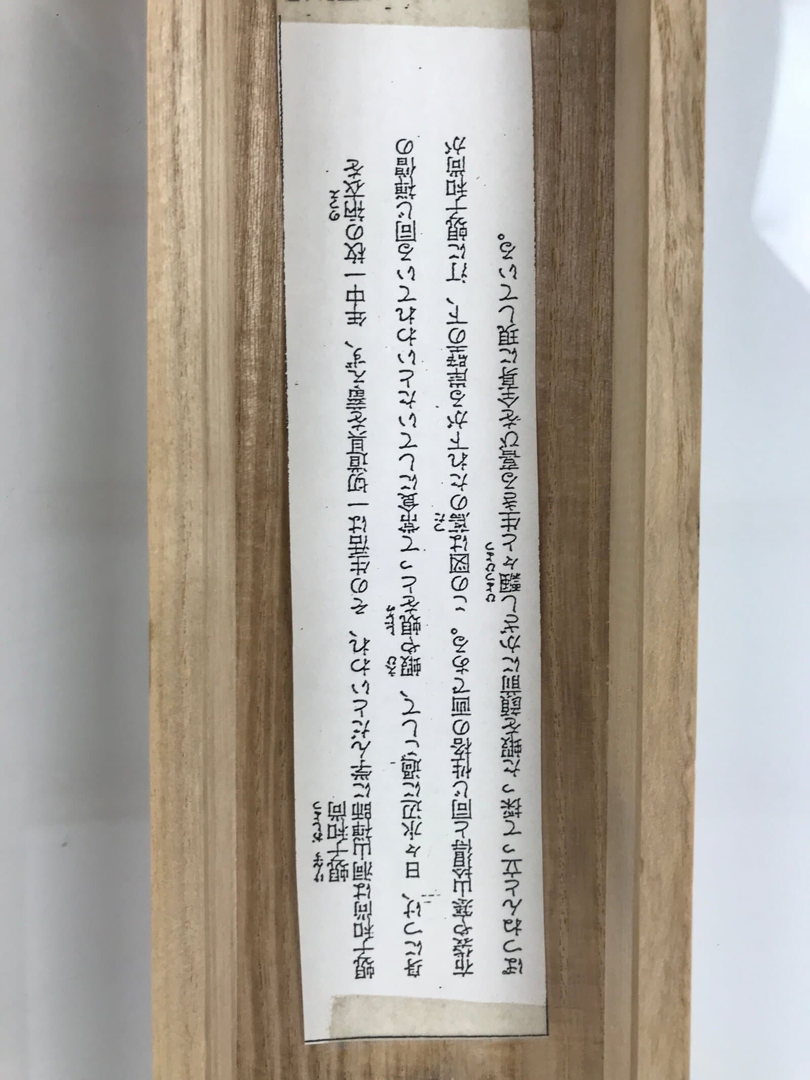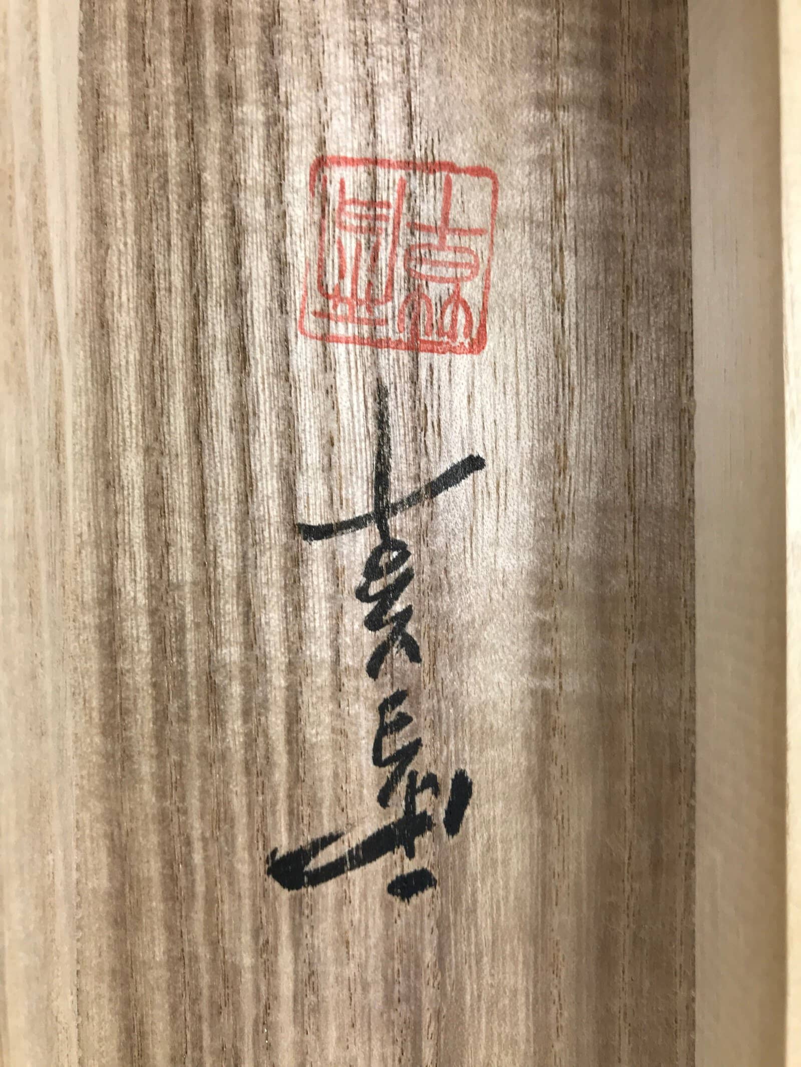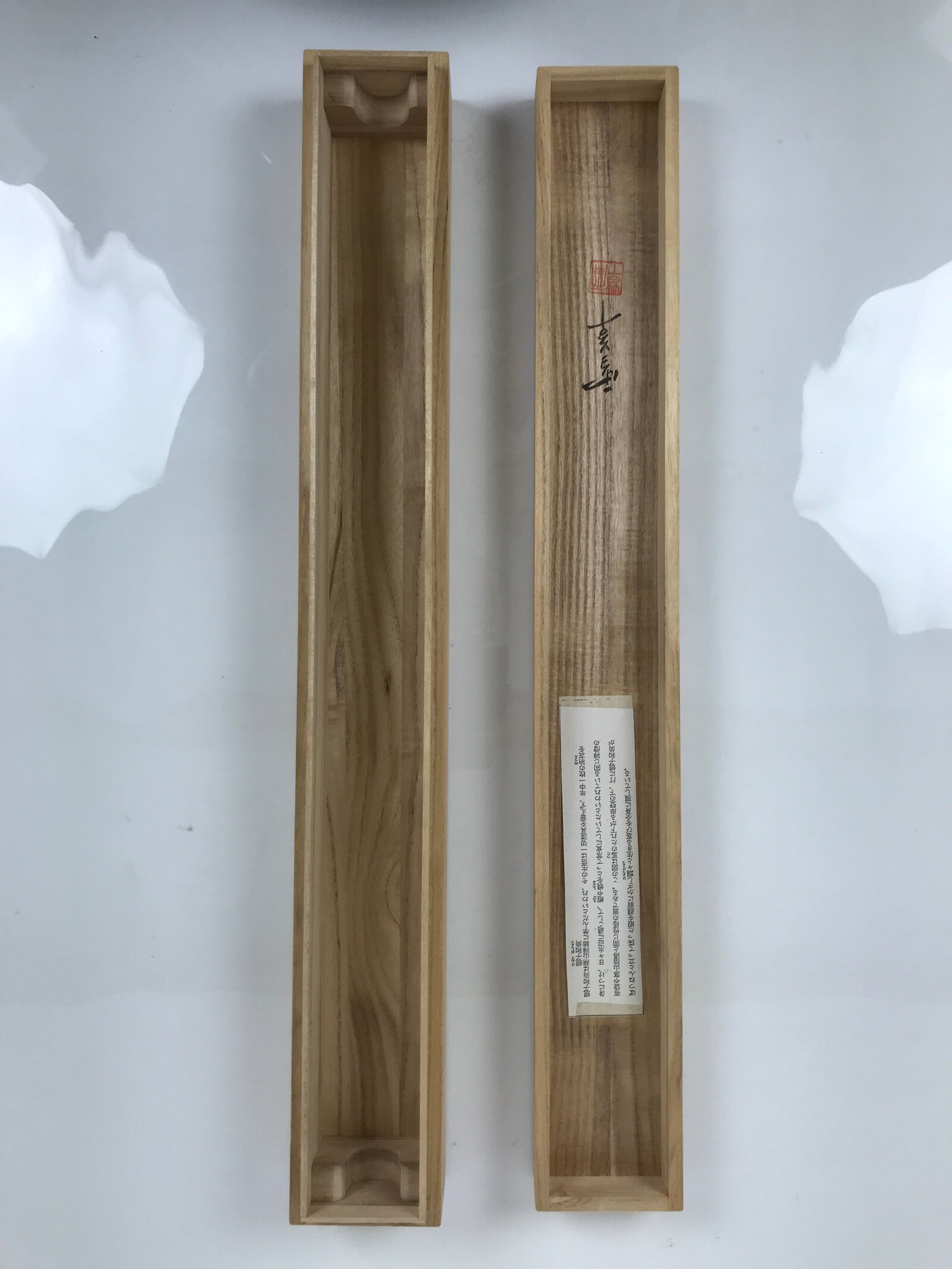 Hand-crafted and in a natural wood color, this sturdy, slender box is made to store a hanging scroll, or kakejiku. The lid fits flush on the top. It has two removable brackets inside the box to secure the scroll. This specific box has inscriptions on the top and on the inside of the lid. There is a label with printed characters inside the lid.