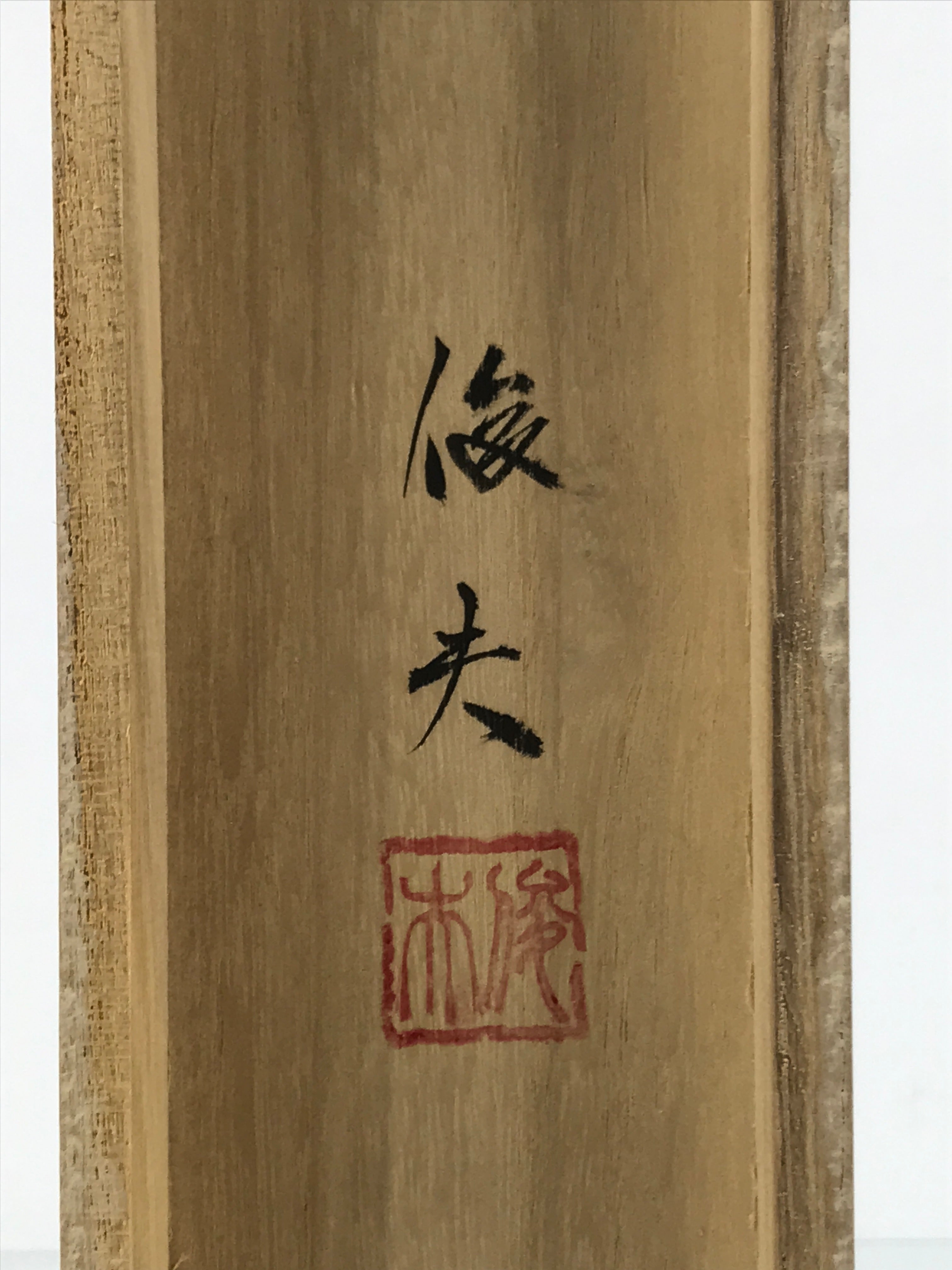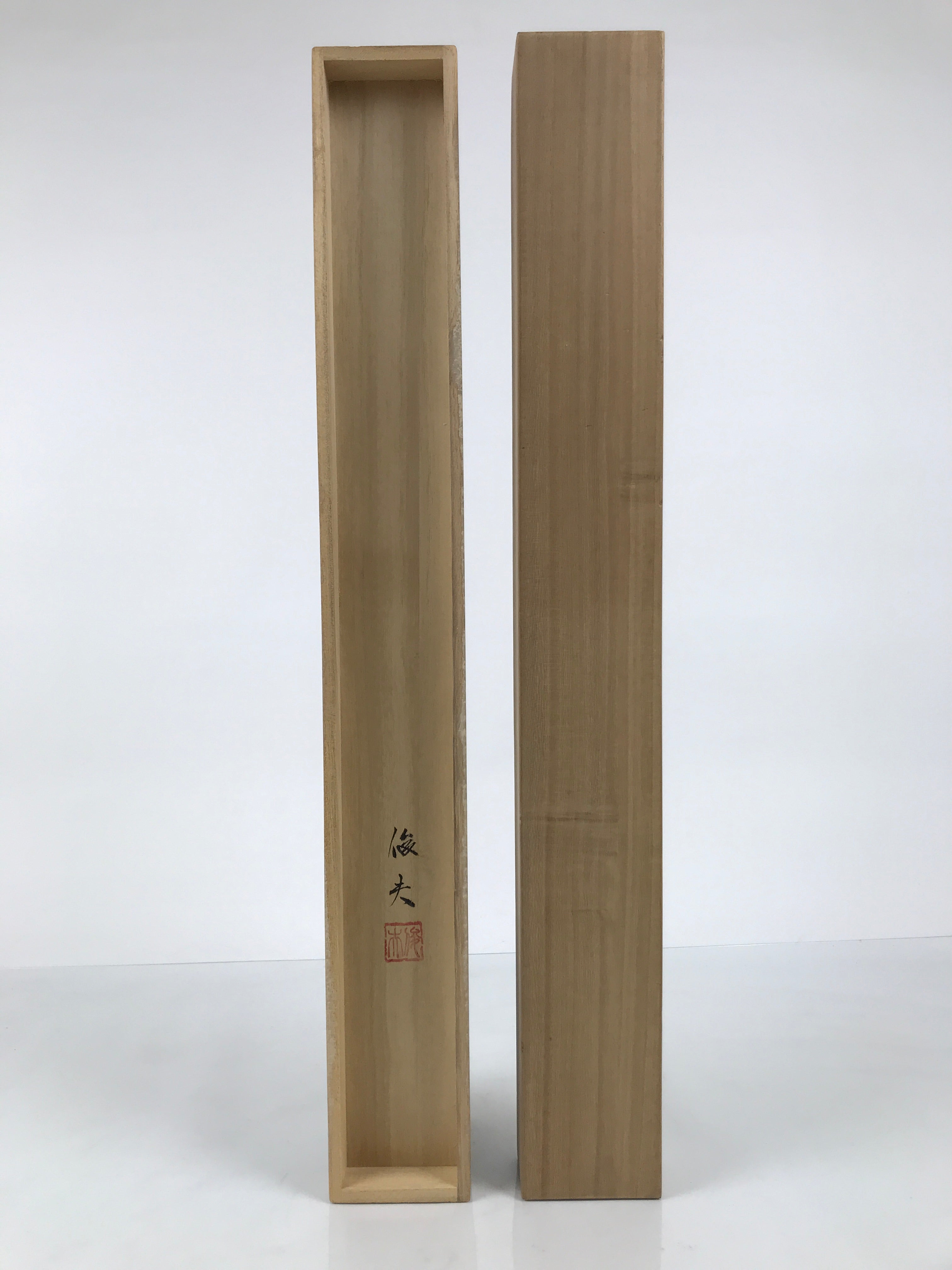 Hand-crafted and in a natural wood color, this sturdy, slender box is made to store a hanging scroll, or kakejiku. The lid fits flush on the top. It has two removable wooden brackets inside the box to secure the scroll. This specific box has inscriptions on the top, and a red seal and a sign on the inside of the lid.