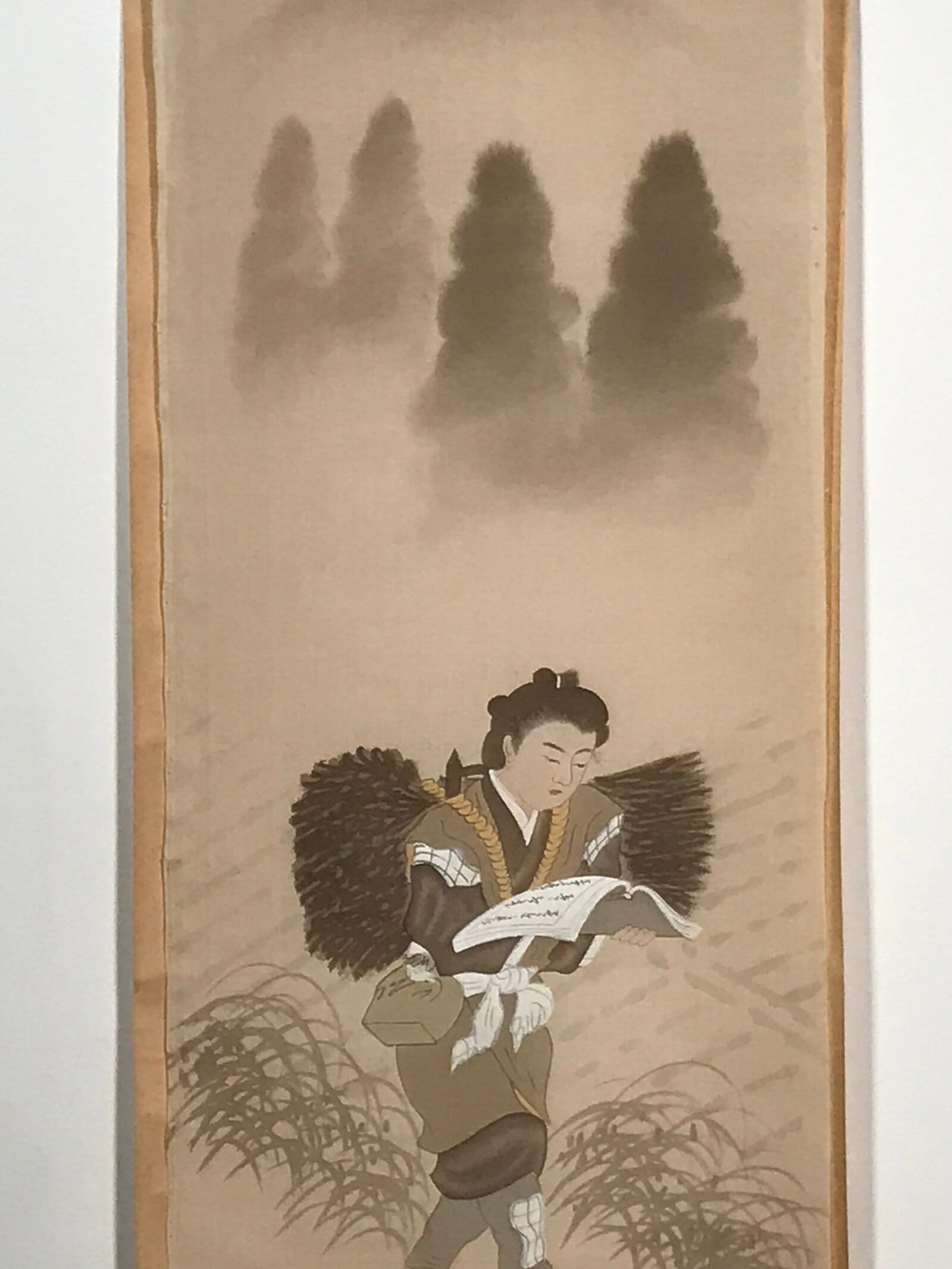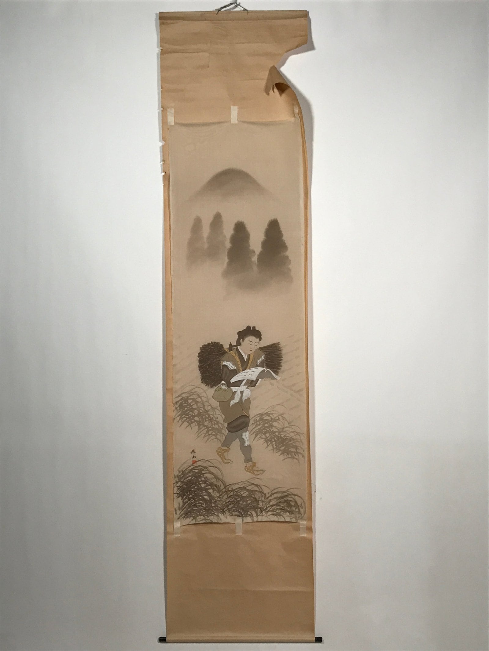 This vintage Japanese hanging scroll (kakejiku or makimono) features a young man reading while carrying a bundle of twigs in the countryside. It is likely a portrait of Ninomiya Sontoku, a Japanese agriculturist whose statues have been installed in many schools in Japan. This piece is signed with a name and a red seal.