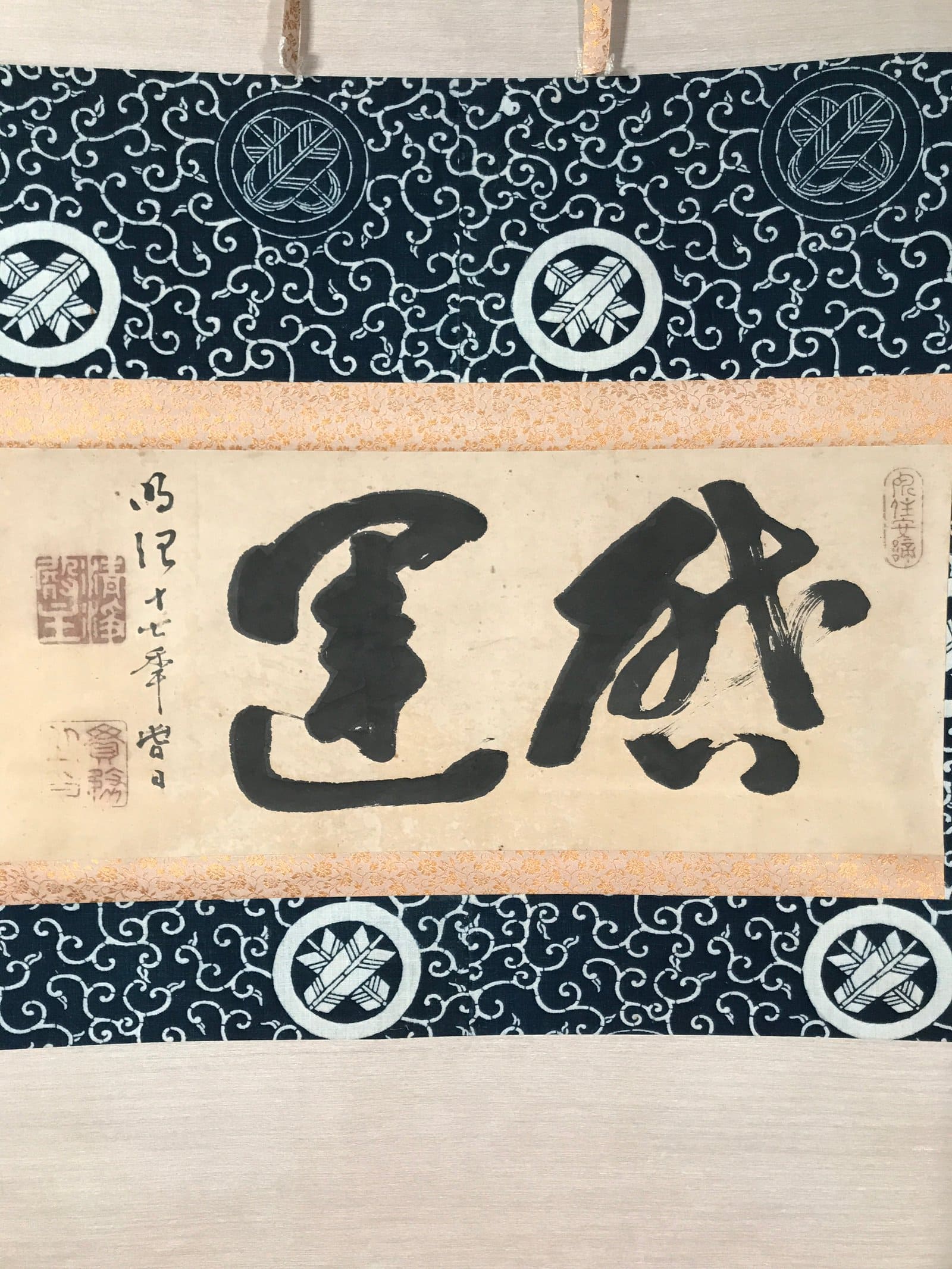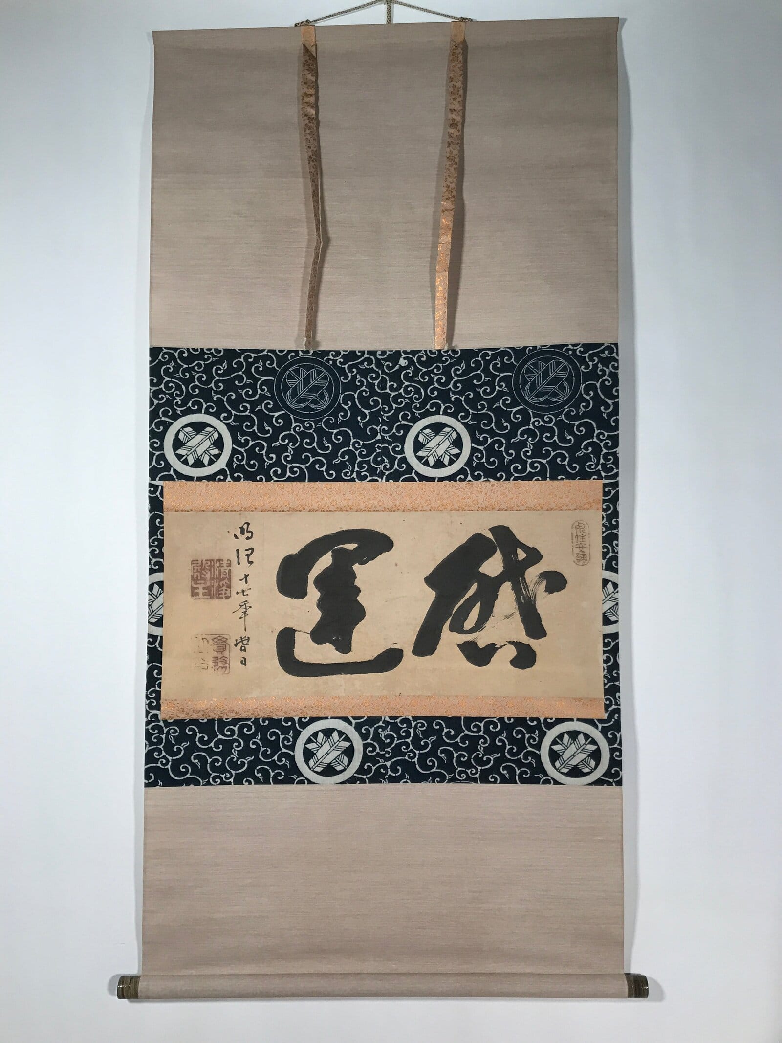 This vintage Japanese hanging scroll (kakejiku or makimono) features calligraphy in black ink with two big bold characters. This piece is signed with names and red seals. The base of the scroll features family crests with arrows.