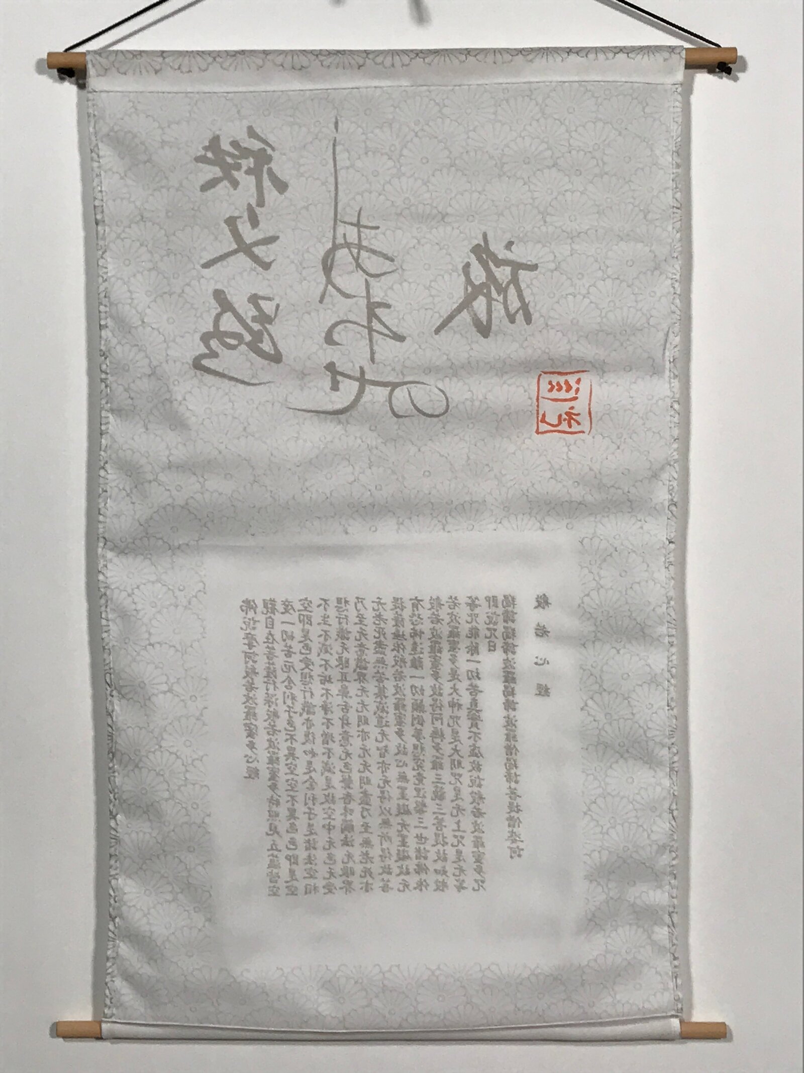 This vintage Japanese hanging scroll (kakejiku or makimono) features the Heart Sutra on the bottom and some inscriptions on the top. It has a beautiful white chrysanthemum pattern on the background. This scroll is a souvenir from a pilgrimage.