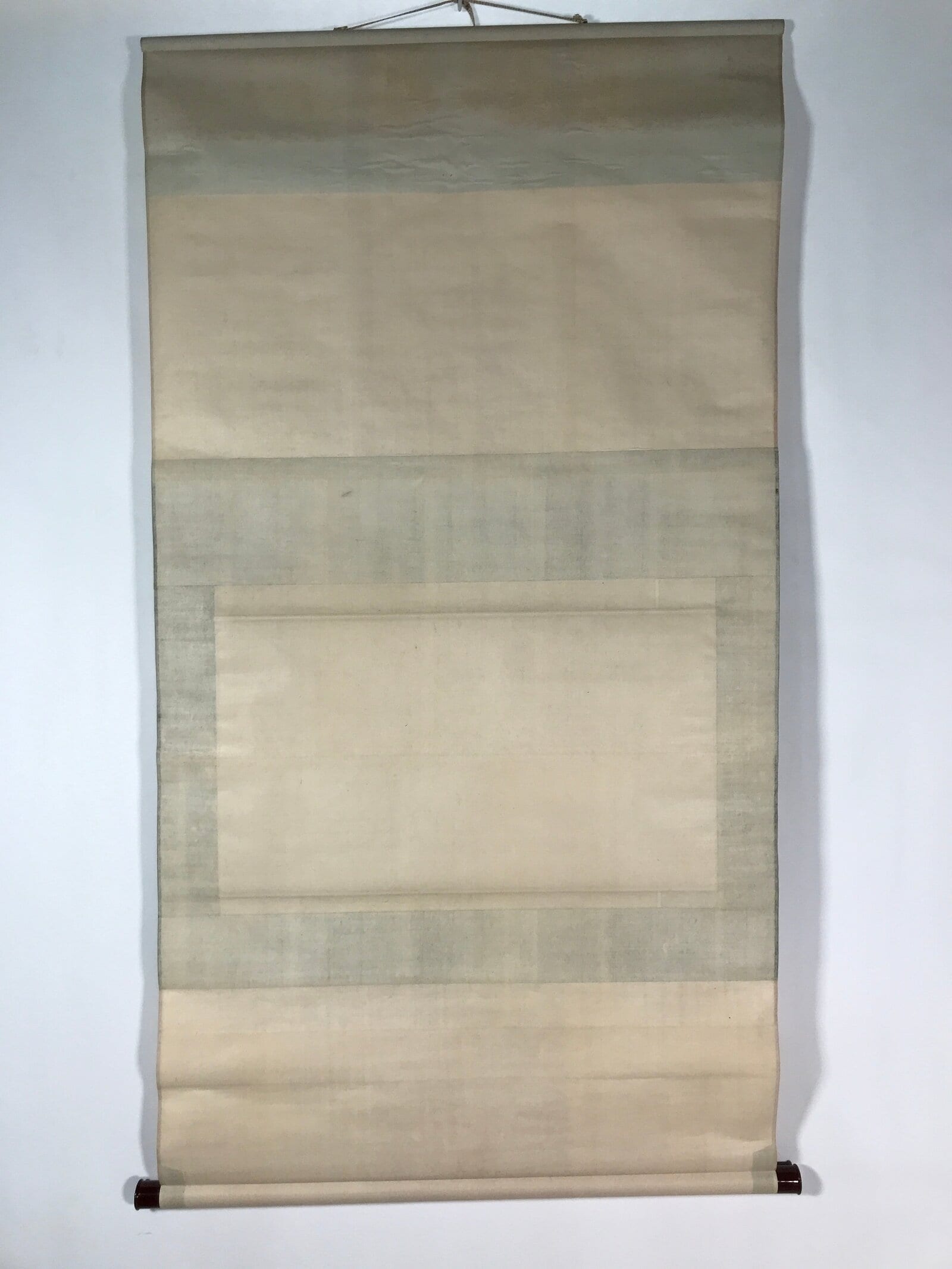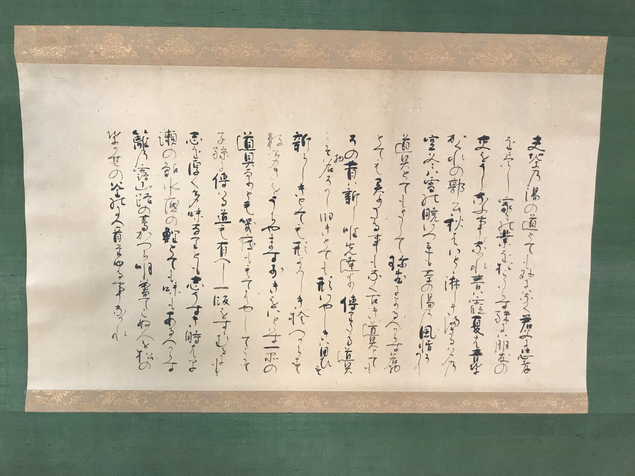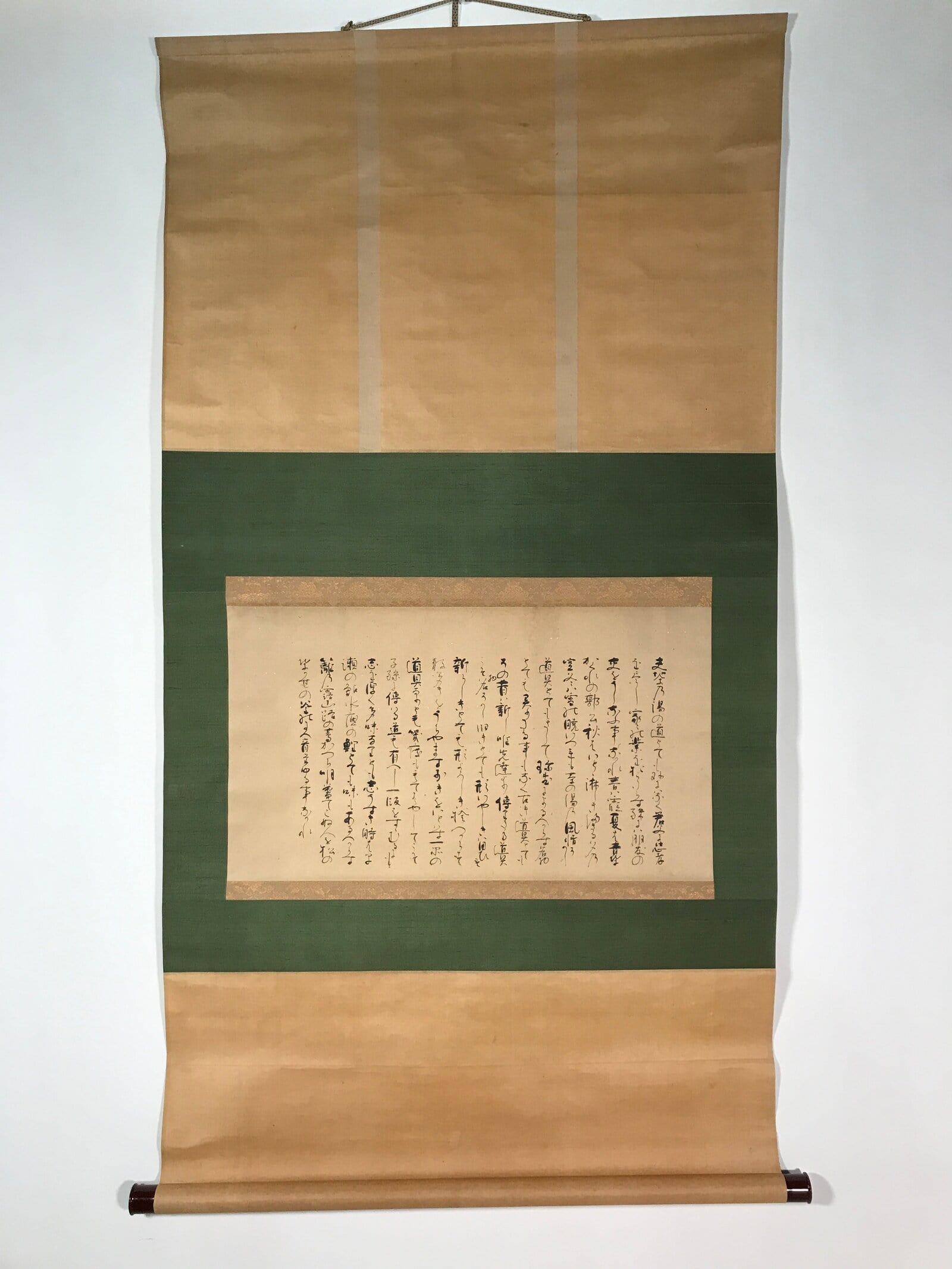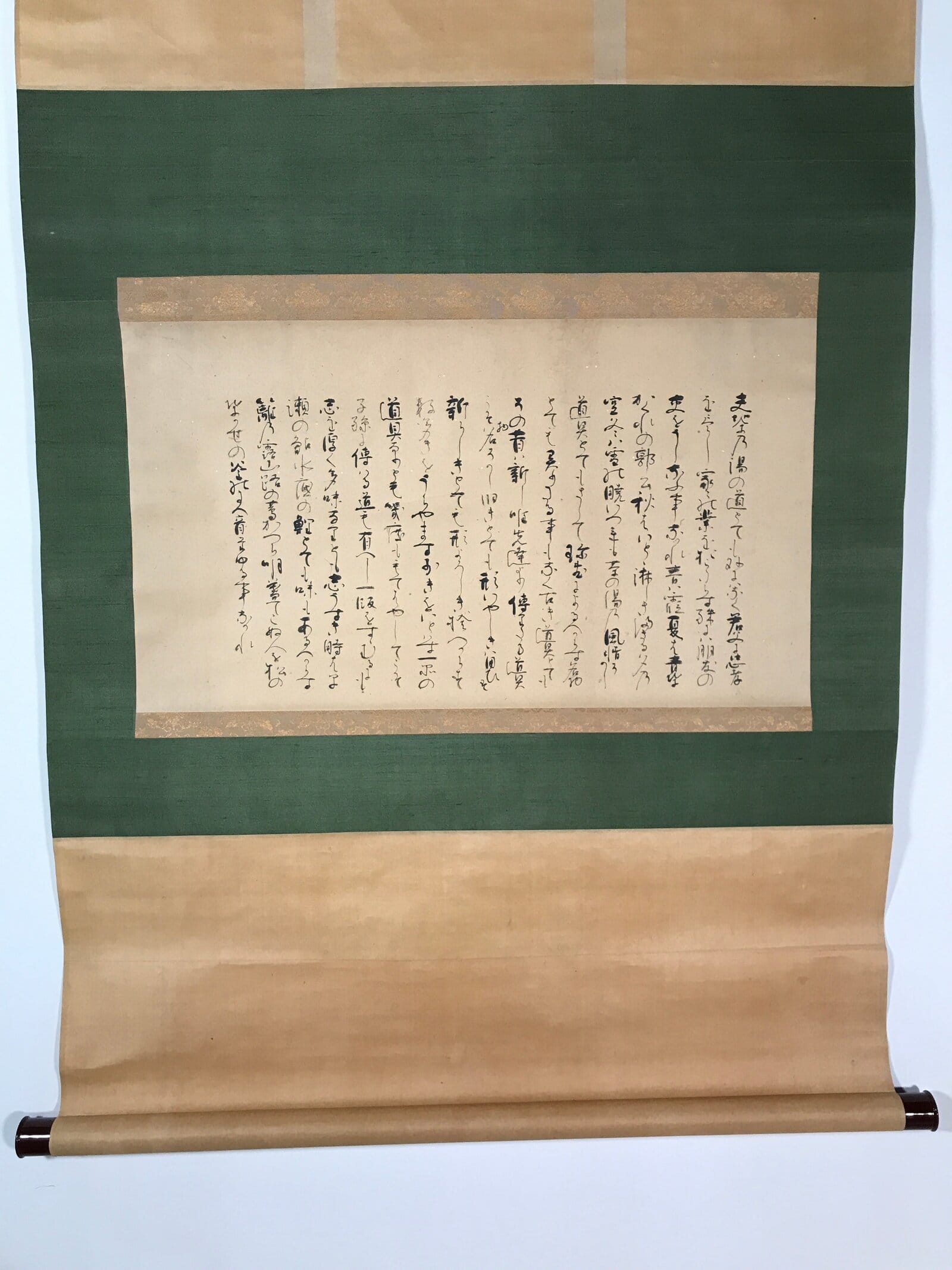 This vintage Japanese hanging scroll (kakejiku or makimono) features calligraphy of a text. The scroll base is green.