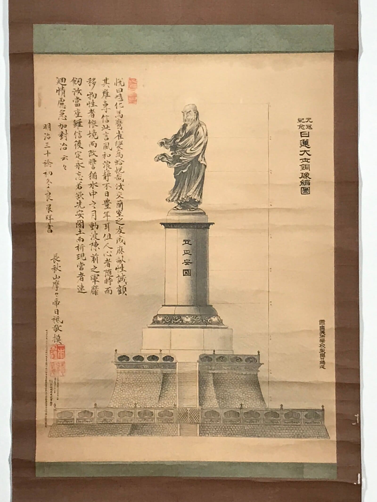 This vintage Japanese hanging scroll (kakejiku or makimono) features an illustration of a statue of Nichiren, a Japanese Buddhist priest and philosopher of the Kamakura period. This paper was made to commemorate the statue’s construction. There are words on the left. This piece is signed with a name and red seals.
