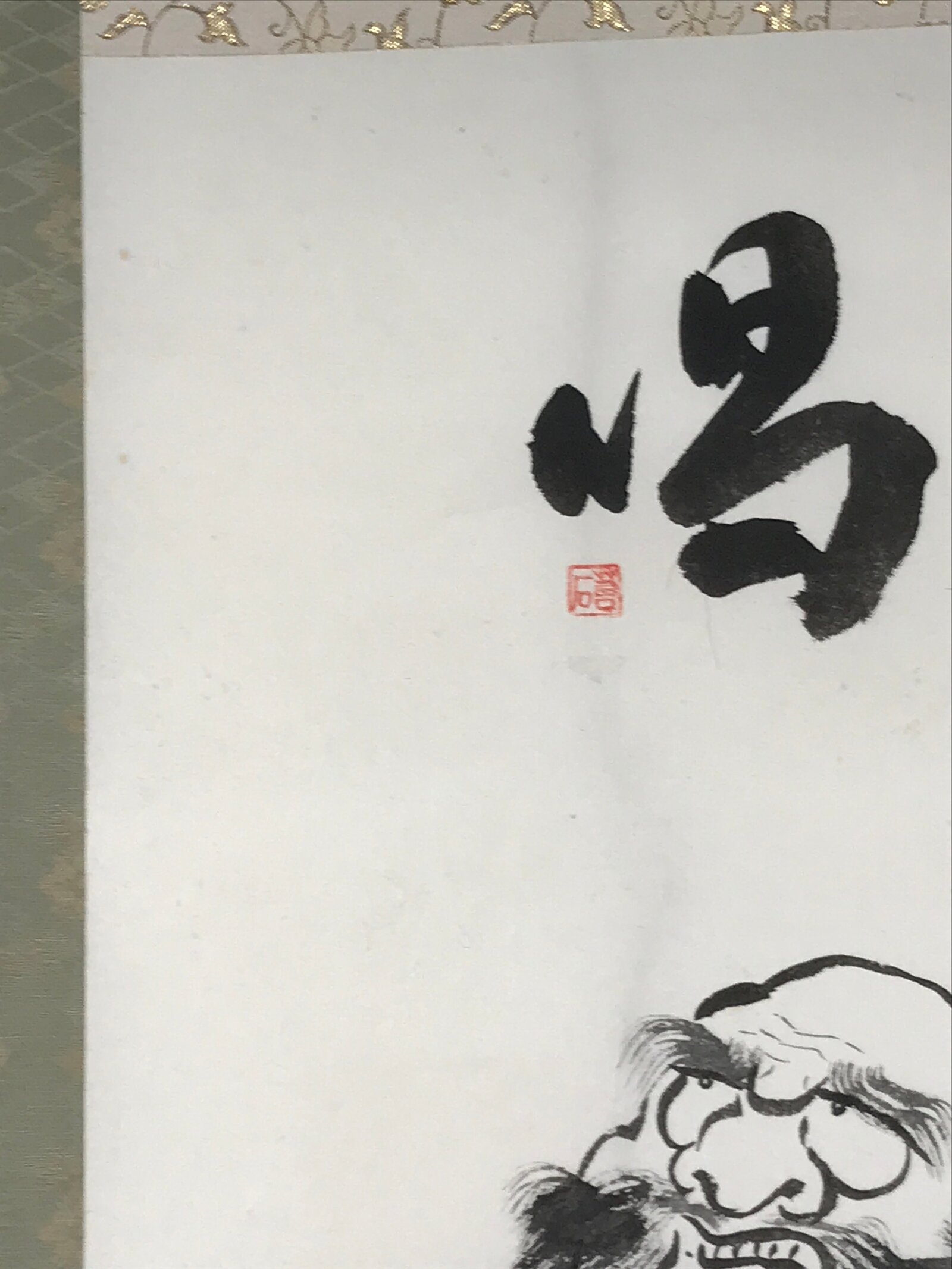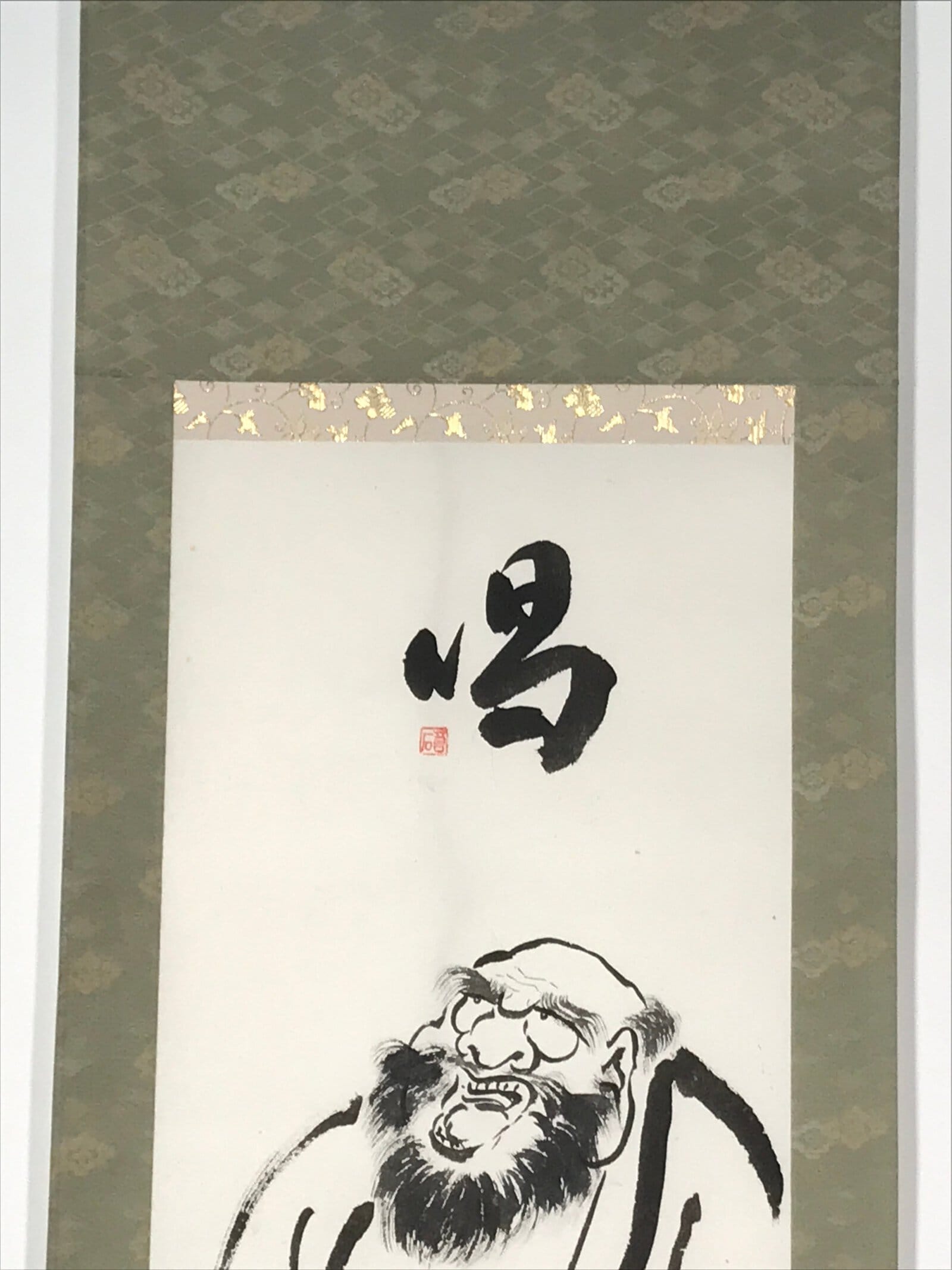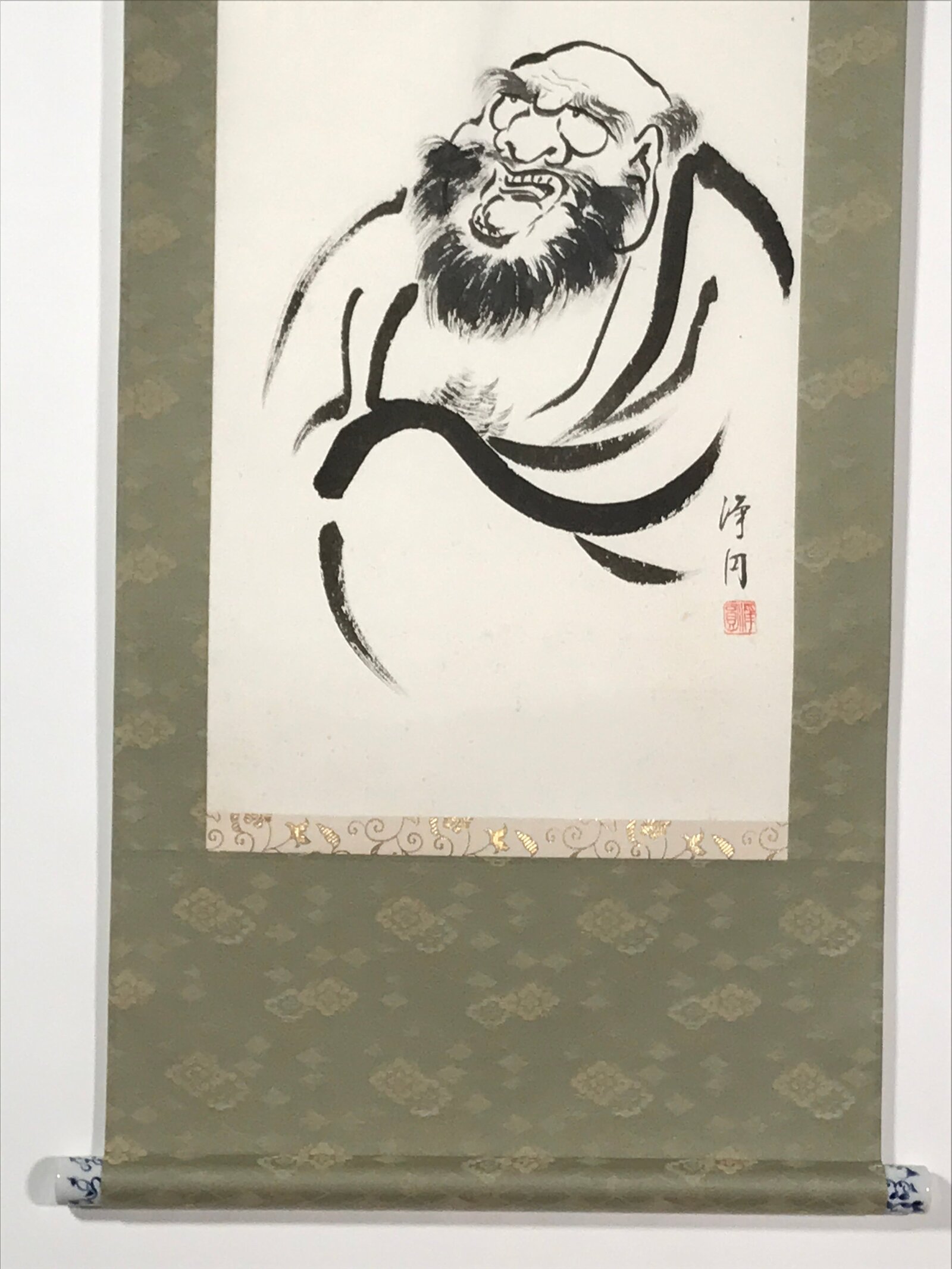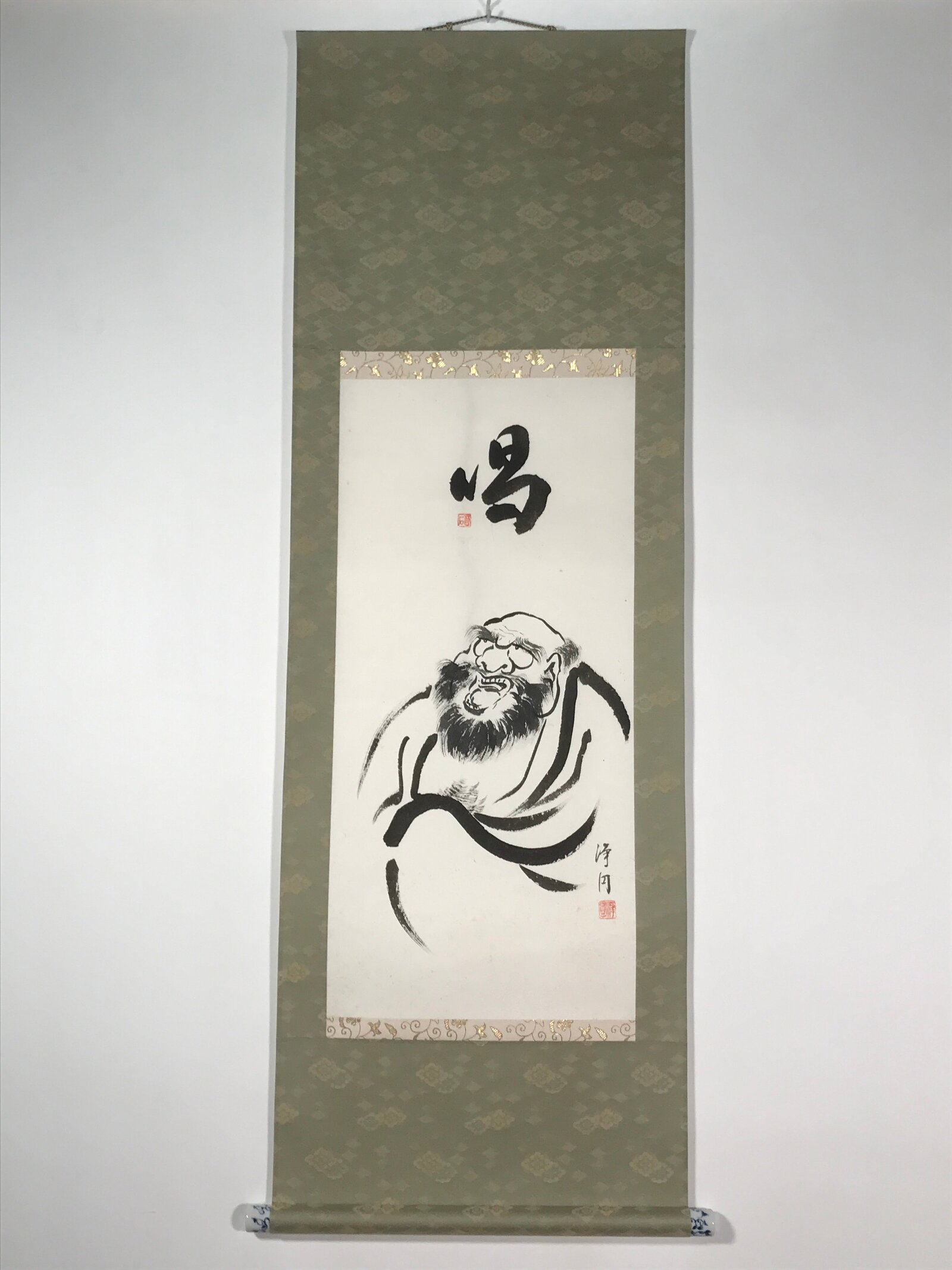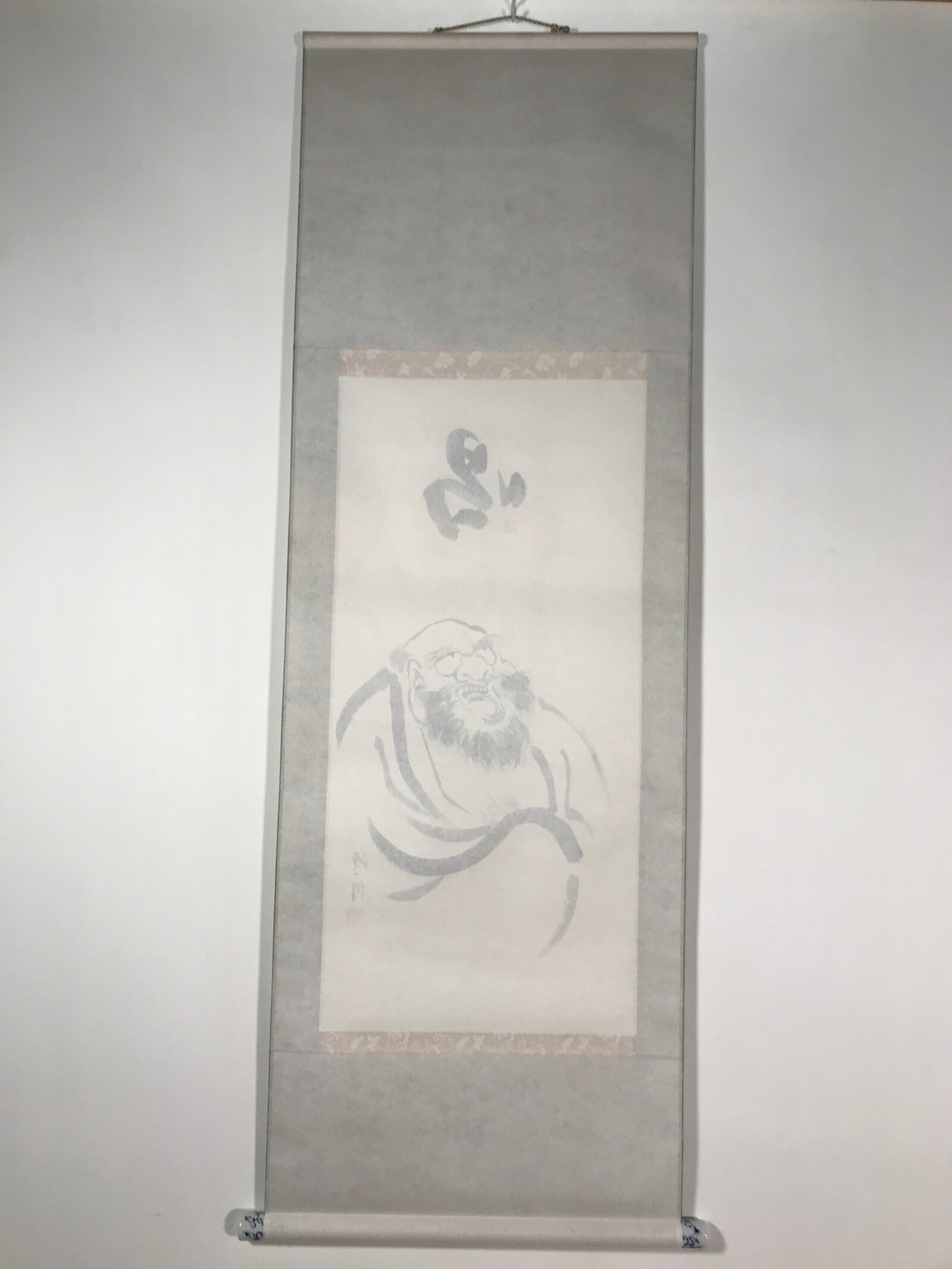 This vintage Japanese hanging scroll (kakejiku or makimono) features a black-and-white portrait of Daruma (Bodhidharma), a Japanese monk. There is a big character painted in black at the top. This piece is signed and has red seals. The ends are white and blue.