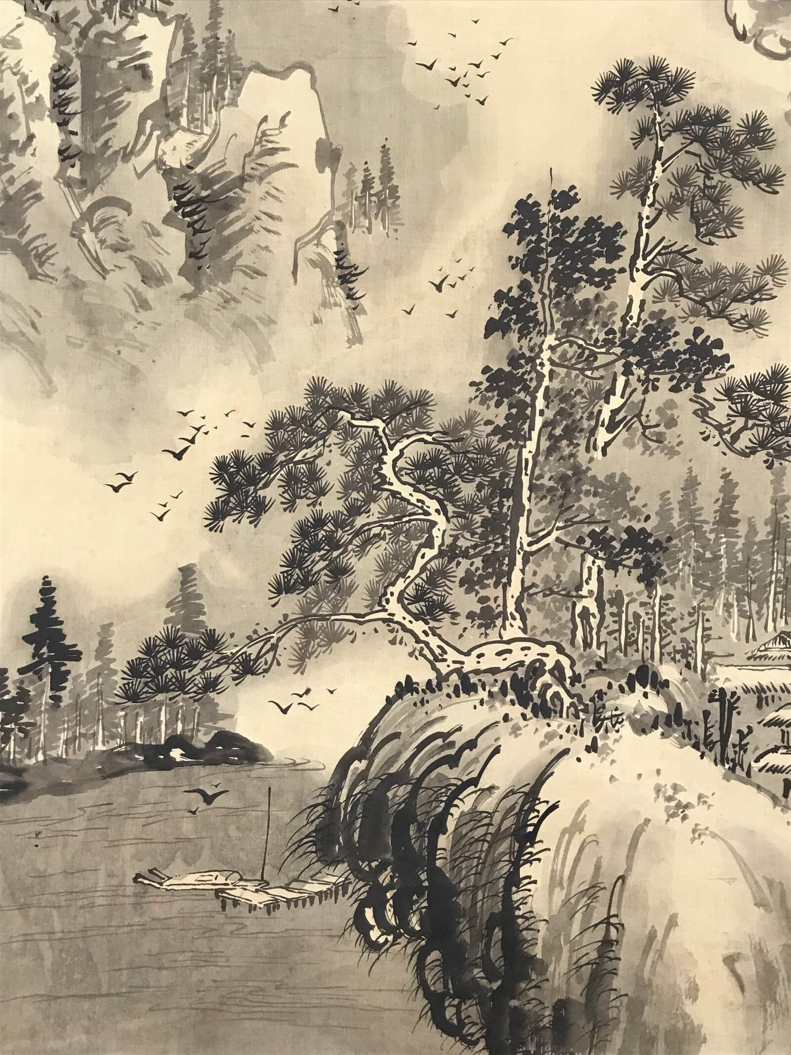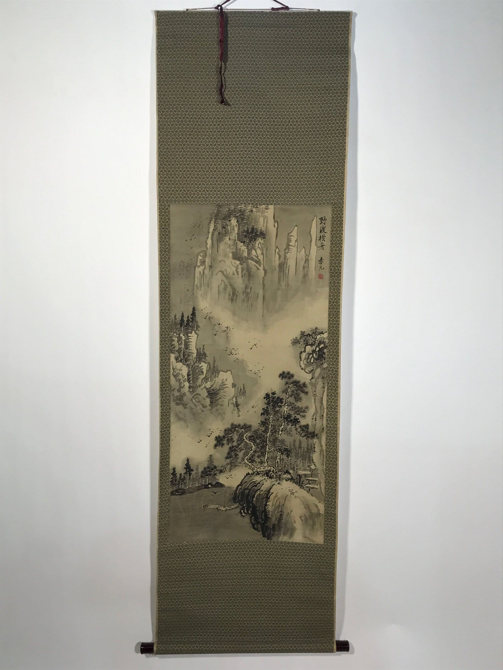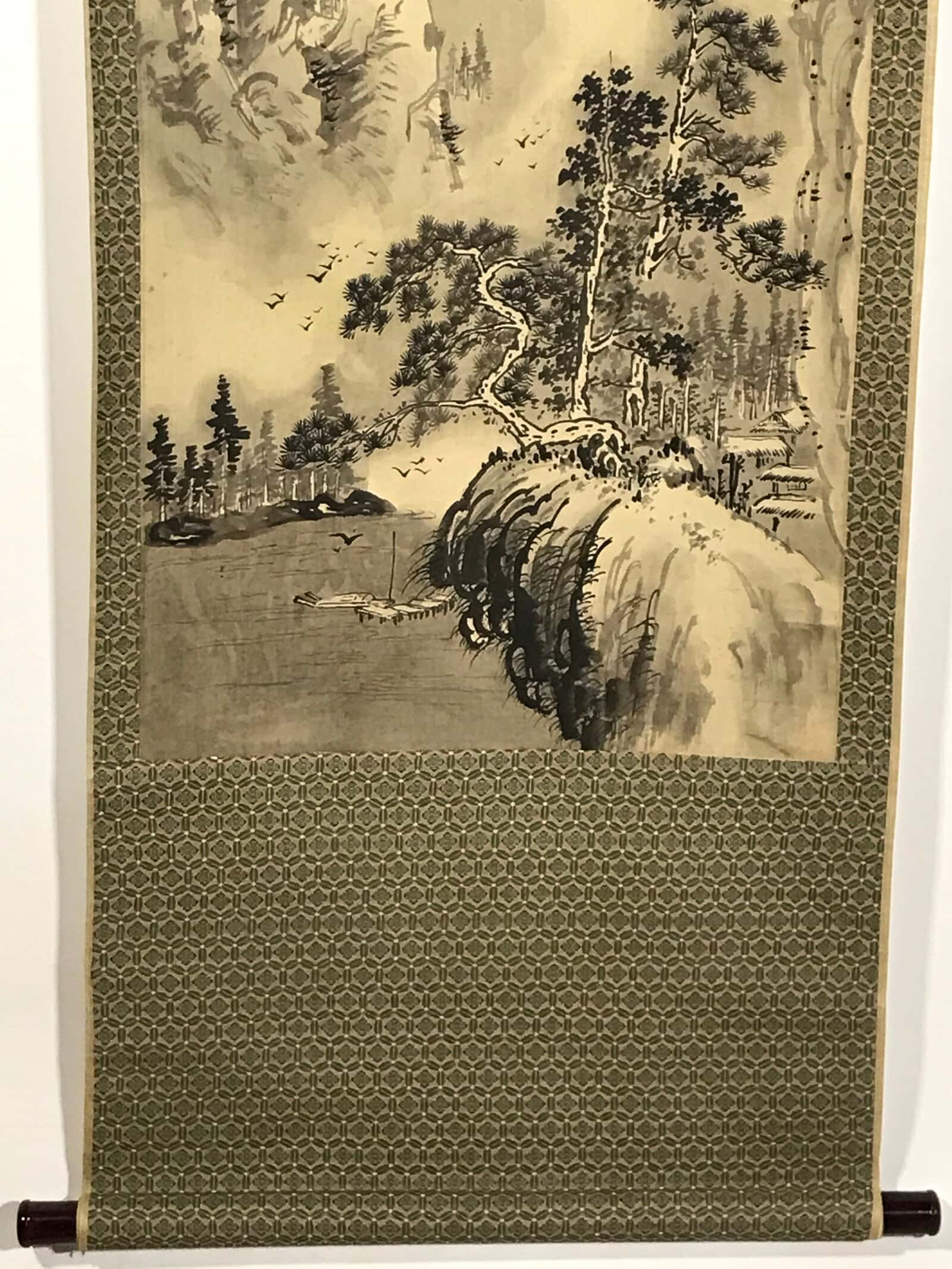 This vintage Japanese hanging scroll (called kakejiku or makimono) features a landscape with high mountains and trees. There are flying birds, and a river with some houses in the foreground. This type of kakejiku is called sansui, meaning mountains and water. It is painted in black. This piece is titled and signed with a name and a red seal. There is a label with the title and the name of the artist on the outside of the scroll.