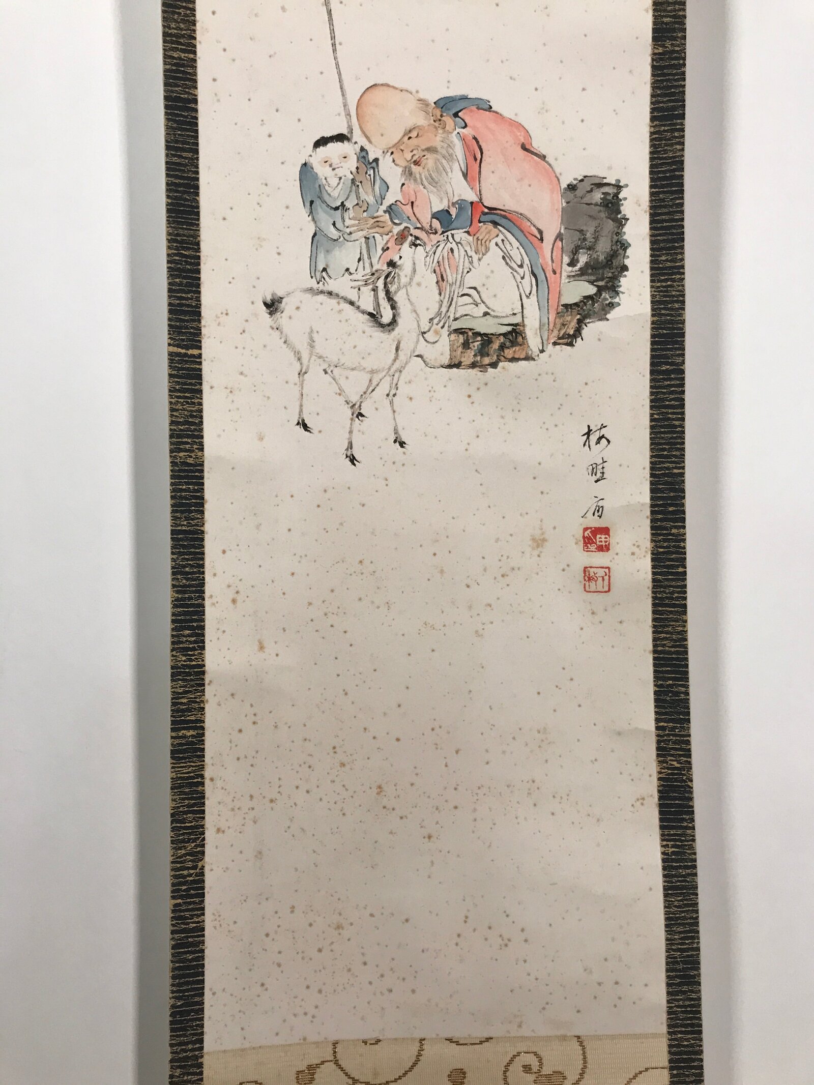 This vintage Japanese hanging scroll (kakejiku or makimono) features a picture of an old man with a prominent forehead looking at a goat or a white deer. There is a child, or possibly a creature, next to the man. This piece is signed with a name and a red seal.
