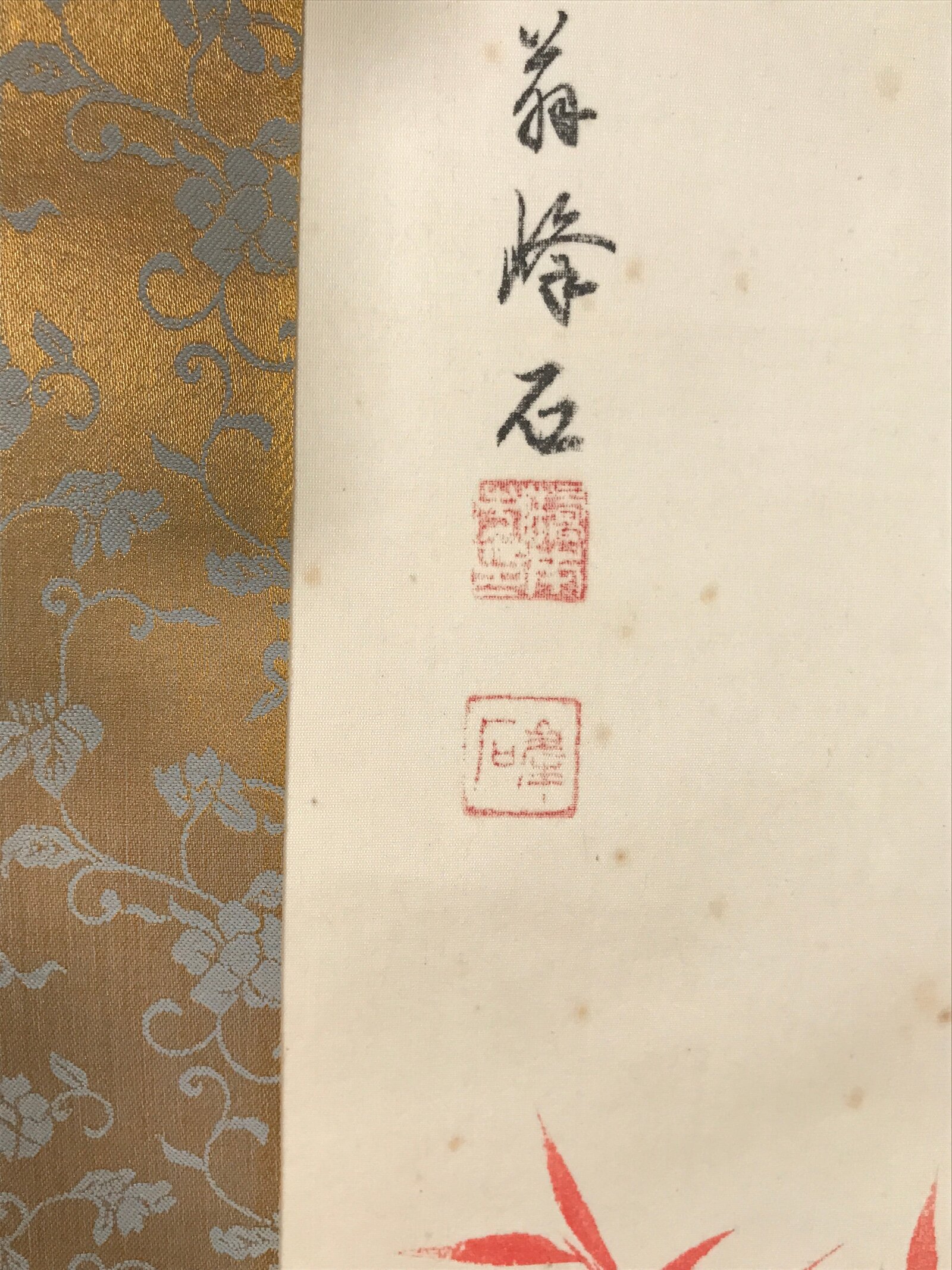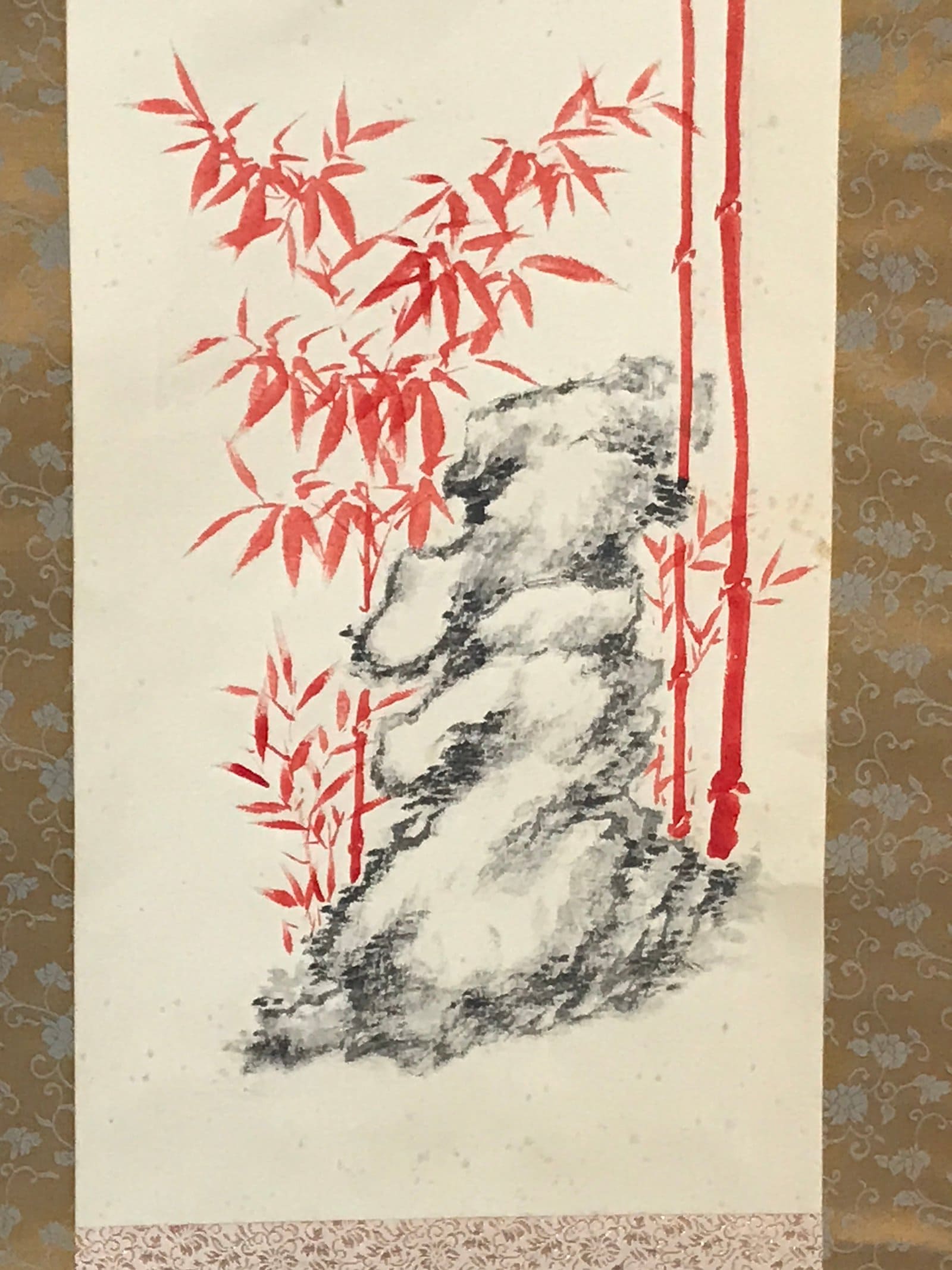 This vintage Japanese hanging scroll (kakejiku or makimono) features red bamboos and a black rock, possibly a sacred rock, with a calligraphy on the side. This piece is signed with red seals.