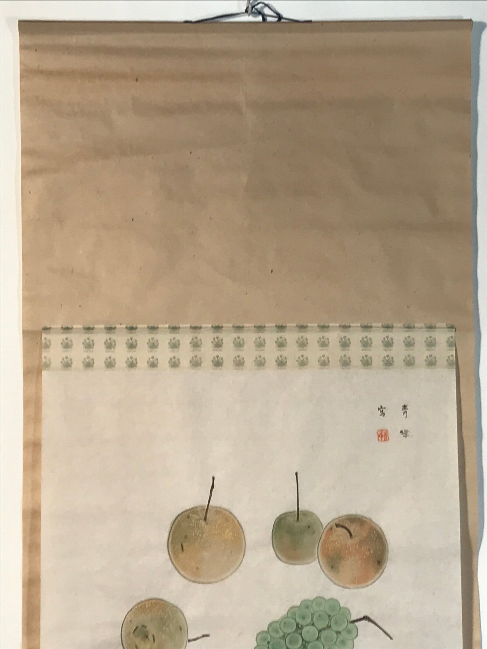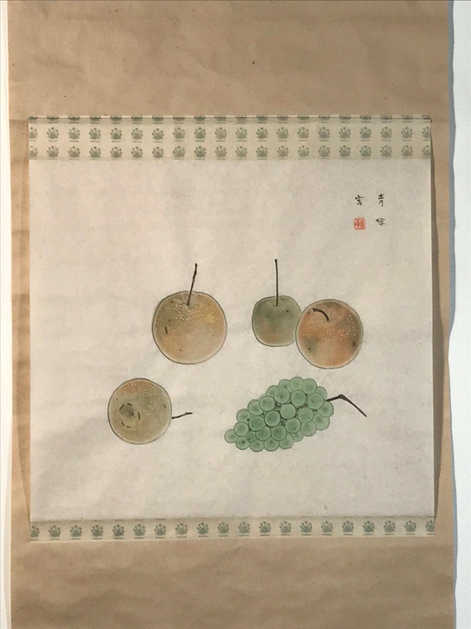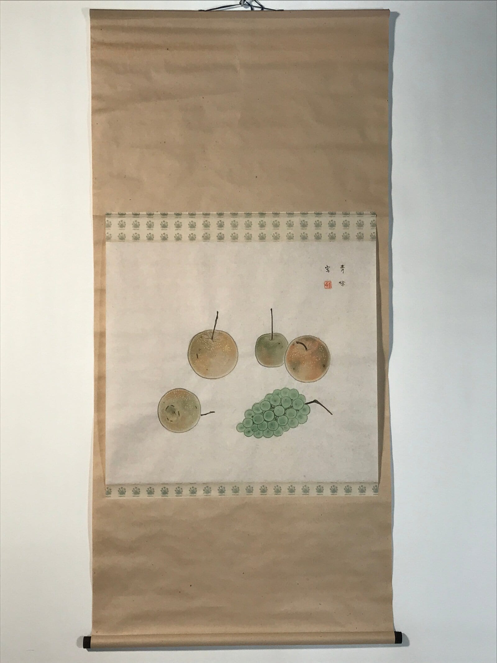 This vintage Japanese hanging scroll (kakejiku or makimono) features a still life artwork with nashi pears and grapes, mostly in brown and green. This piece is signed with a name and a red seal.