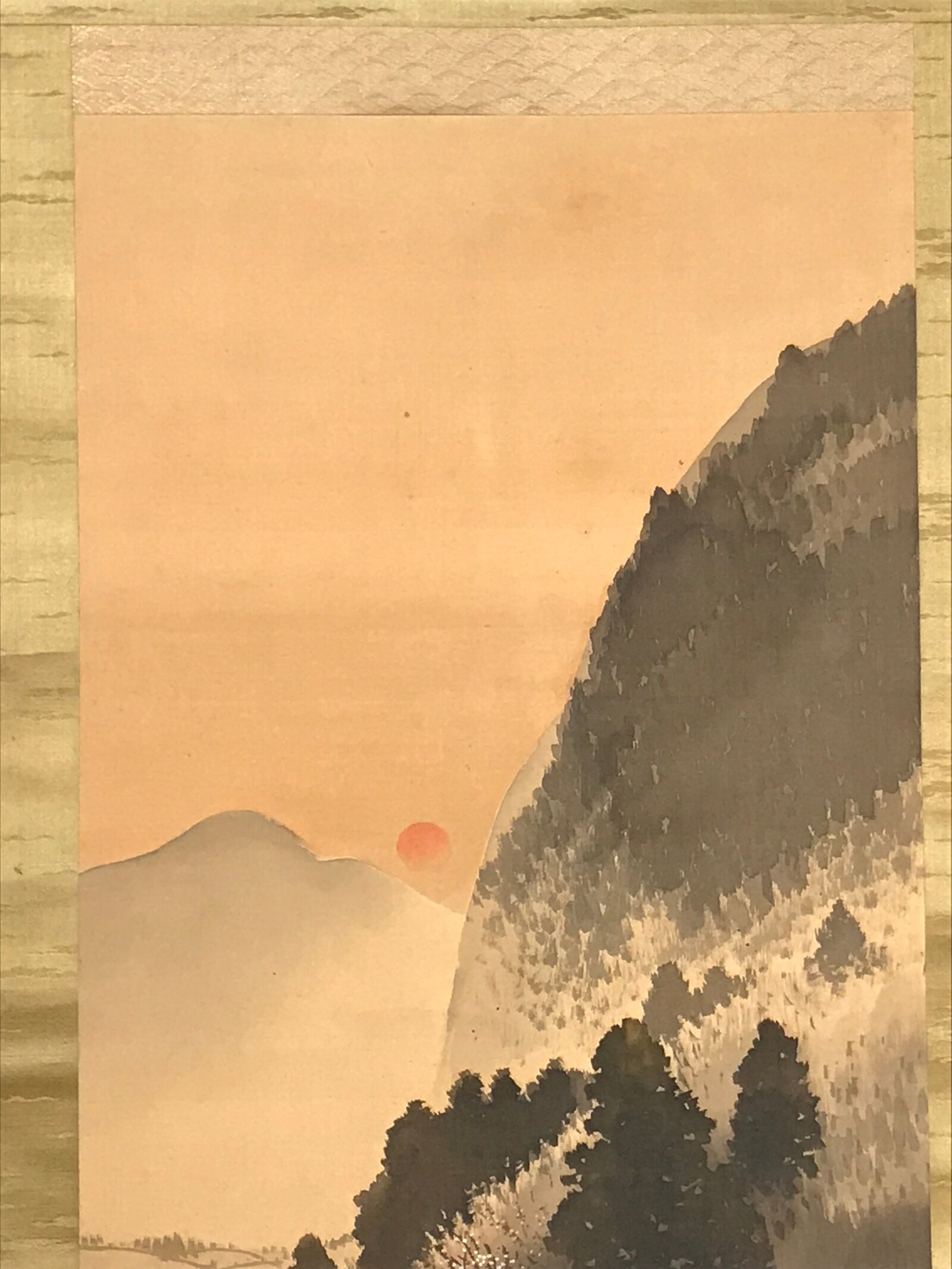 This vintage Japanese hanging scroll (called kakejiku or makimono) features a small village with few houses, surrounded by trees, and plum trees bearing blossoms within the mountain. The scene is painted at dawn: the red sun rises between the mountains. This piece is signed with a name.