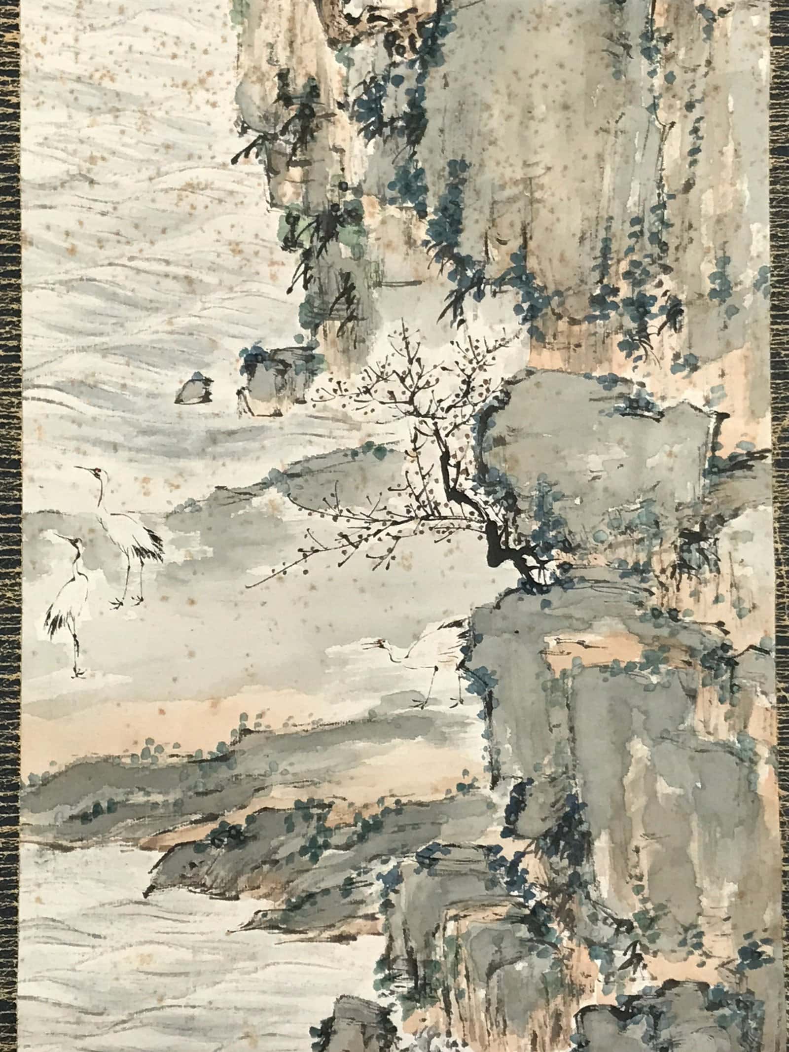 This vintage Japanese hanging scroll (called kakejiku or makimono) features a landscape with mountains, a river (or sea), and houses. This type of kakejiku is called sansui, literally mountains and water. It is painted in color and there are two cranes at the bottom. This piece is signed with a name and a red seal.
