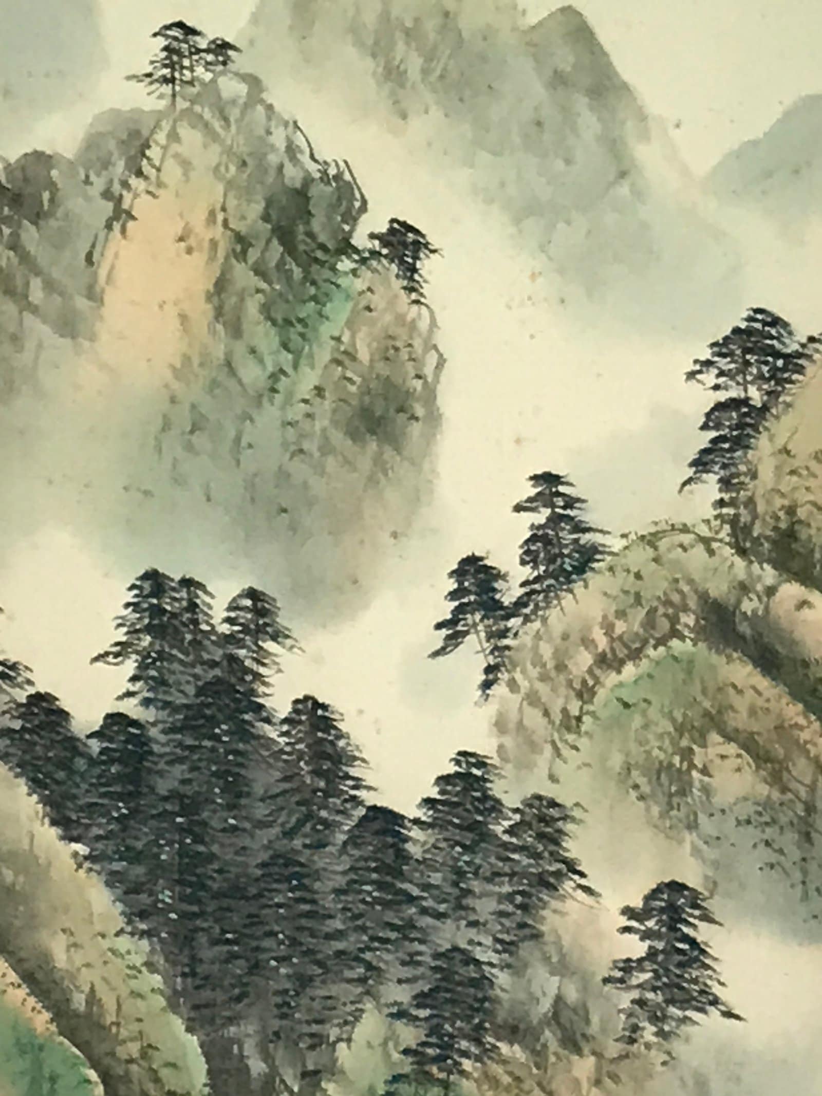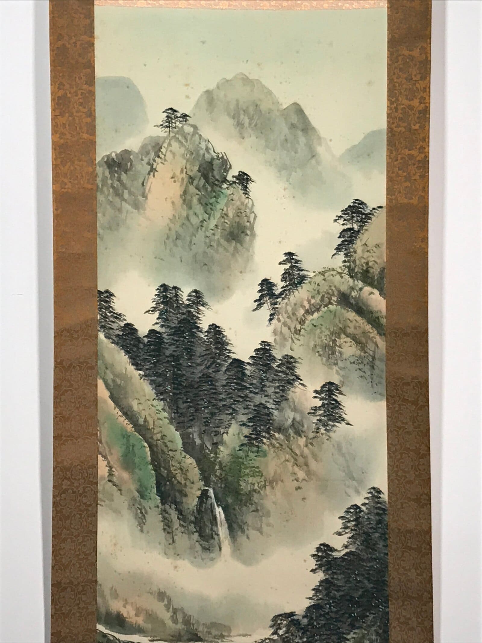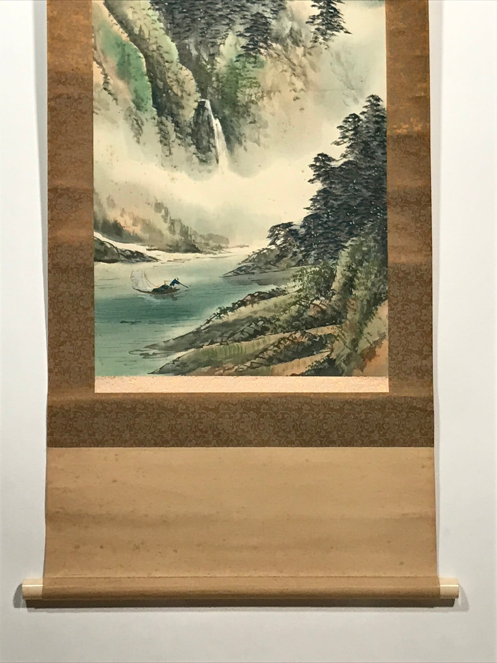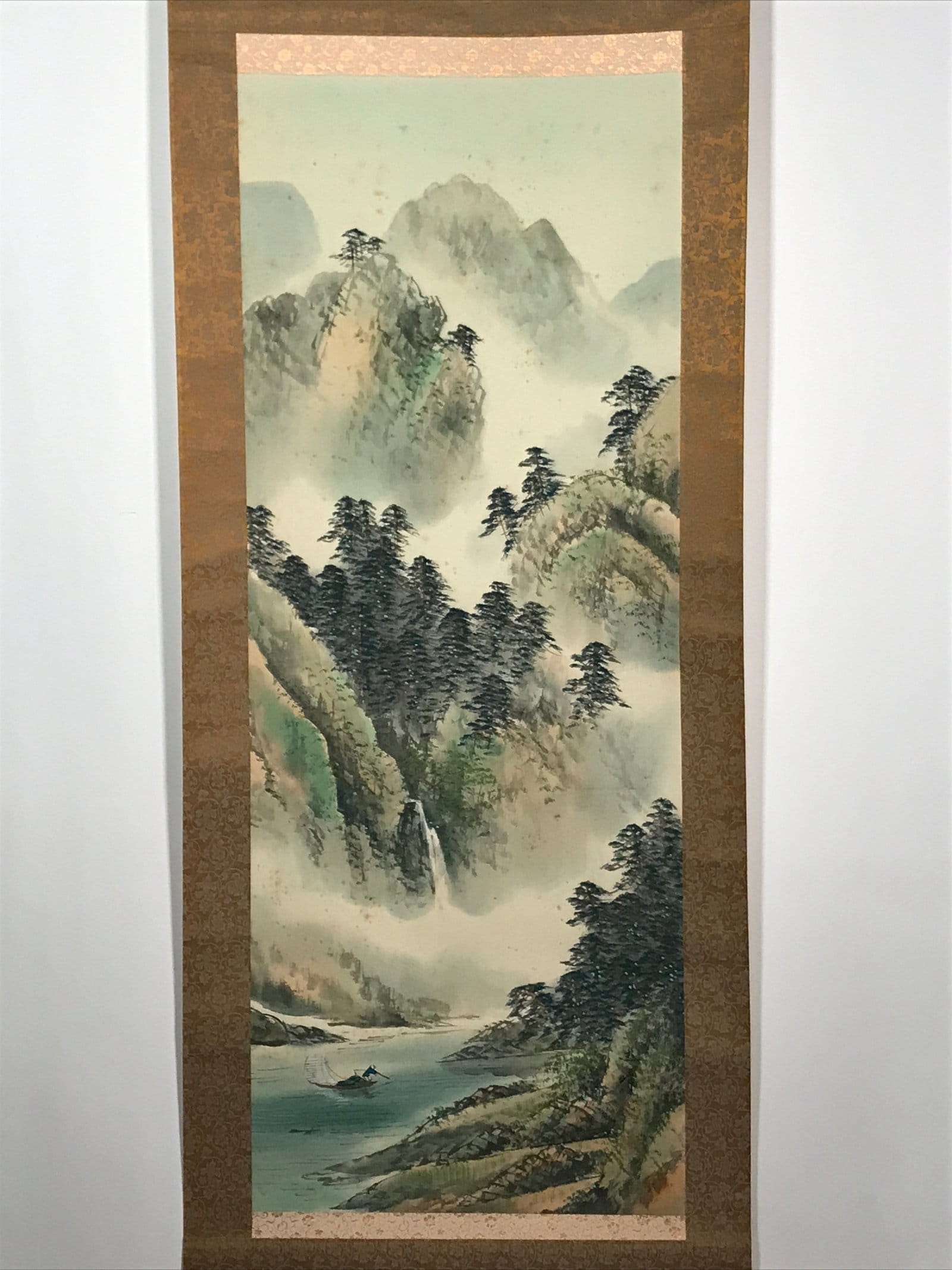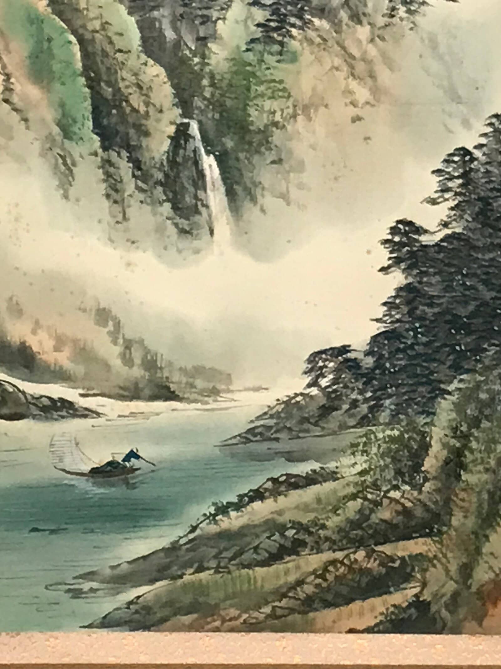 This is a vintage Japanese hanging scroll (kakejiku or makimono) representing mountains and a river. The mountains are topped with trees and a small boat with a human fishing is depicted on the river. Between the mountains and the river flows a waterfall. This kakejiku is painted with green and blue tones, making it a colorful yet harmonious piece. This piece is not signed.