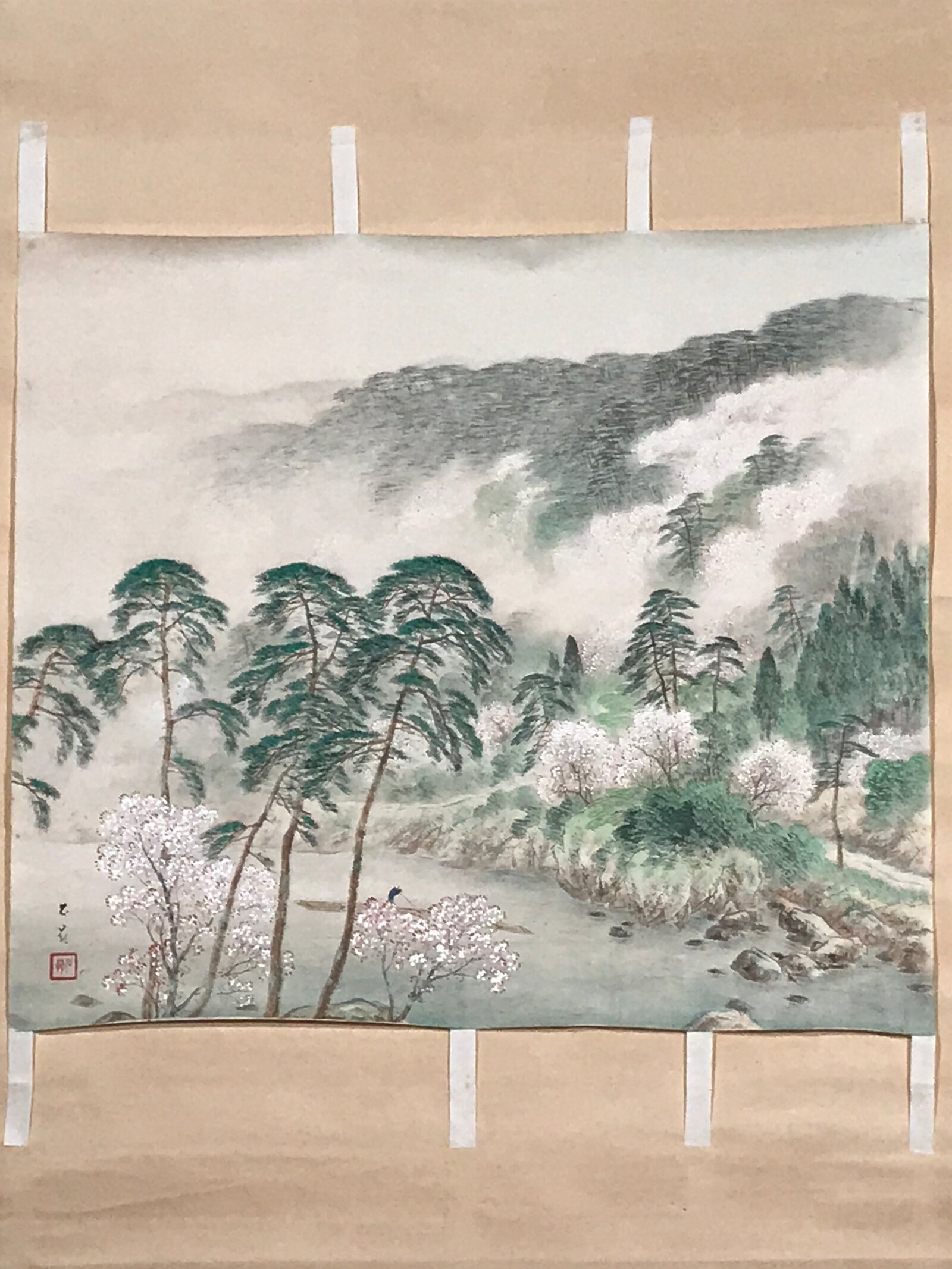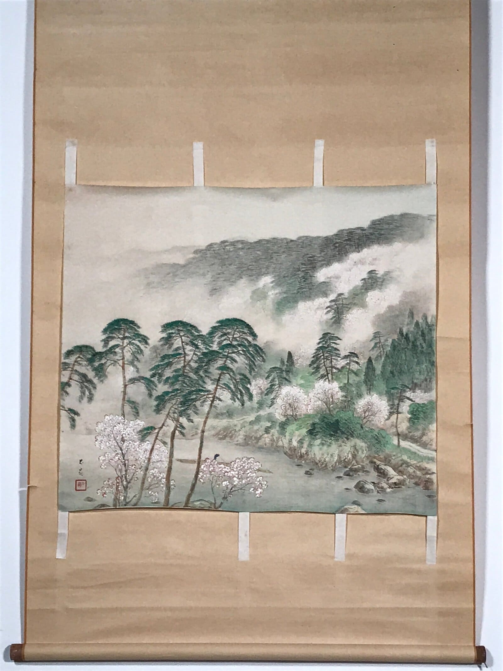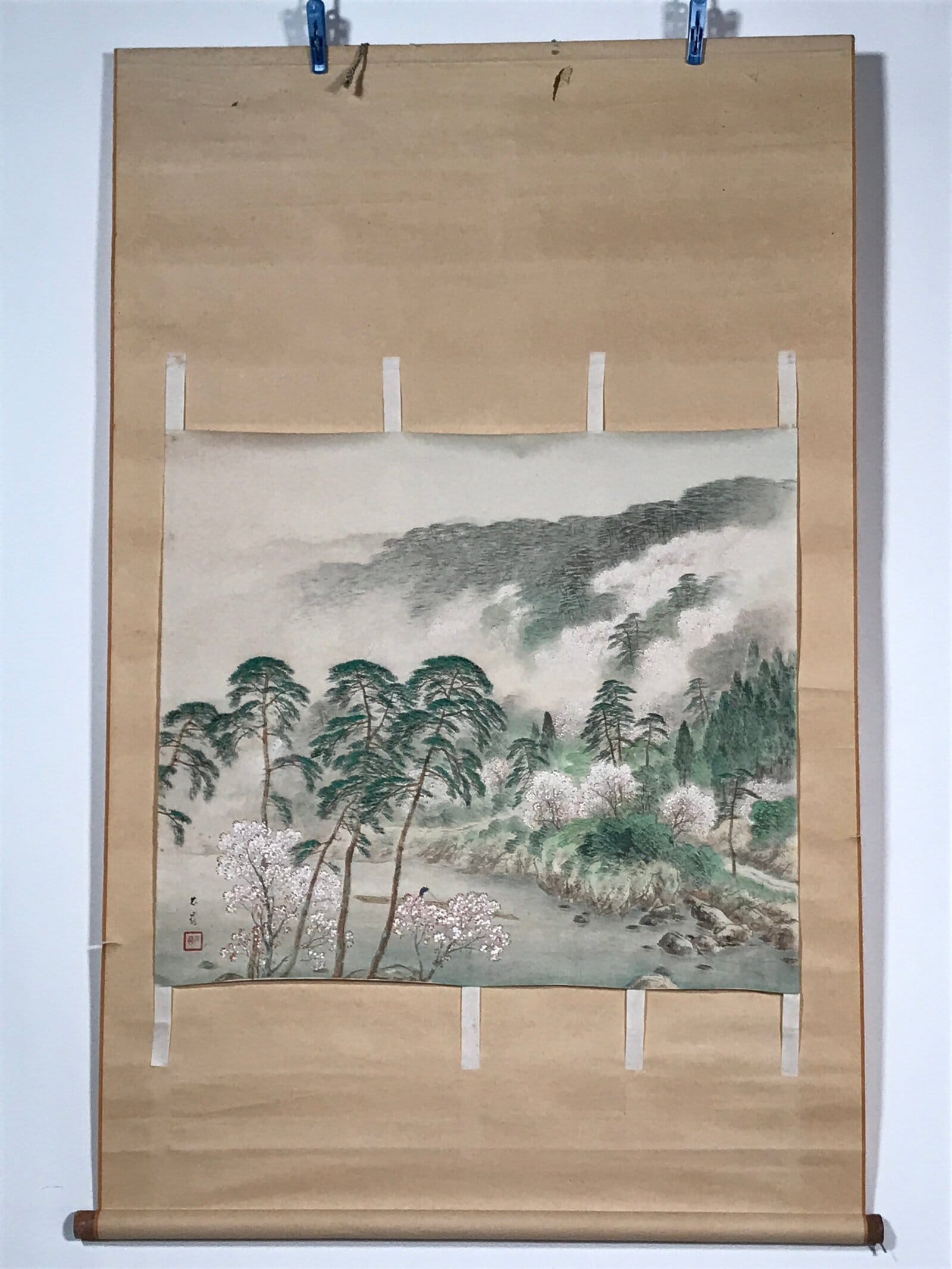 This vintage Japanese hanging scroll (kakejiku or makimono) features a landscape with mountains in the background and a river with a man on a boat in the foreground. Several types of trees are pictured, one is blooming. It is a classic sansui (literally mountains and water) theme. This scroll is signed with a name and a red seal.