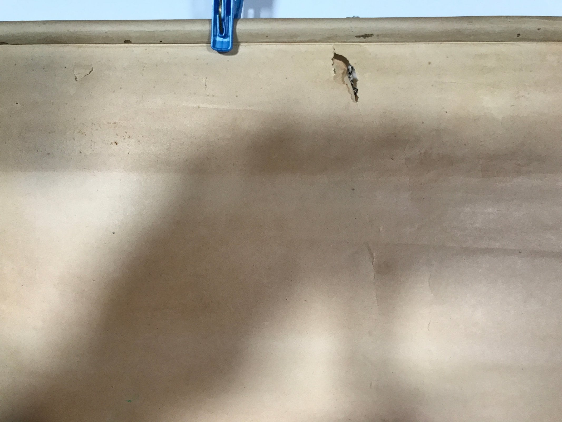 - Good condition considering its age. Picture is attached. Large tear on top right (not shown in photos, on back of paper only, not on the main image). Small hole on the top. String damaged. Wear and tear due to age. Please see the photos.
