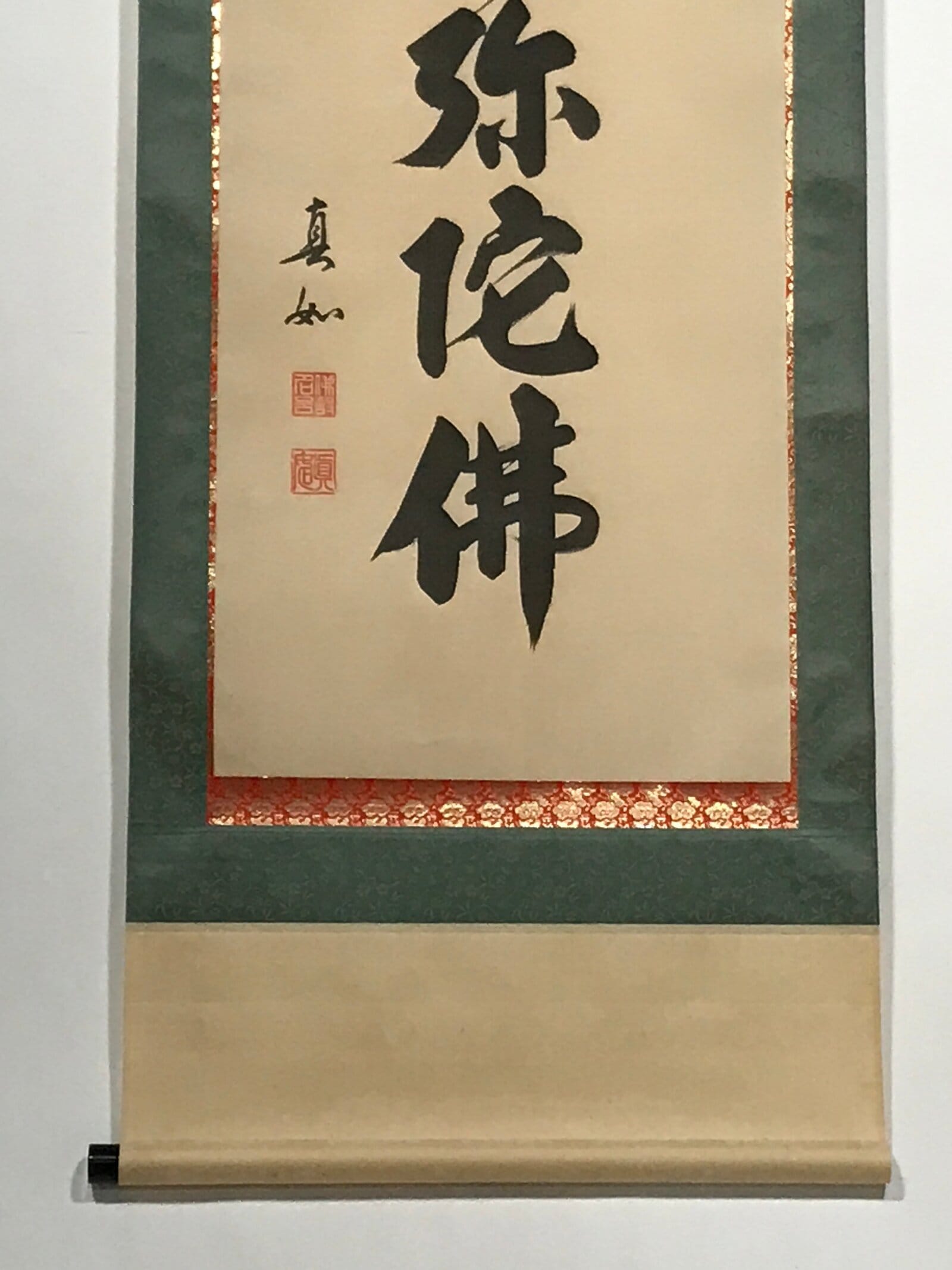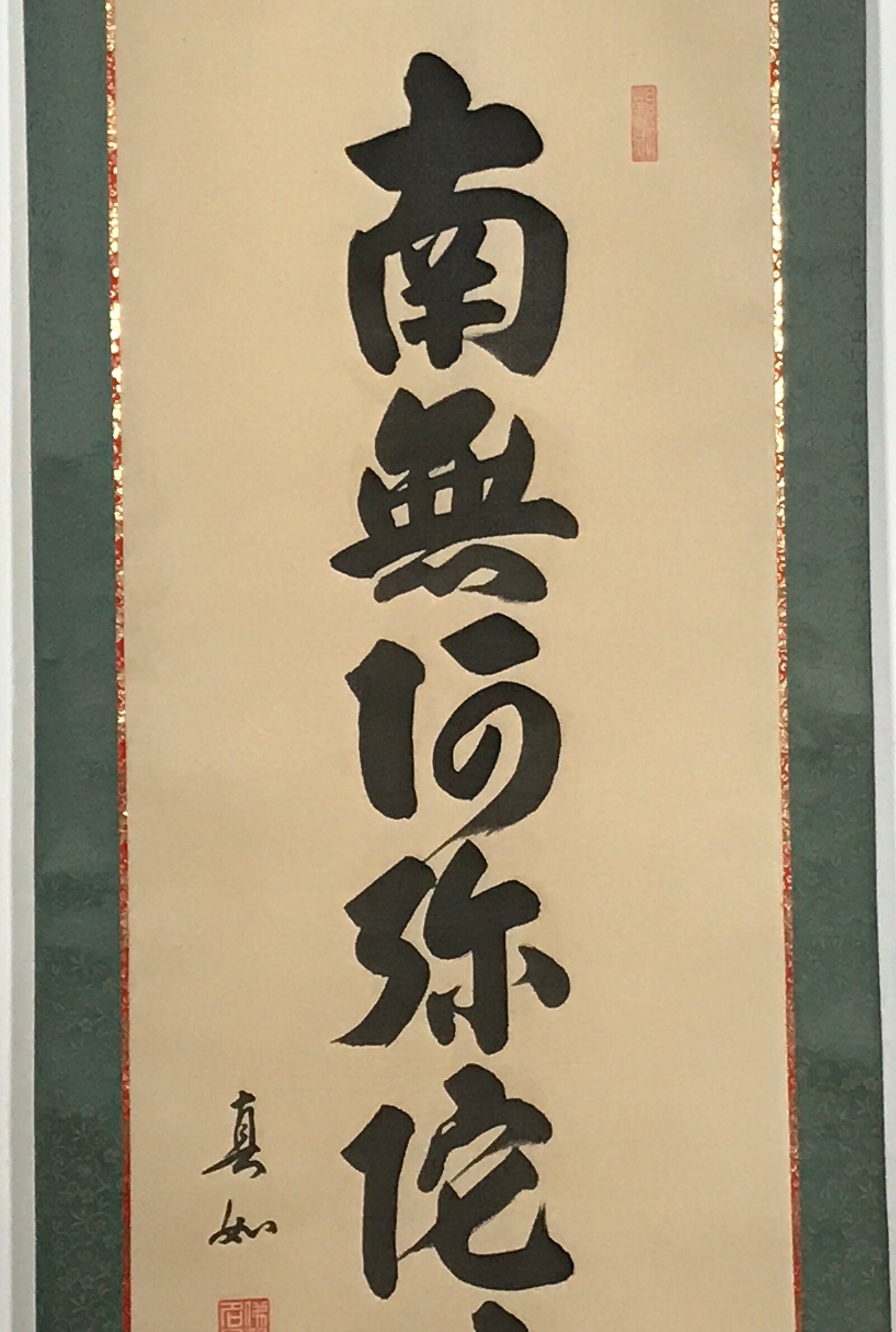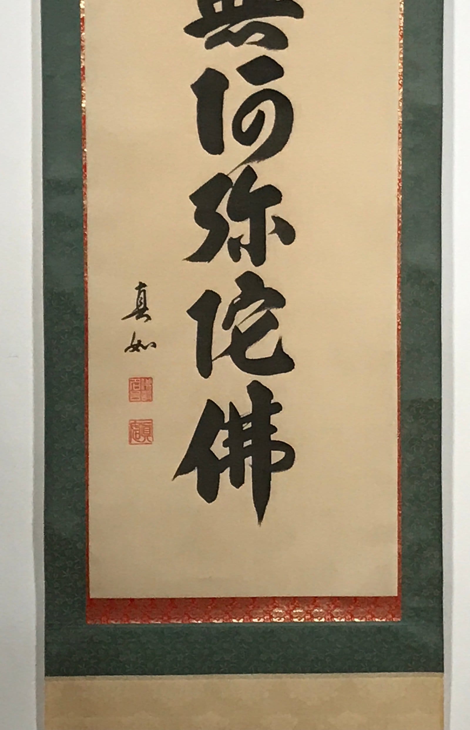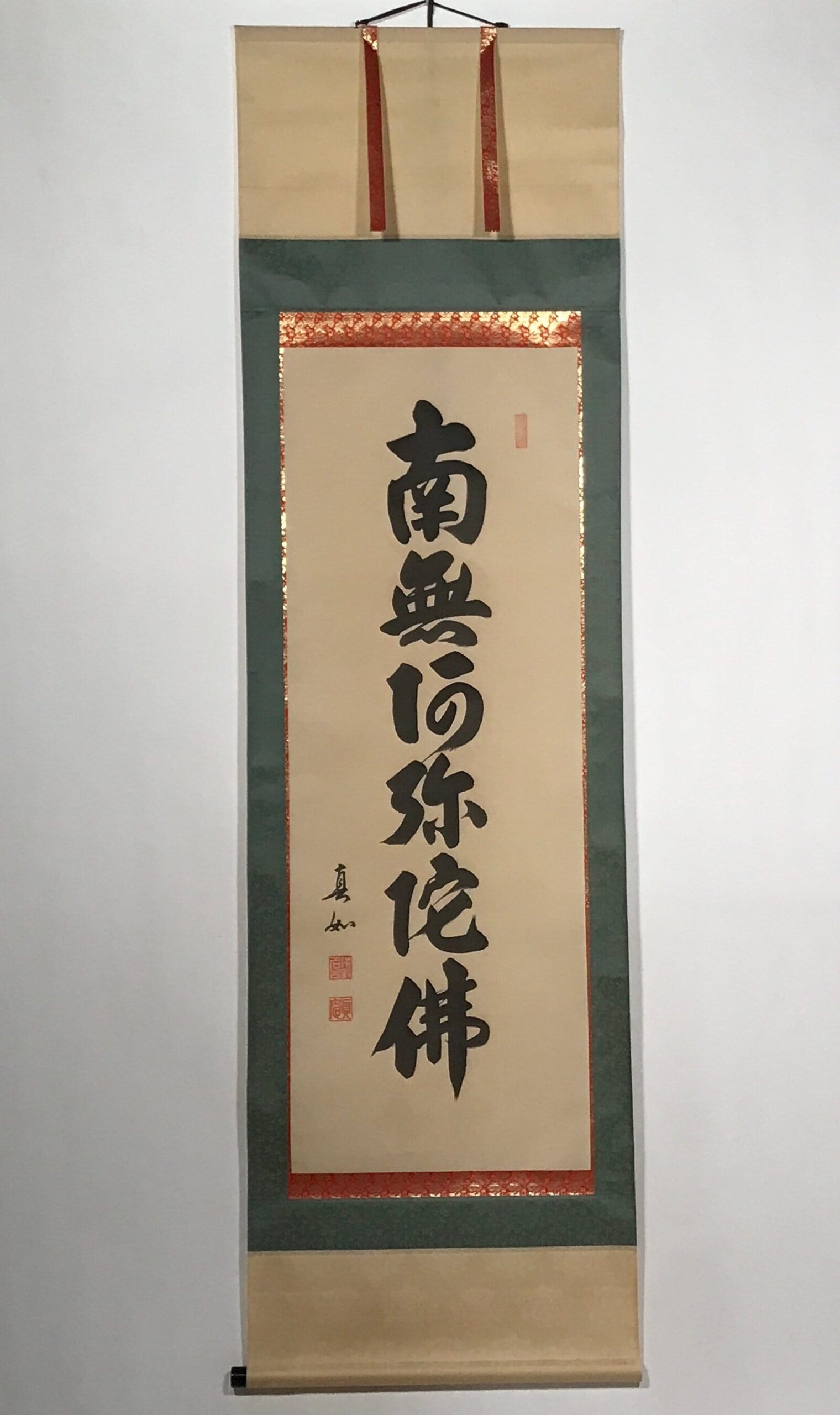This vintage Japanese hanging scroll (kakejiku or makimono) is a calligraphy of the Buddhists phrase Namu Amida Butsu written vertically. It has a double border: first red and gold, then dark green. It is signed and has red seals.