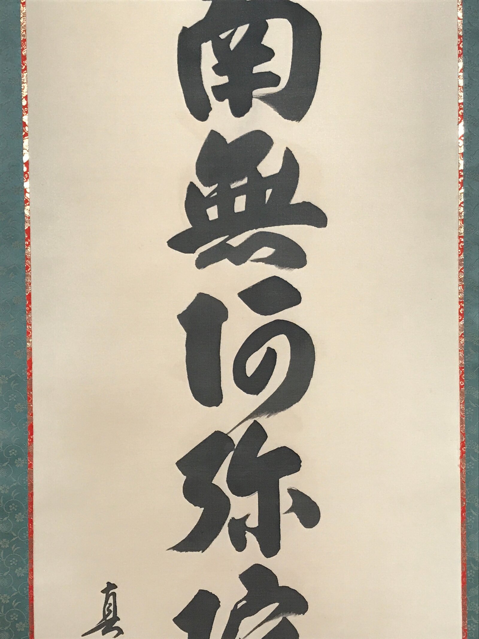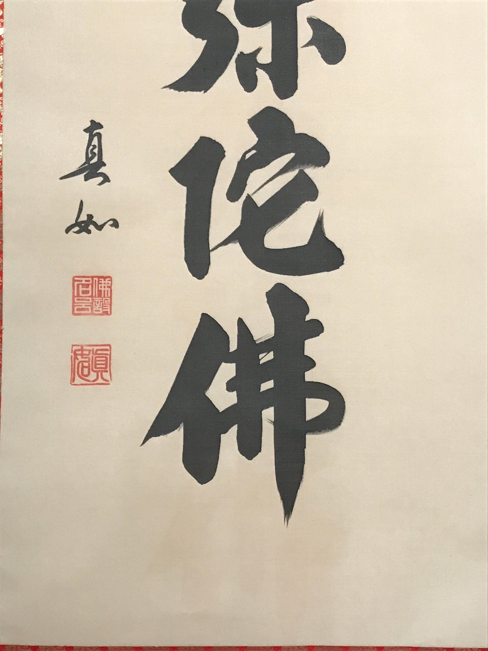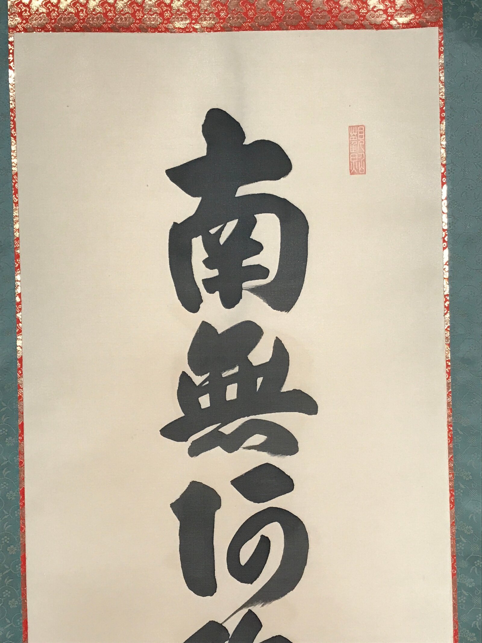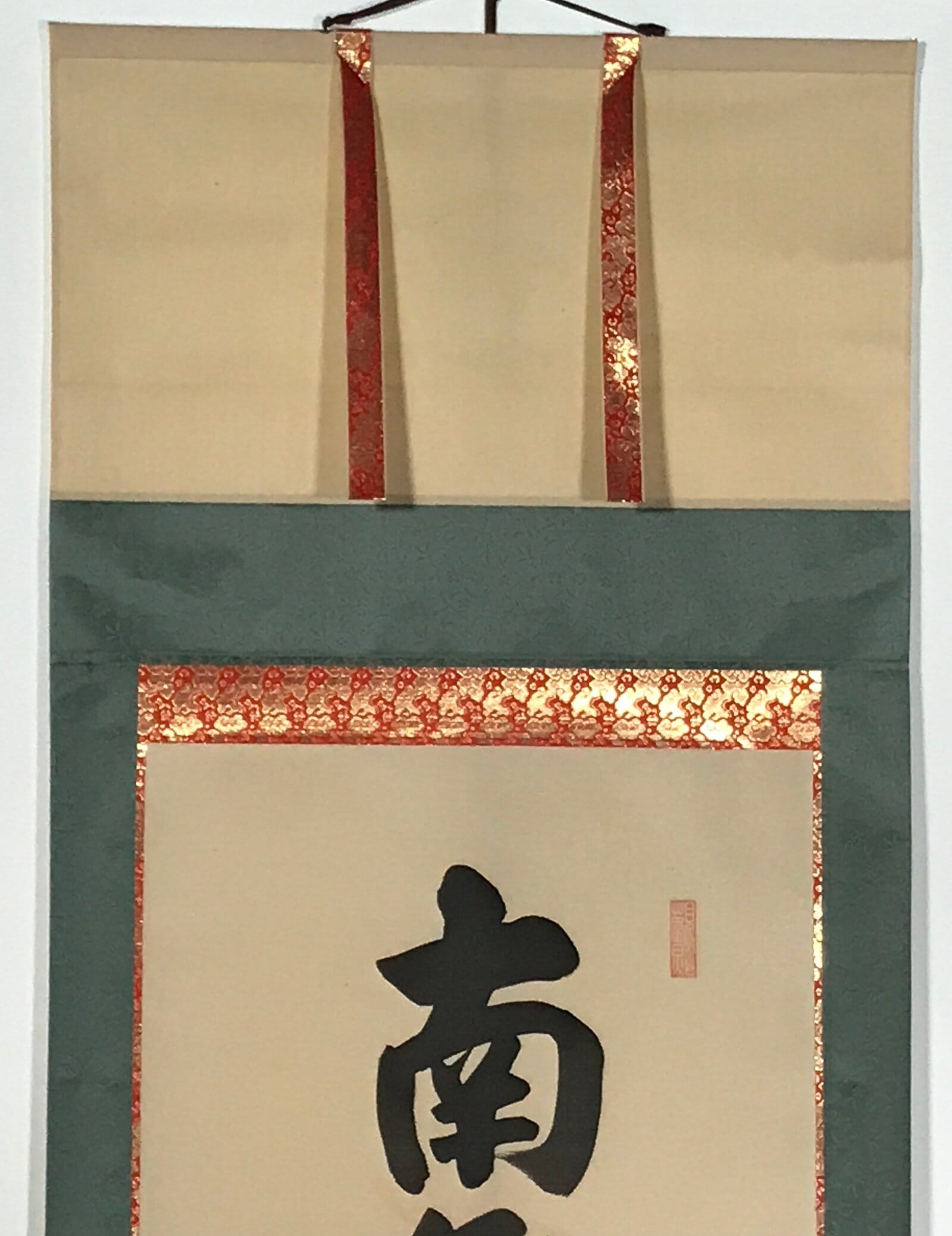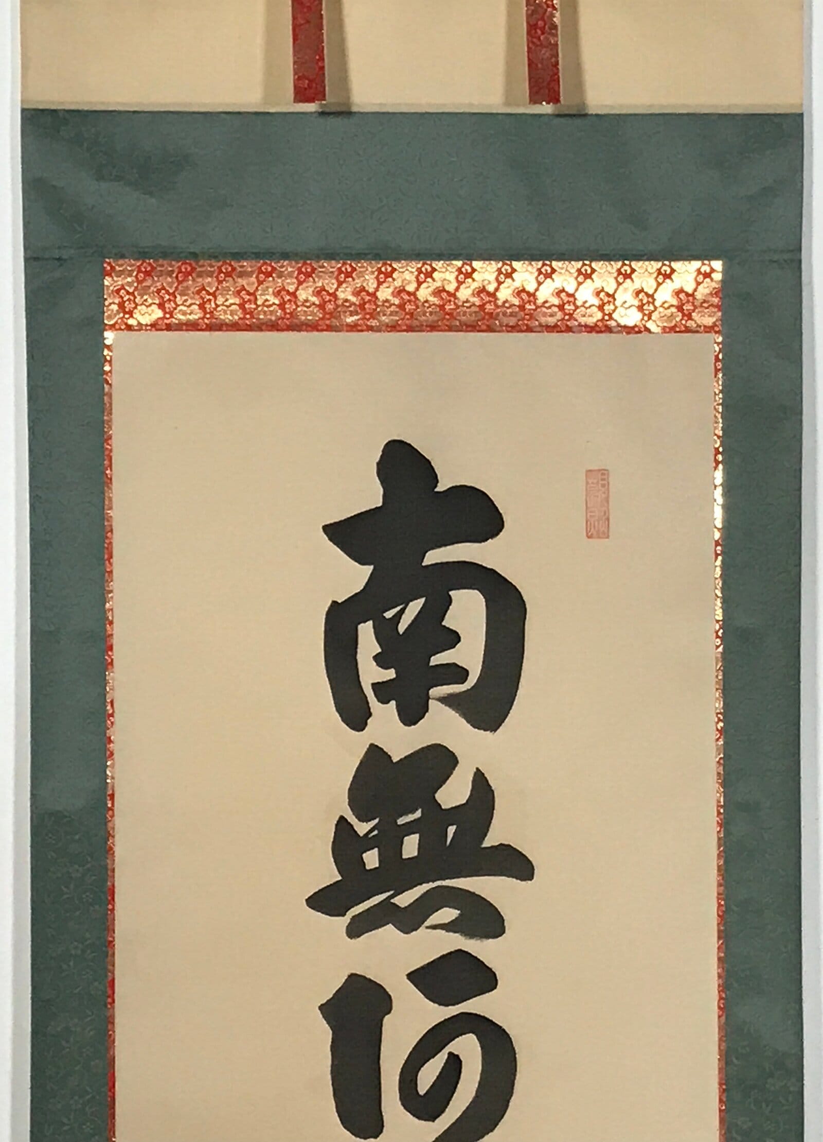 This vintage Japanese hanging scroll (kakejiku or makimono) is a calligraphy of the Buddhists phrase Namu Amida Butsu written vertically. It has a double border: first red and gold, then dark green. It is signed and has red seals.