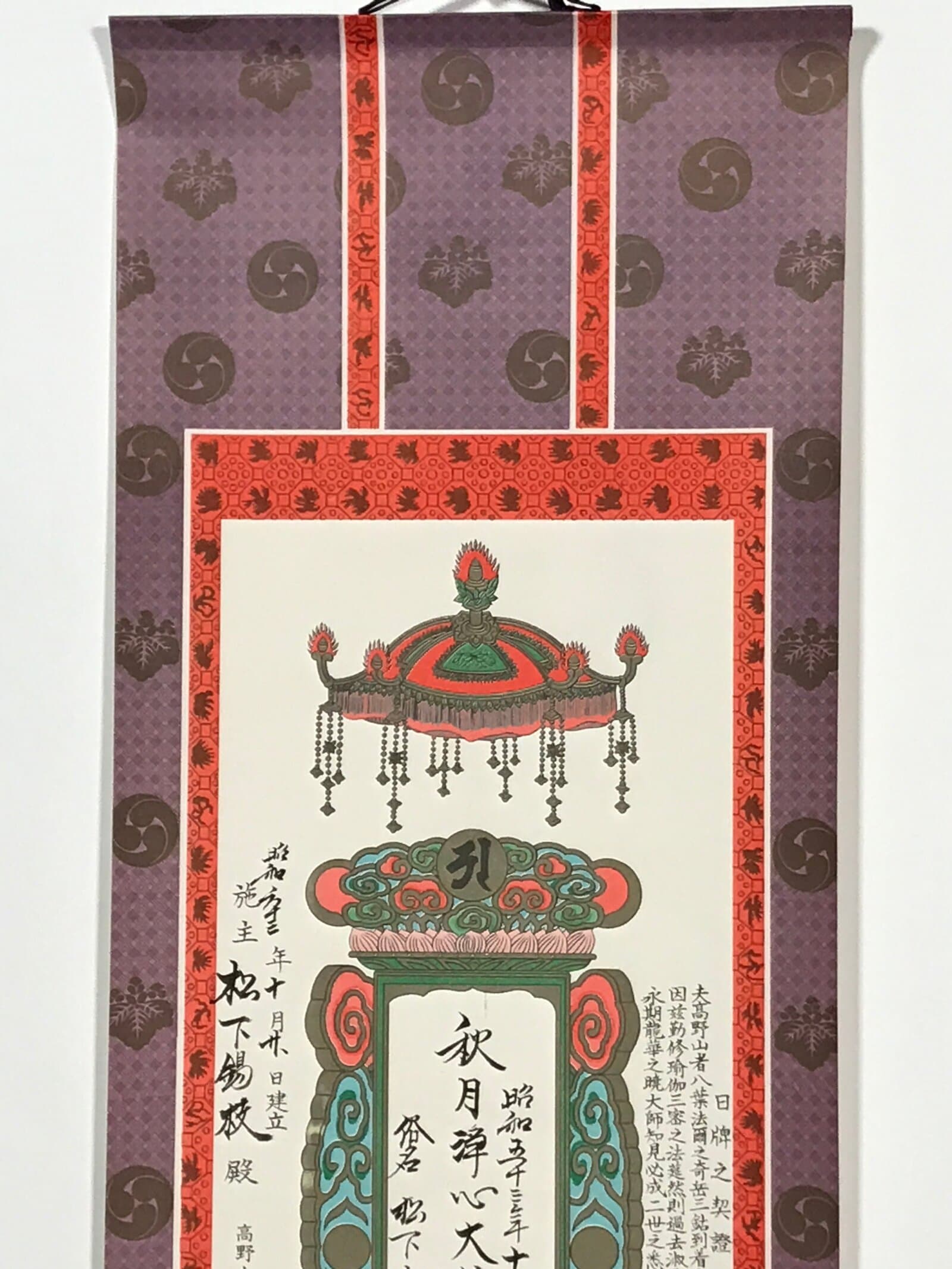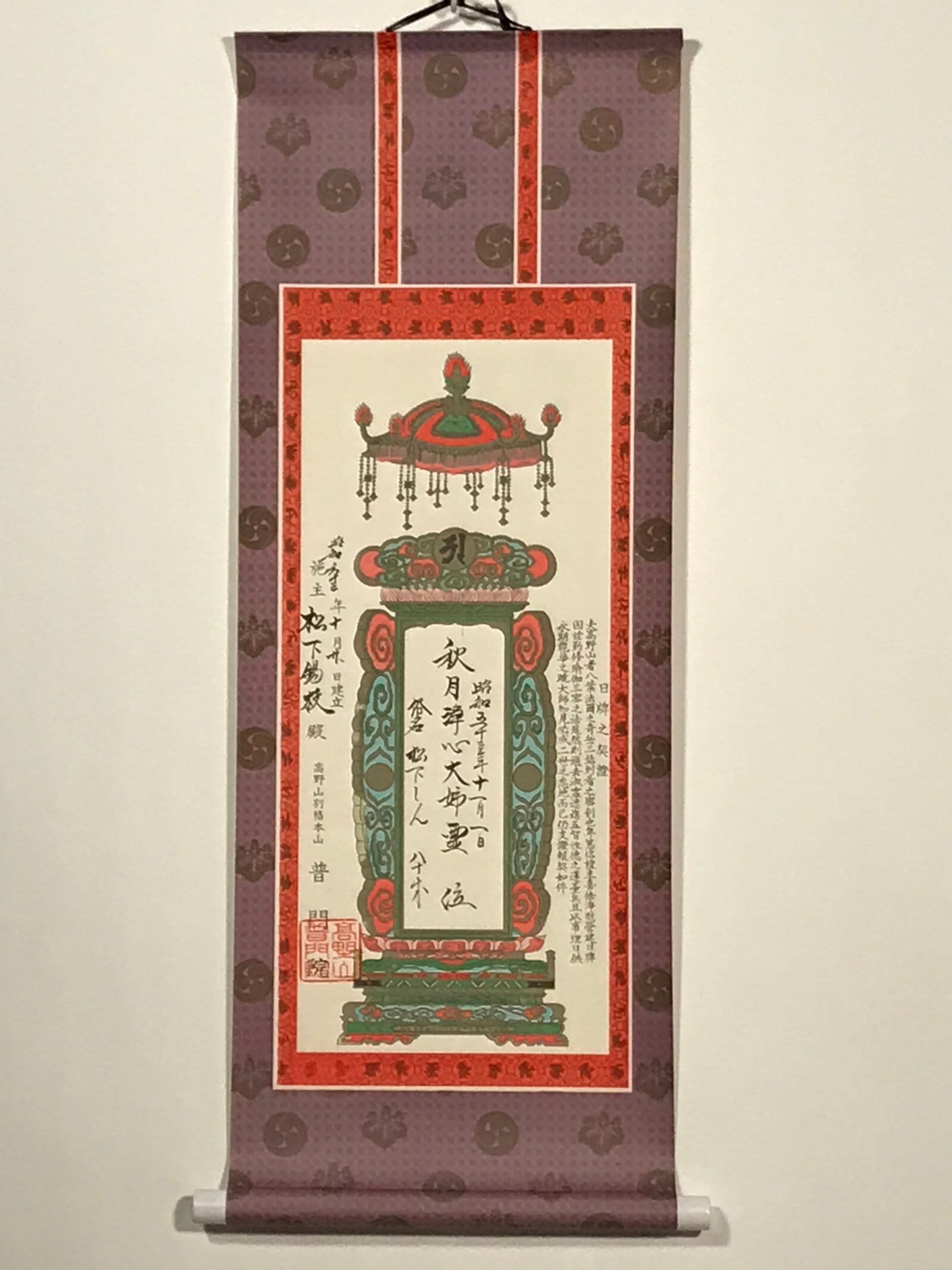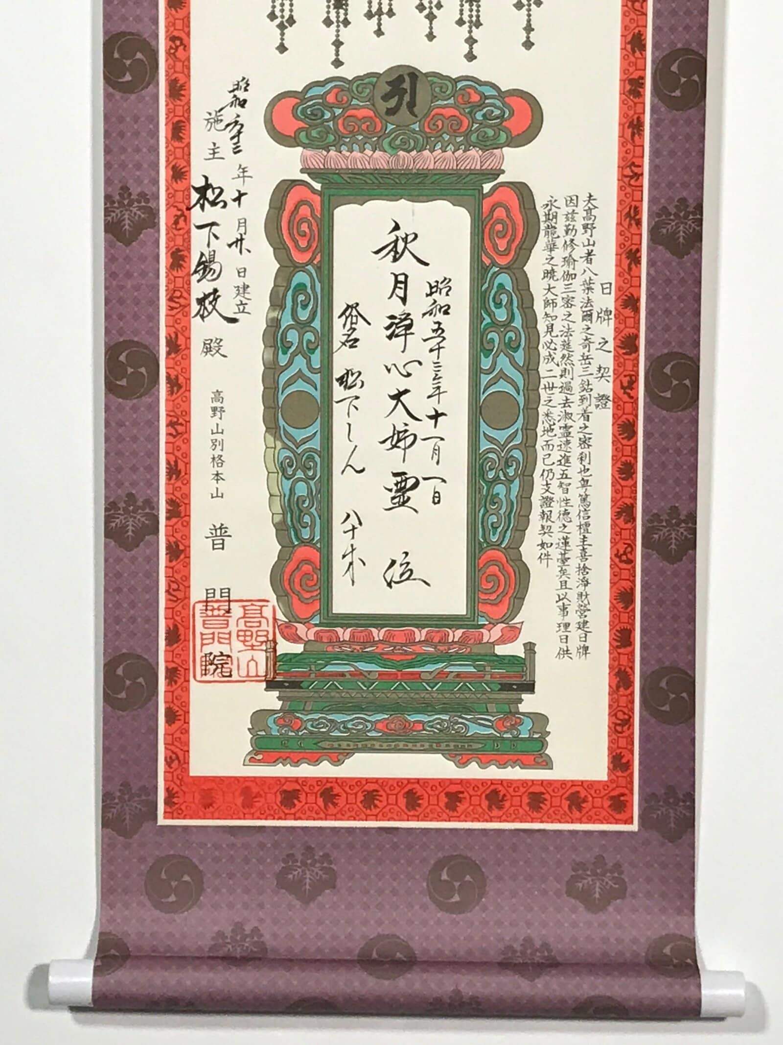 This vintage Japanese hanging scroll (kakejiku or makimono) is a commemorative piece related to funeral rites. It has the name of the related temple as well as dates. This piece is signed with a red seal. It is stored in a paper box.