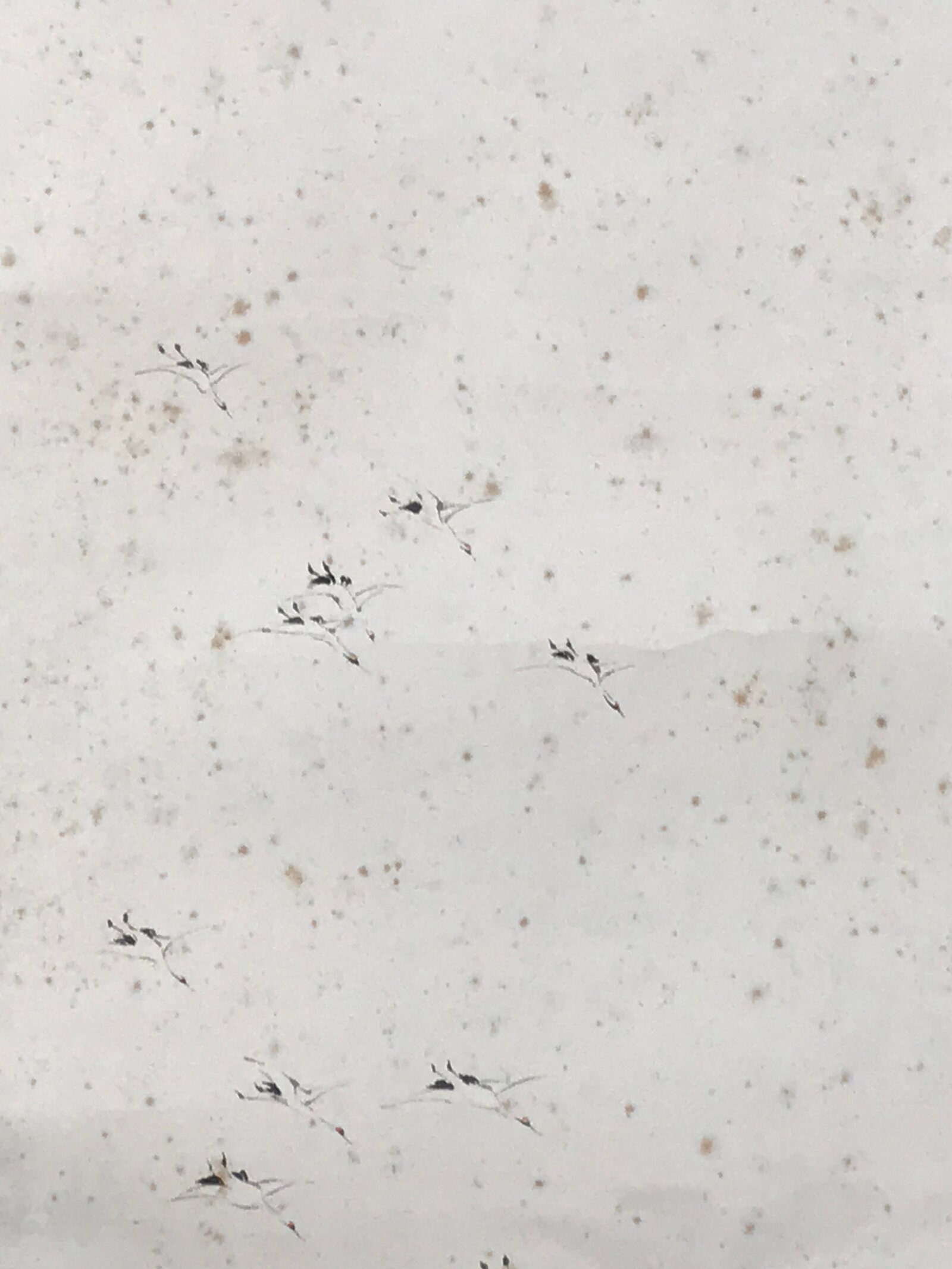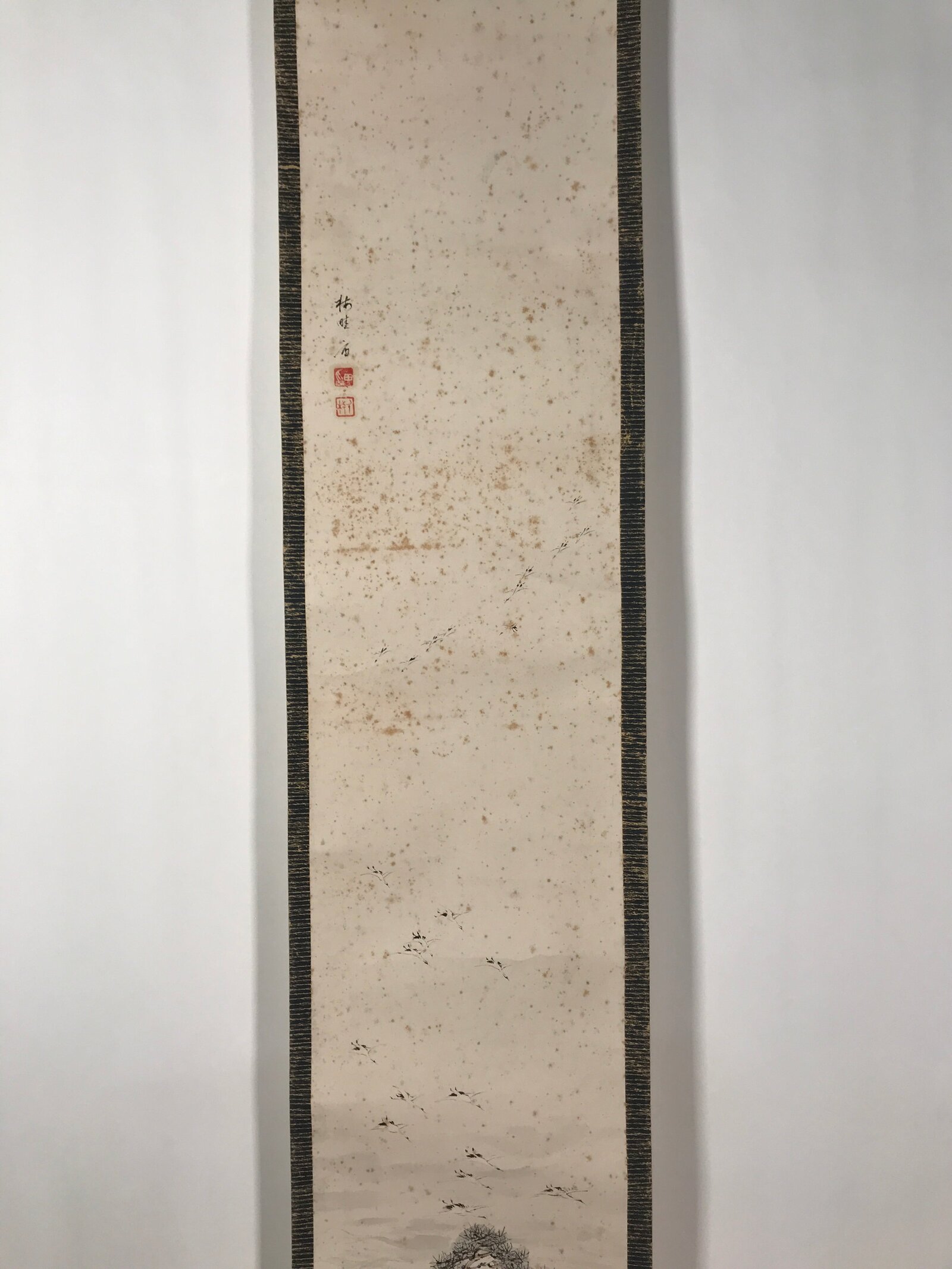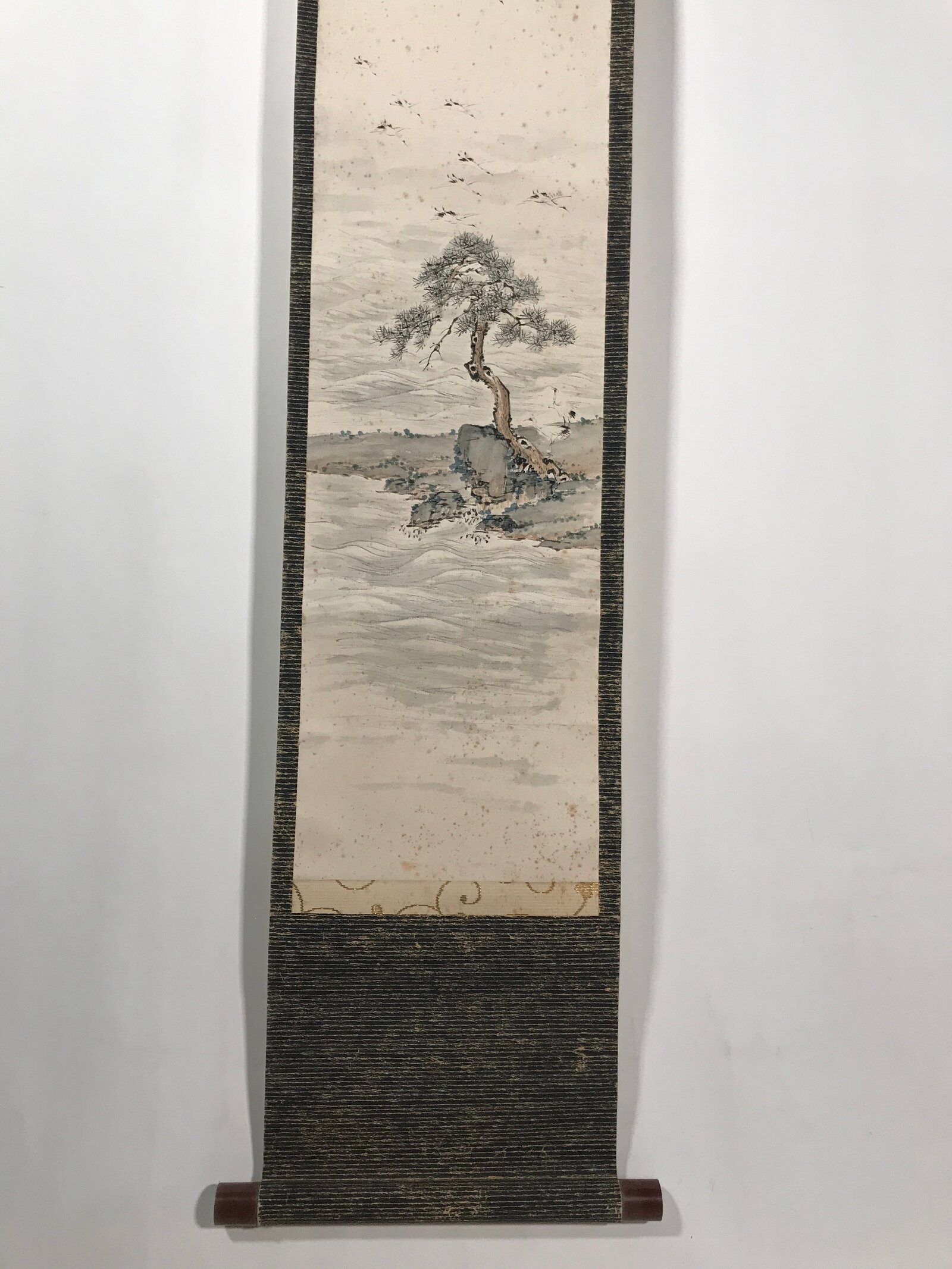 This vintage Japanese hanging scroll (called kakejiku or makimono) features a solitary pine tree, matsu in Japanese, with several birds, likely cranes (tsuru in Japanese). Some of the bords are flying in the sky. This scroll is painted in color. This piece is signed with a name and a red seal.